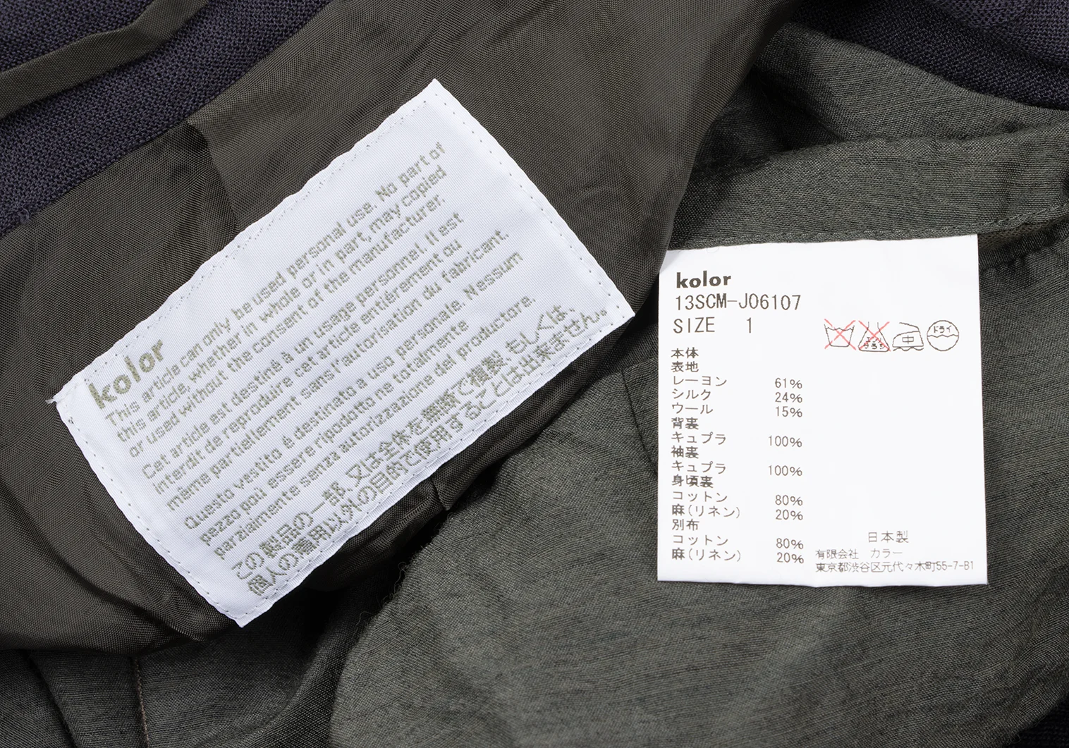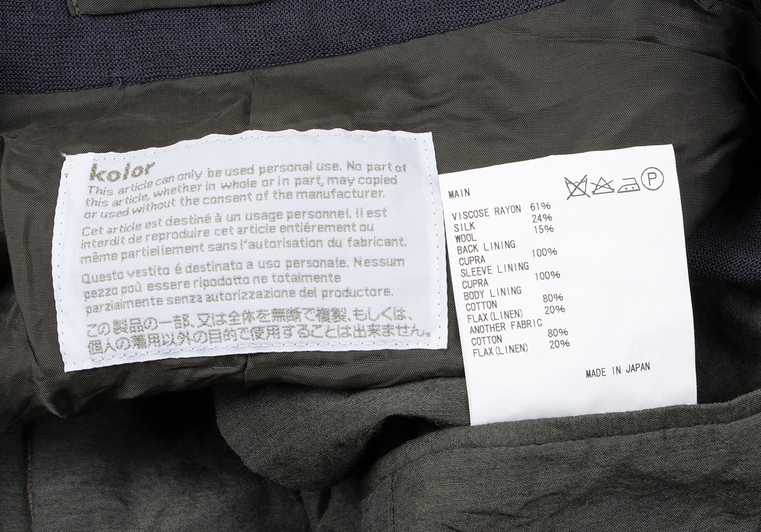 61% Rayon 24% Silk 15% Wool Lining Cupra Another Cotton Linen |