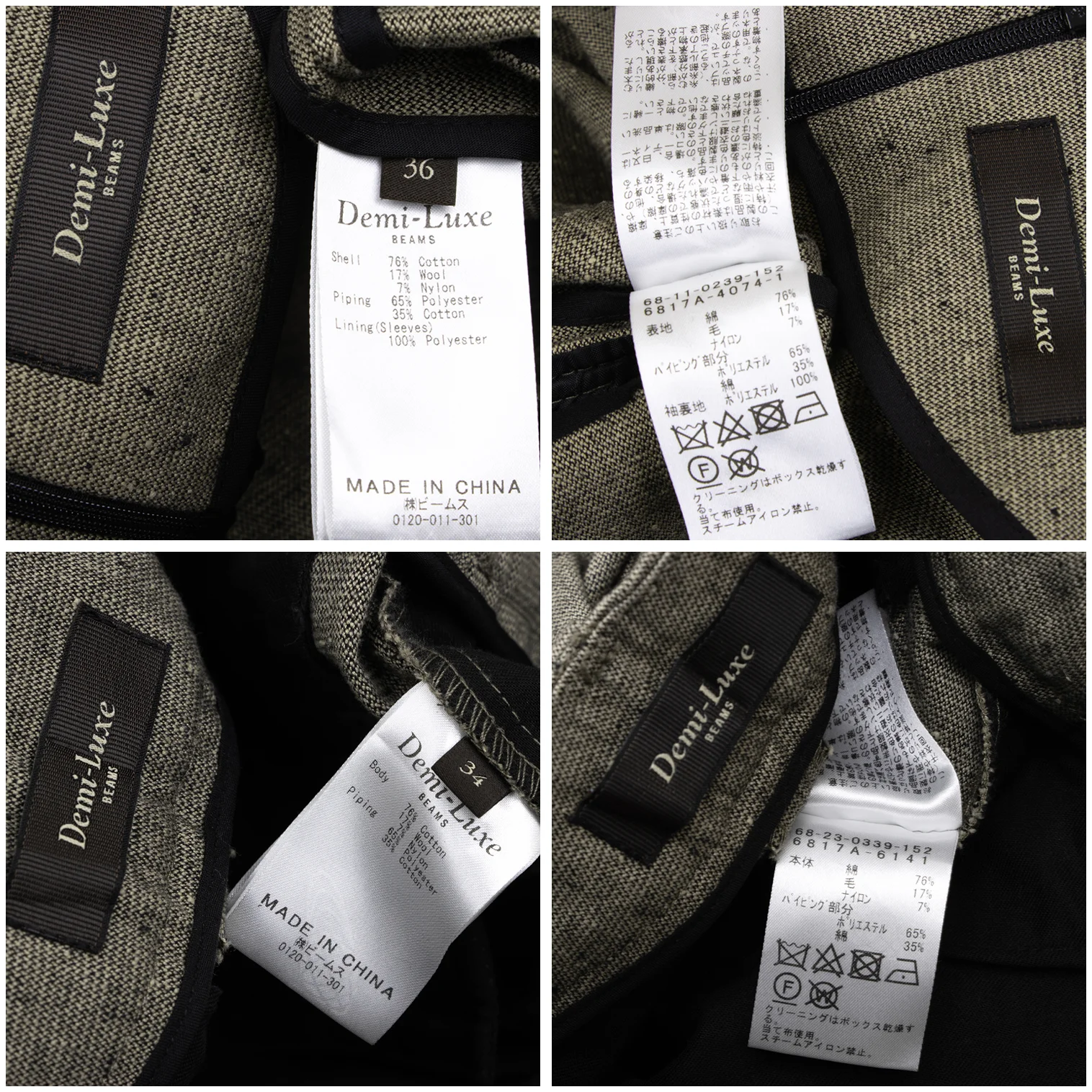 76% Cotton 17% Wool 7% Nylon Sleeve Lining 100% Polyester |