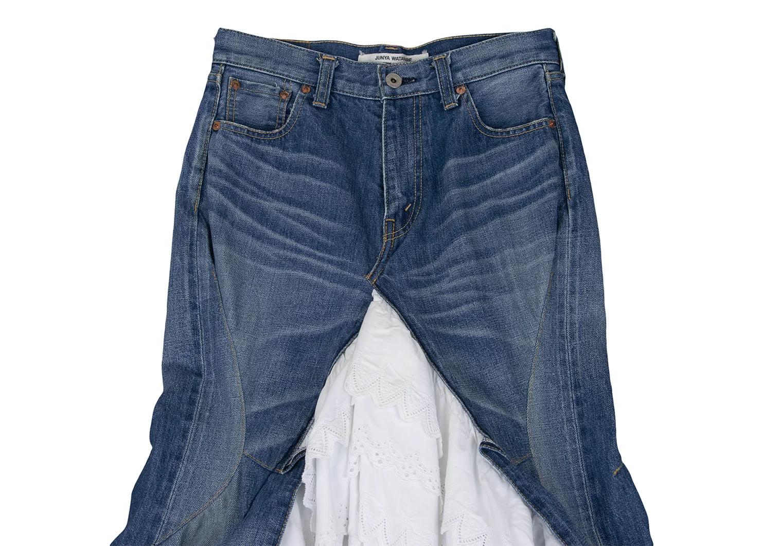 JUNYA WATANABE COMME des GARCONS Embroidered Lace Tiered Denim Skirt Indigo,White XS
