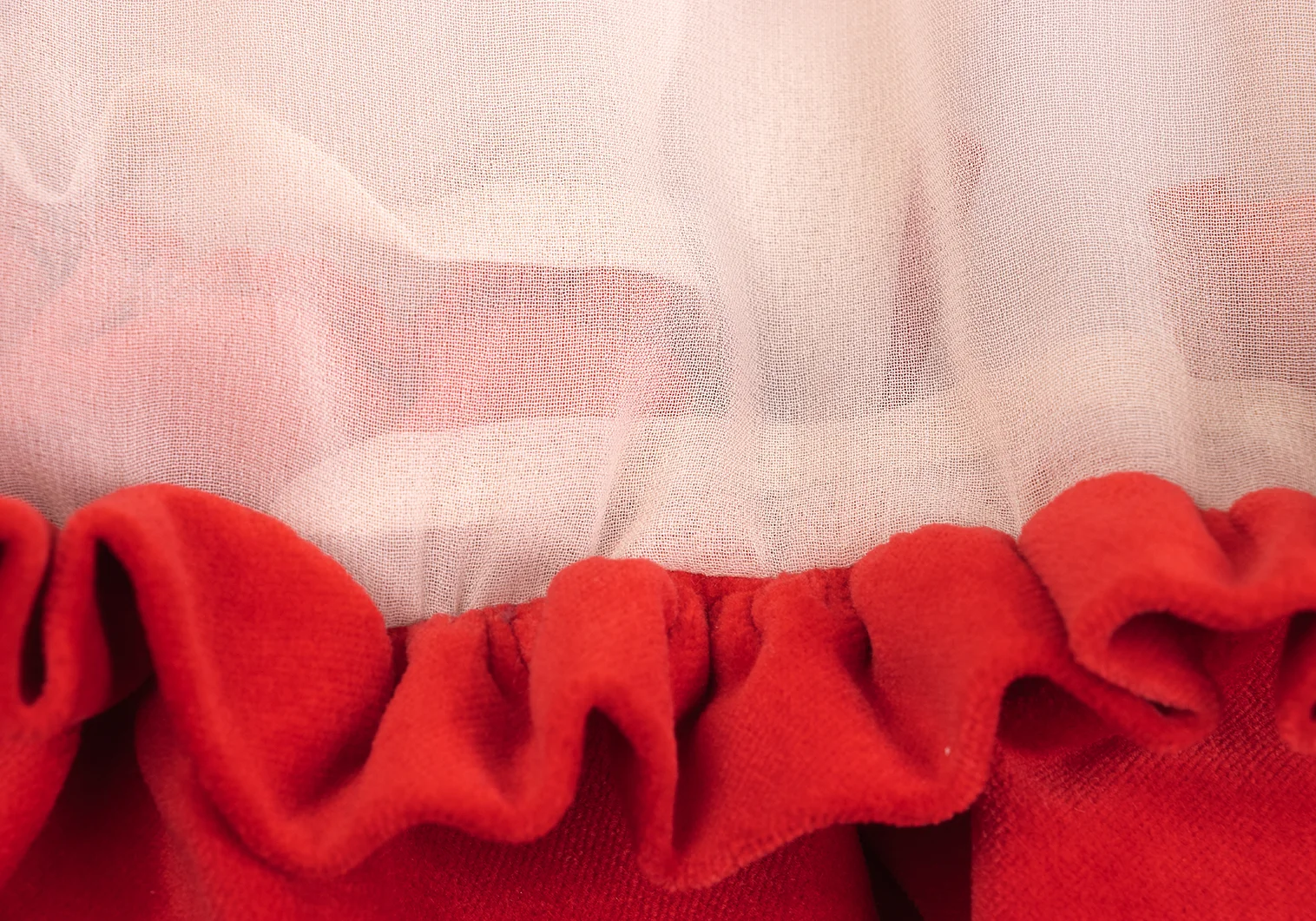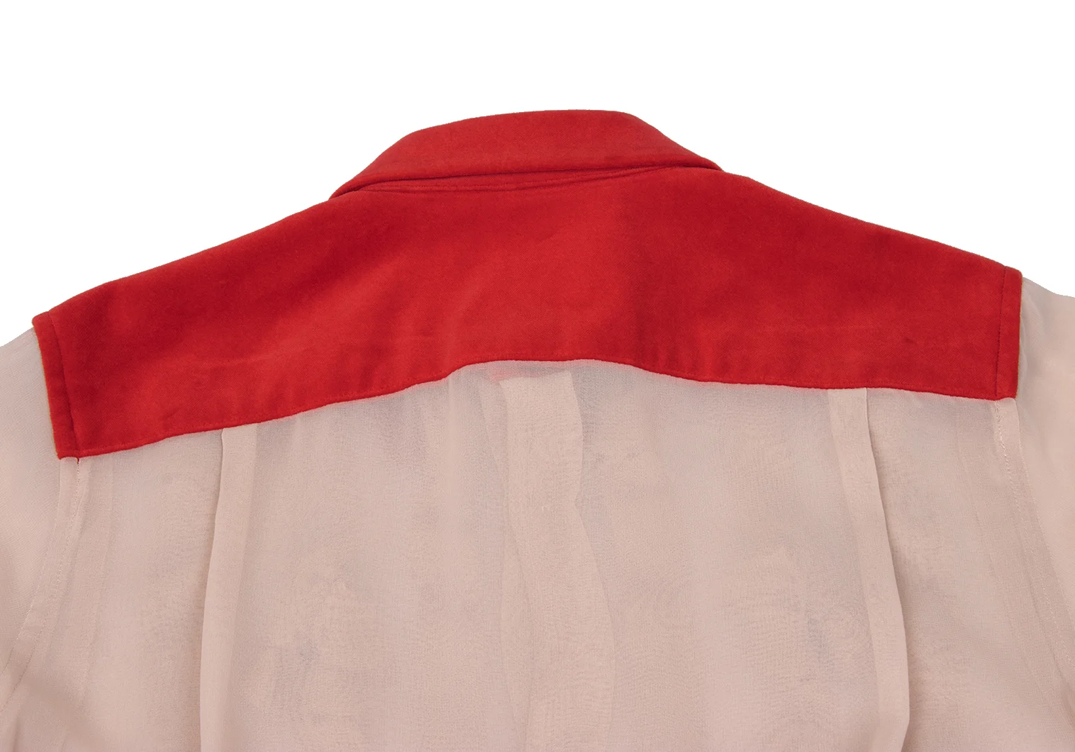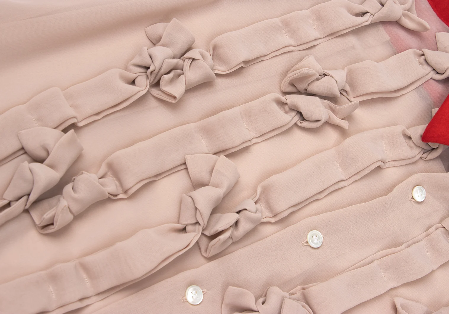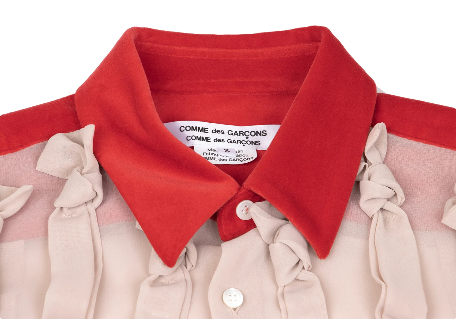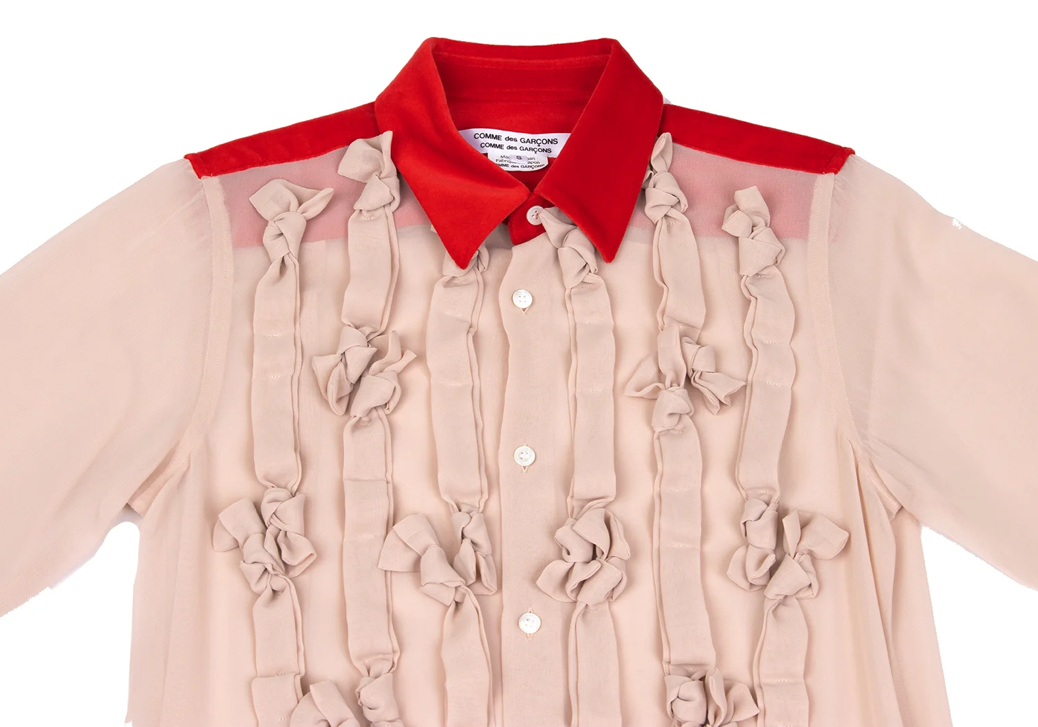 COMME des GARCONS Frilled Velour Switching Knot Tape Embellished Sheer Blouse Red,Beige S