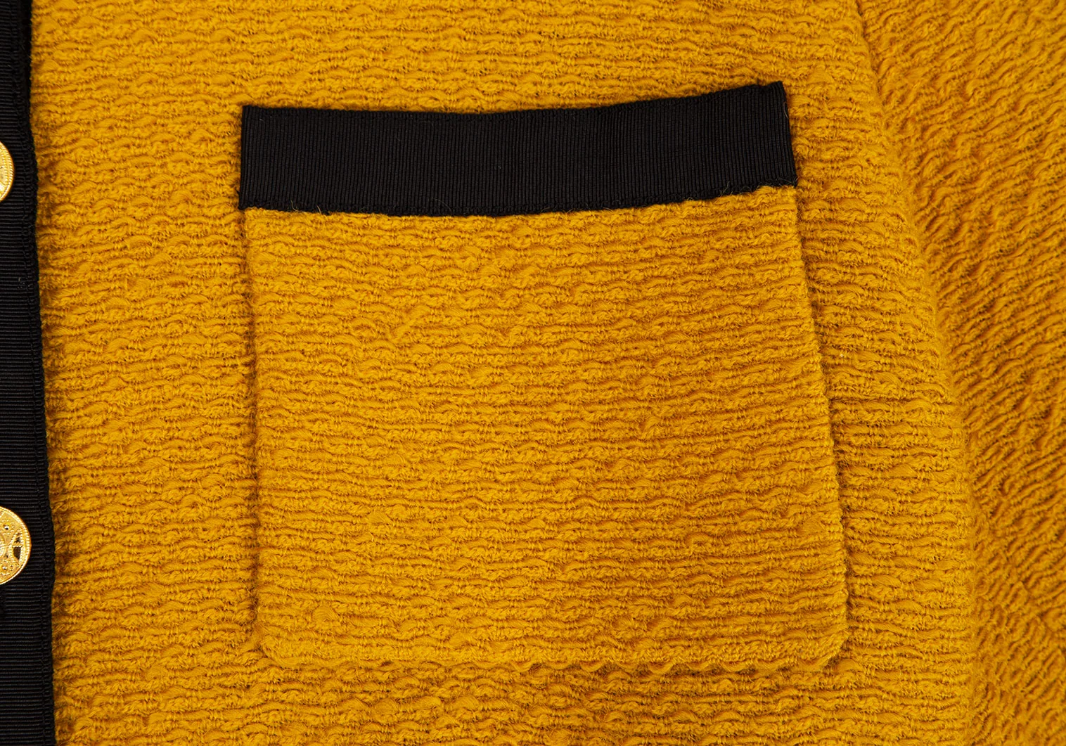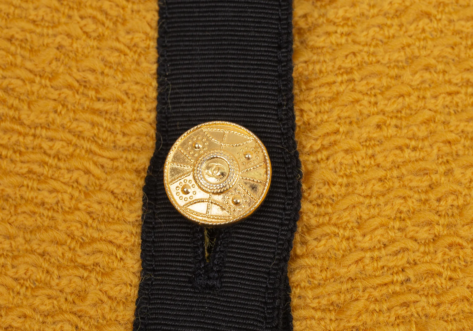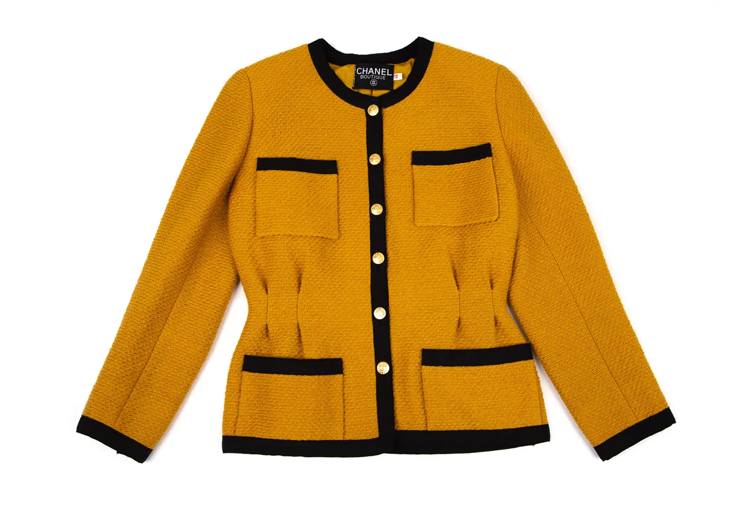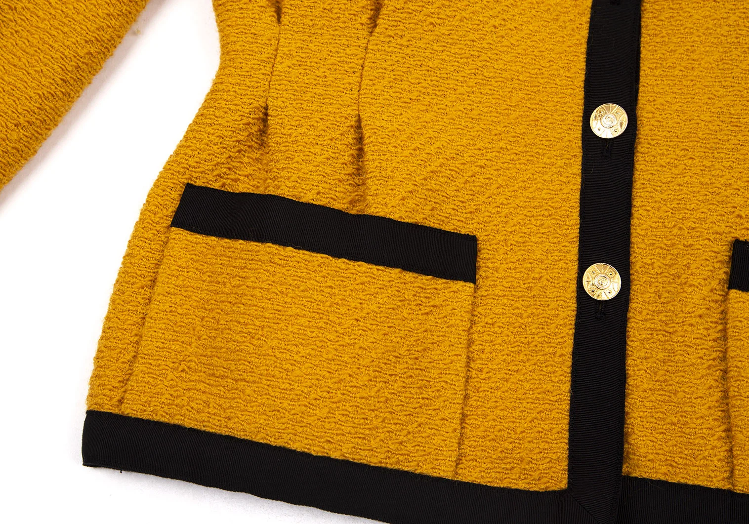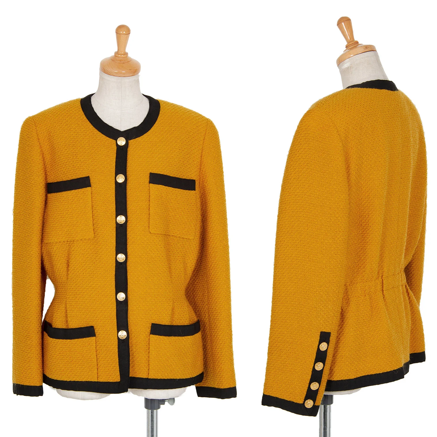 シャネルCHANEL 金ボタンノーカラートリミングツイードジャケット マスタード40