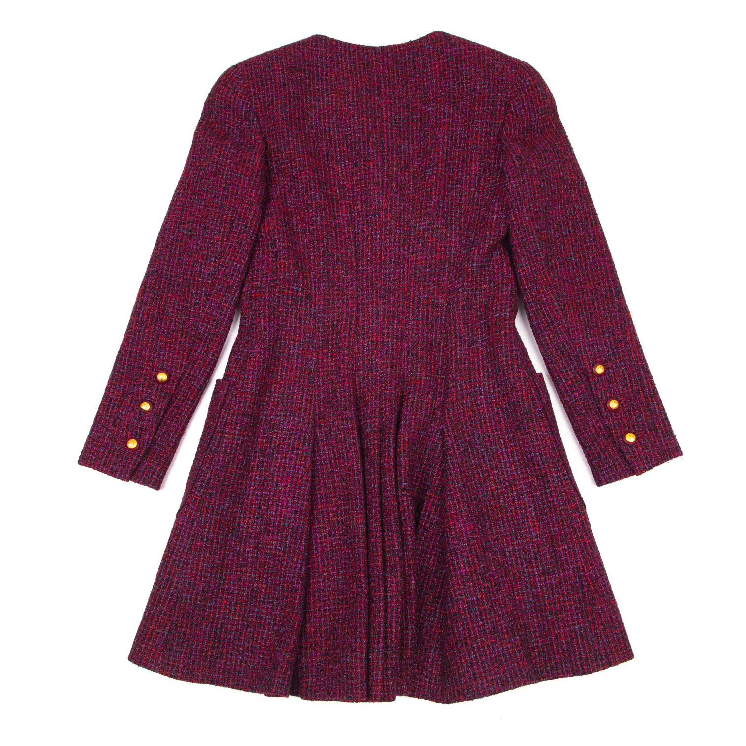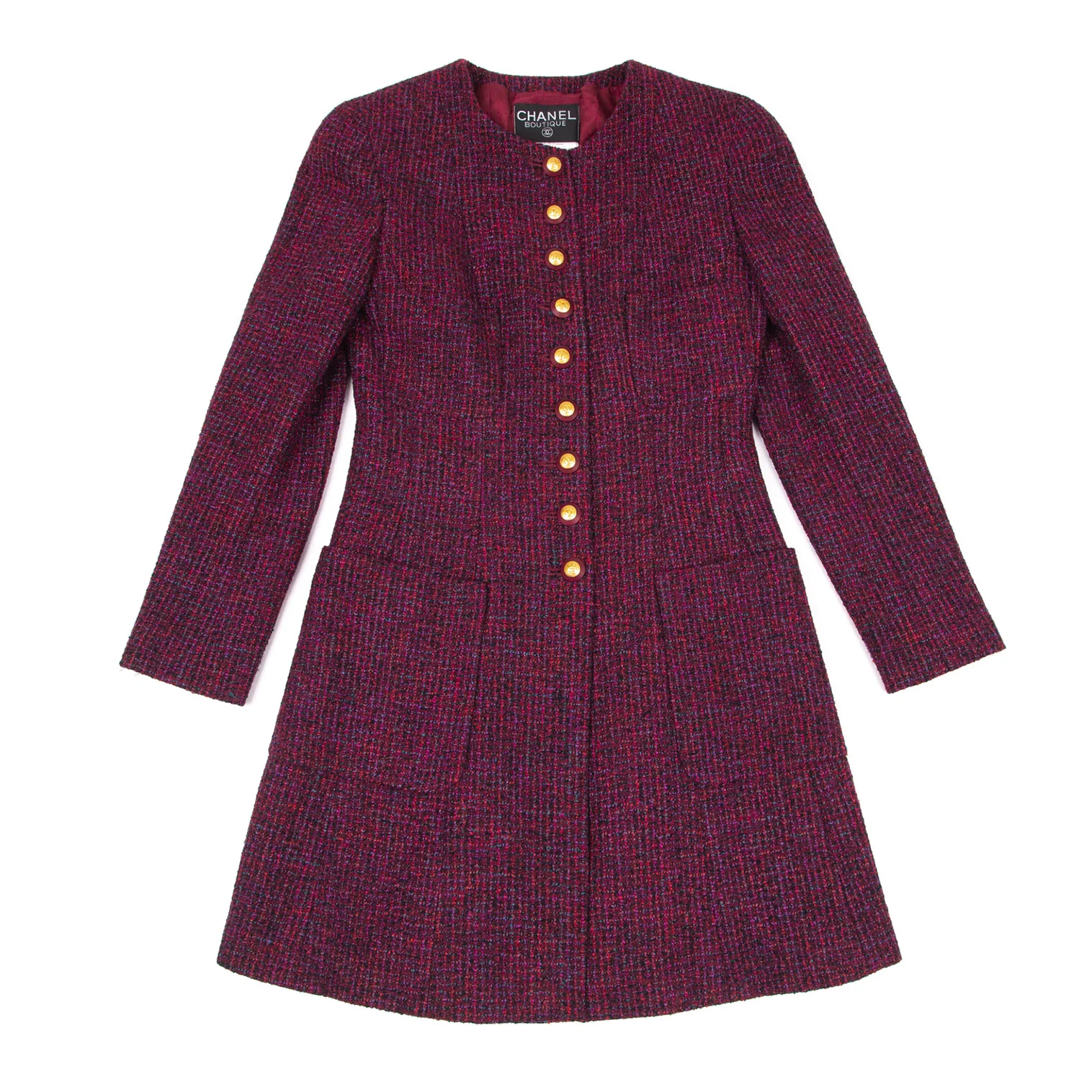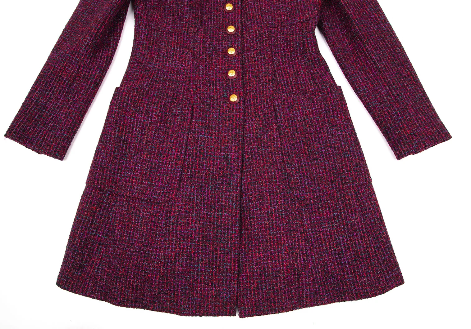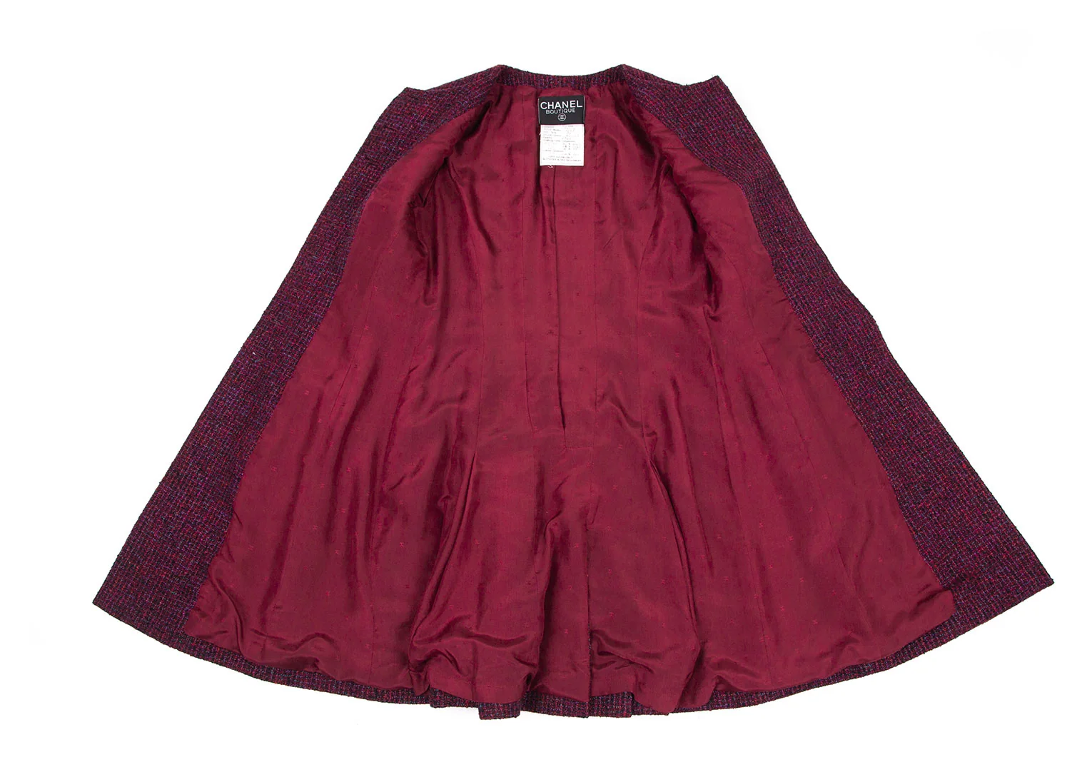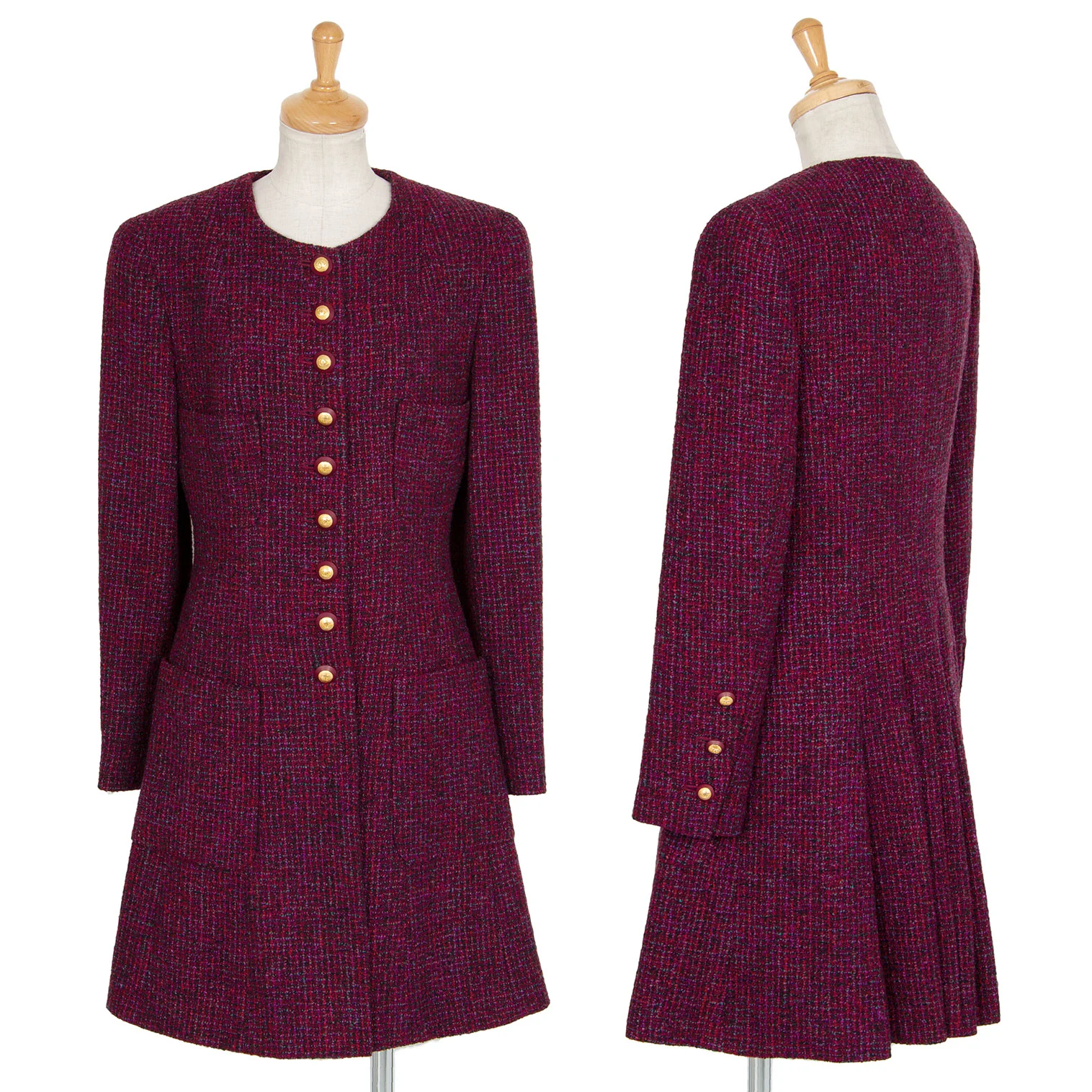 シャネルCHANEL ファンシーツイードノーカラーフレアロングジャケット 赤紫34