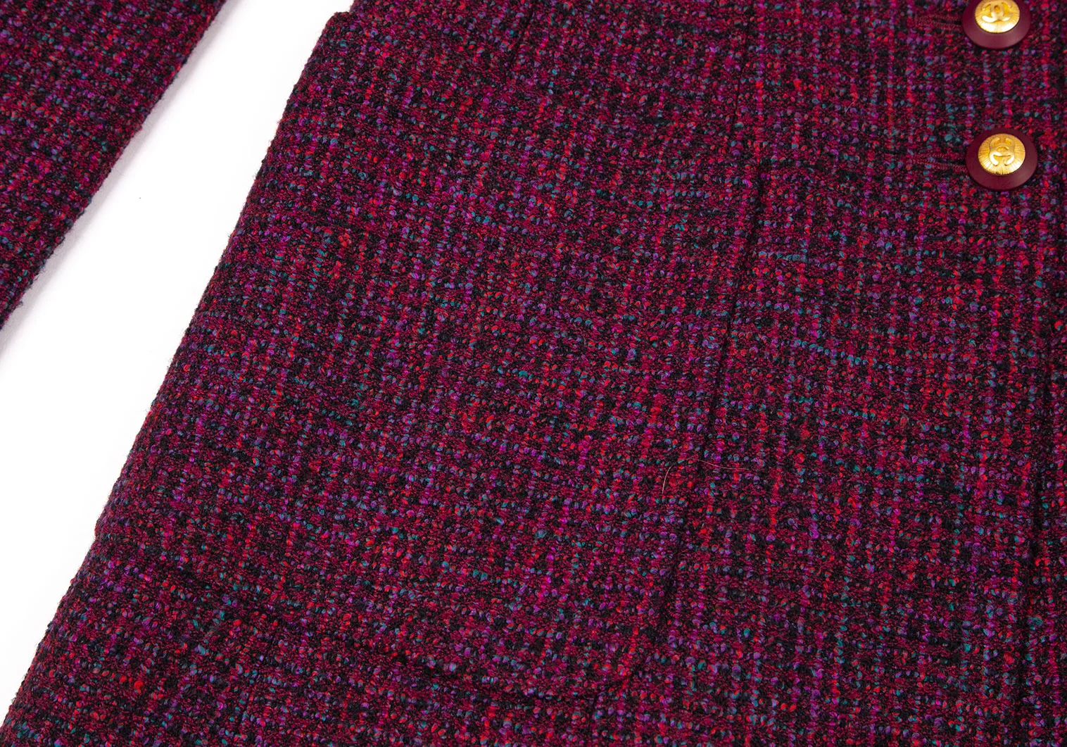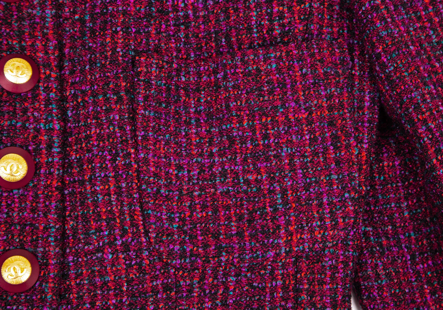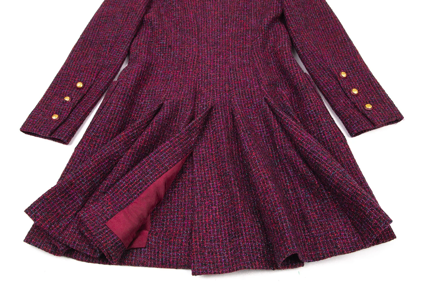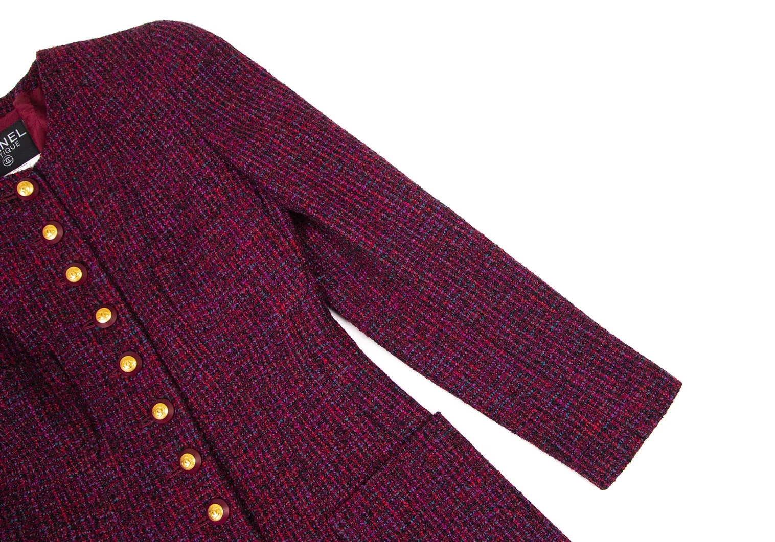 シャネルCHANEL ファンシーツイードノーカラーフレアロングジャケット 赤紫34