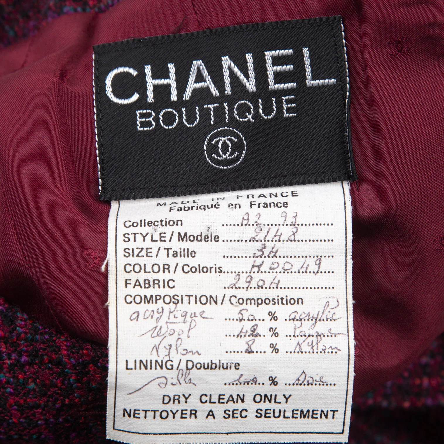 1993A/W。肩パッドあり。目立ったシミ、汚れ、ほつれ等なくいい状態です。クリーニング済み