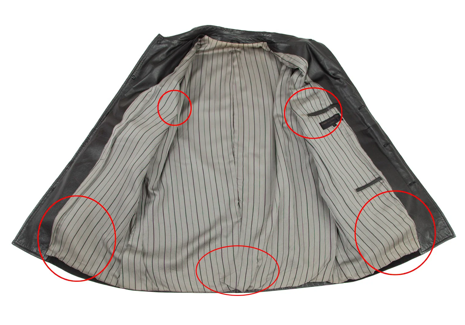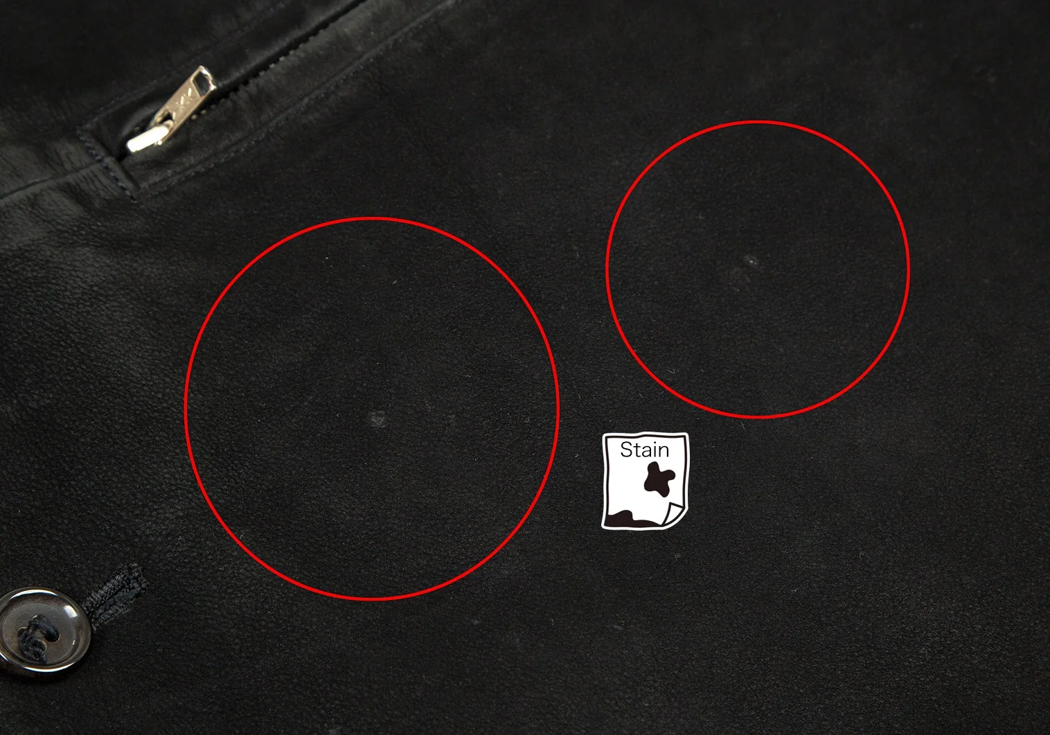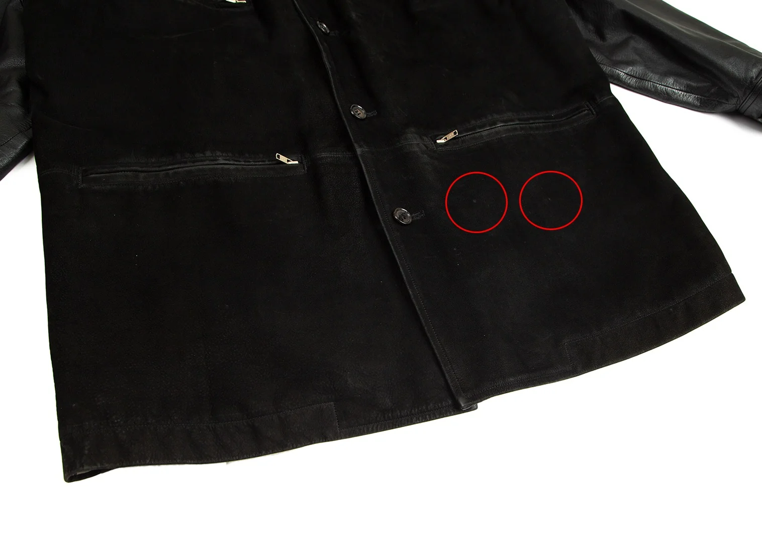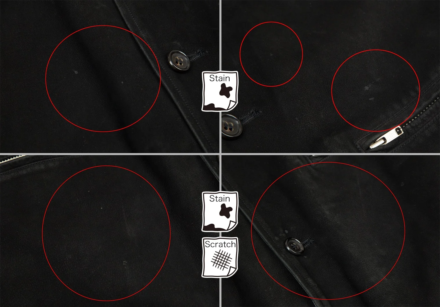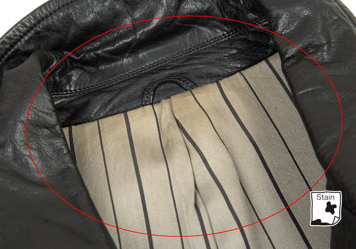 首裏・袖裏・裏地全体にシミ多数、前身頃に汚れ・スレ、前裾に汚れがあります(画像参照)。その他目立ったシミ、汚れ、ほつれ等ありません。クリーニング済み