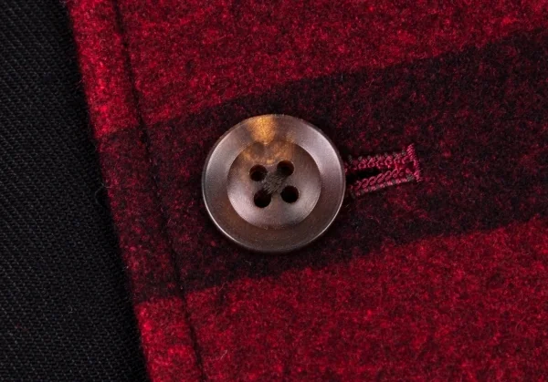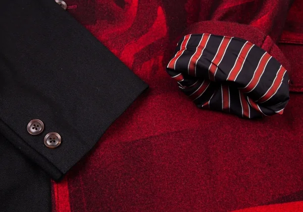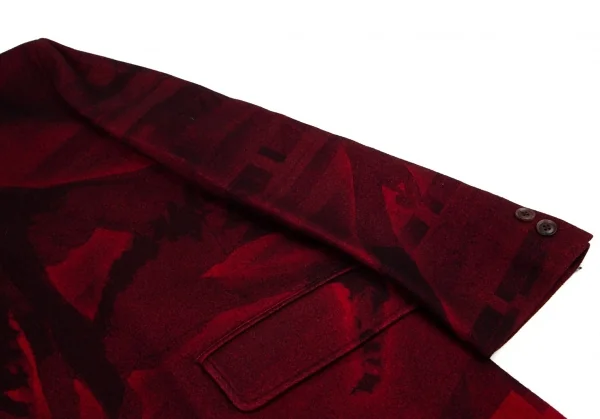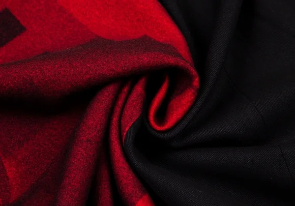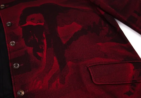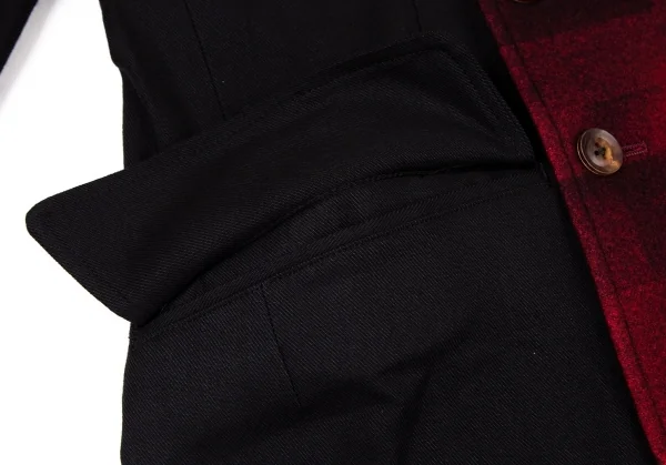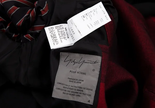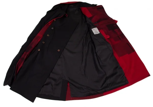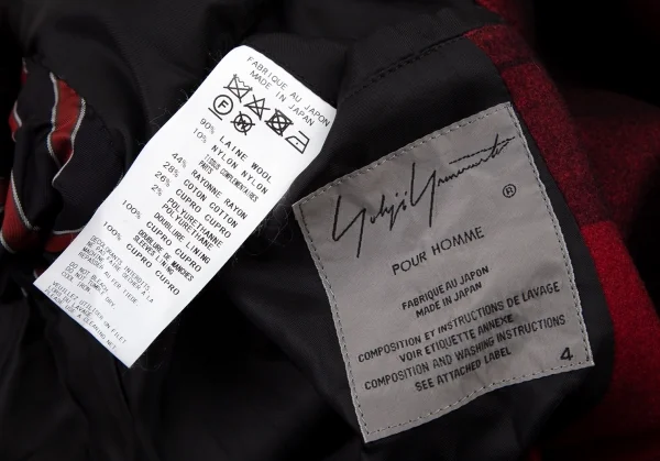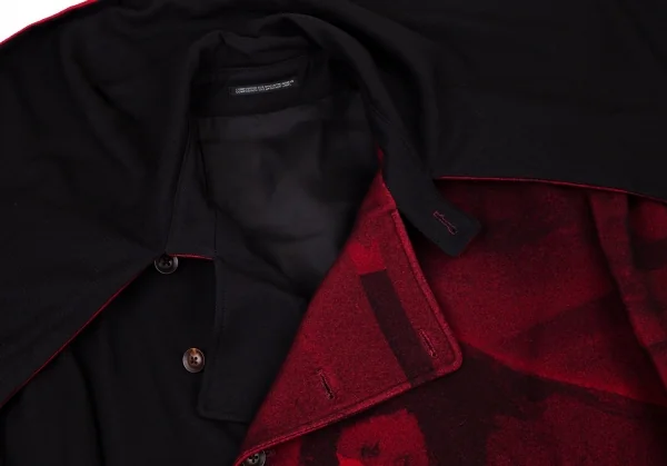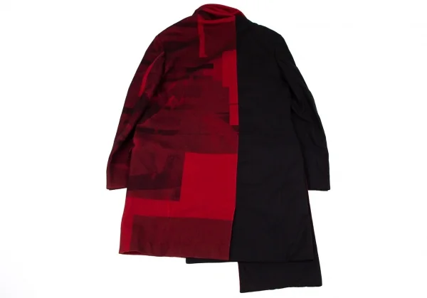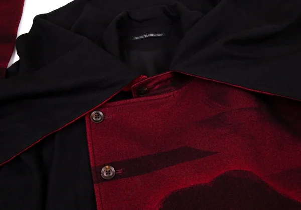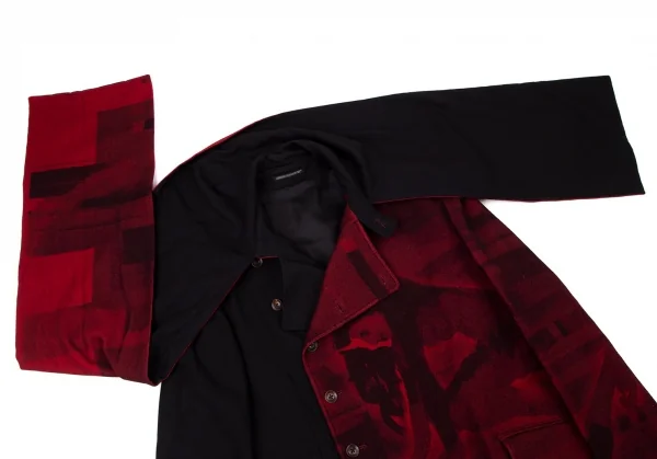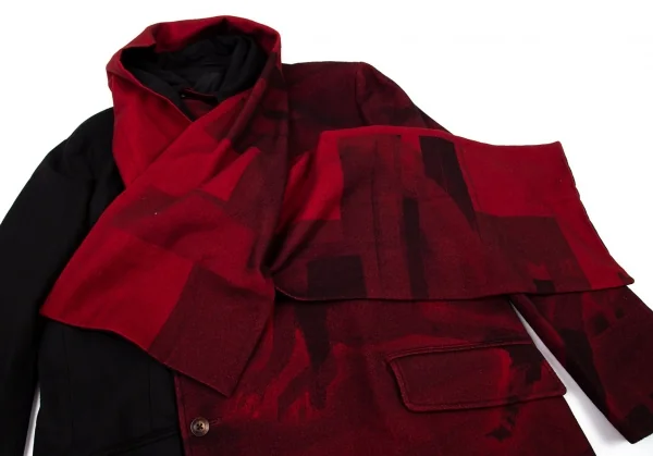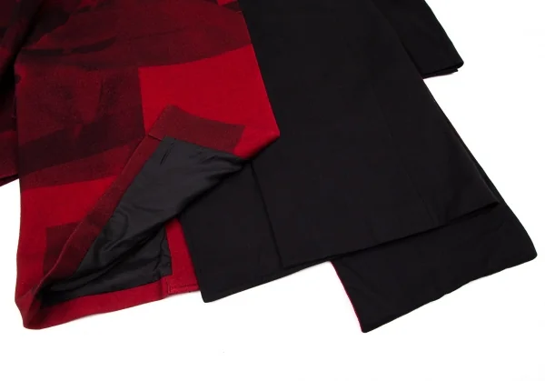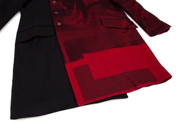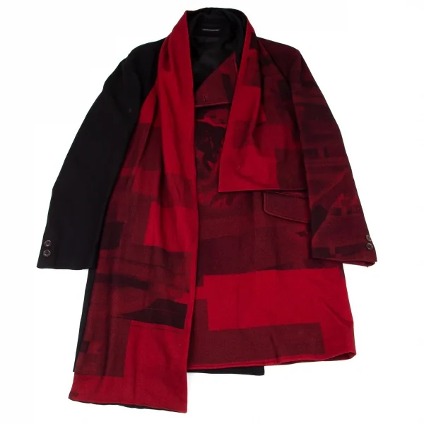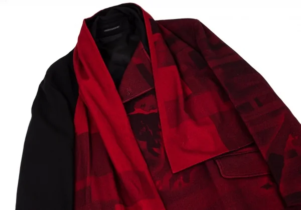 ヨウジヤマモト プールオムYohji Yamamoto POUR HOMME プリントフランネル切替スカーフロングジャケット 黒赤4