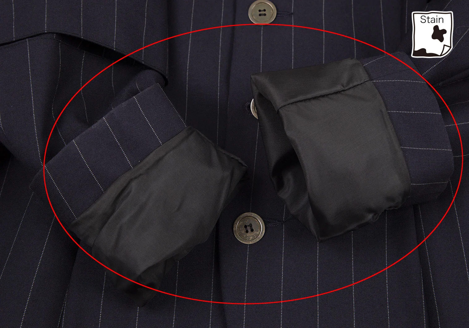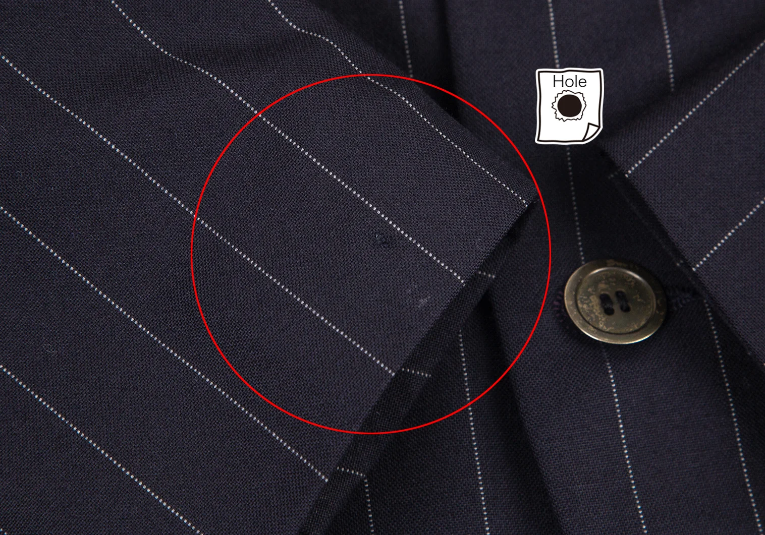 右袖先に小穴、袖裏に薄汚れがあります(写真参照)。その他に目立ったシミ、汚れ、ほつれ等はありません。クリーニング済み