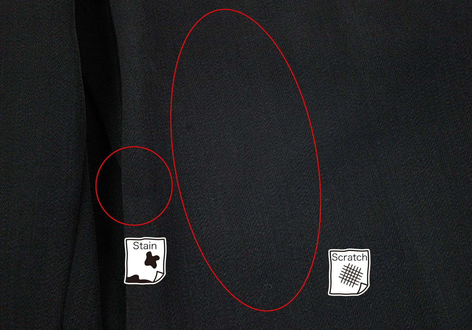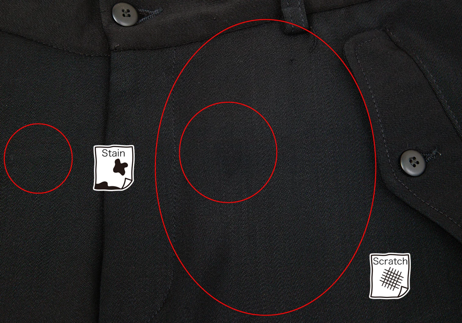 前にシミ・糸引き、後ろ裾に糸引きがあります(写真参照)。その他に目立ったシミ、汚れ、ほつれ等はありません。クリーニング済み