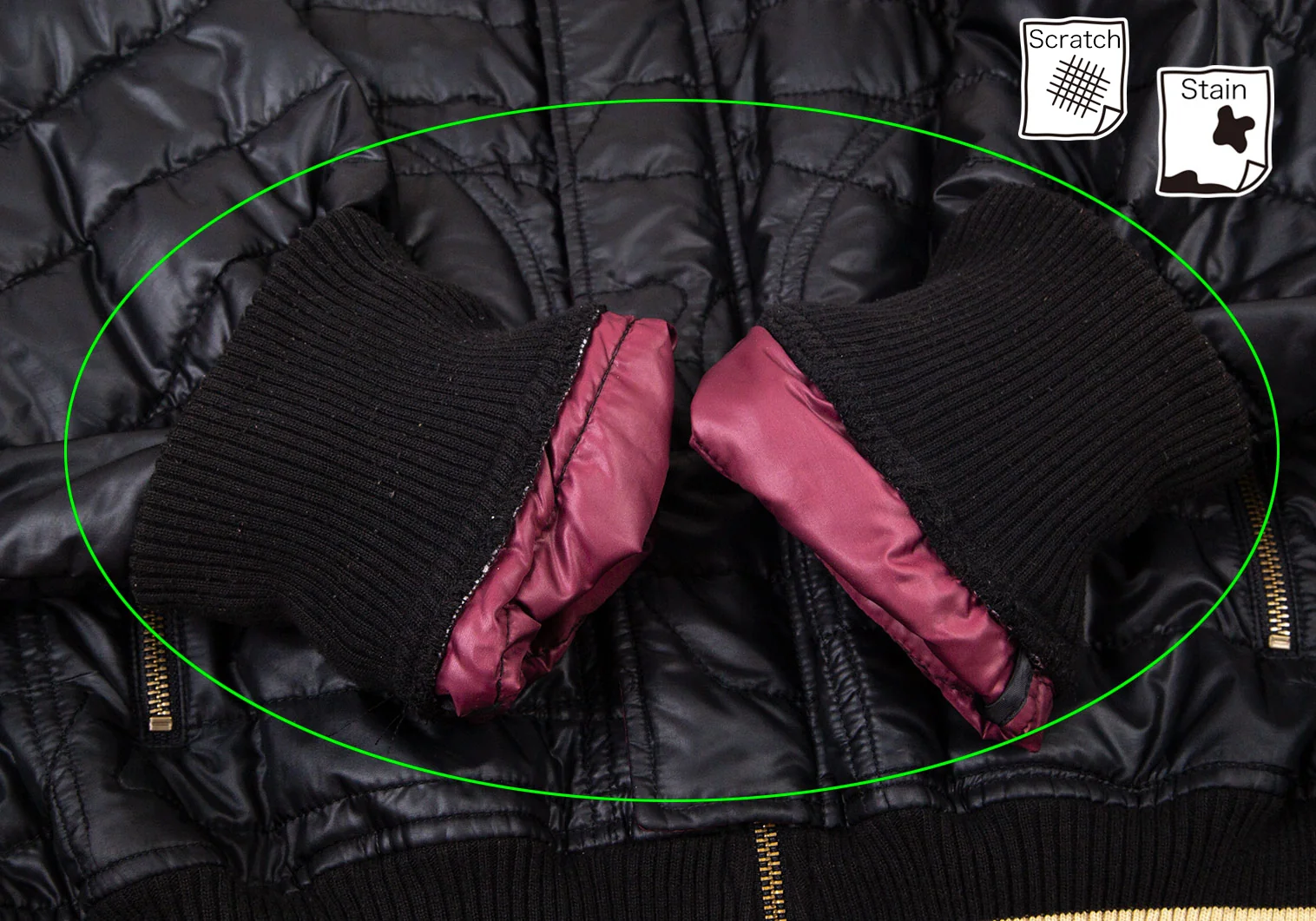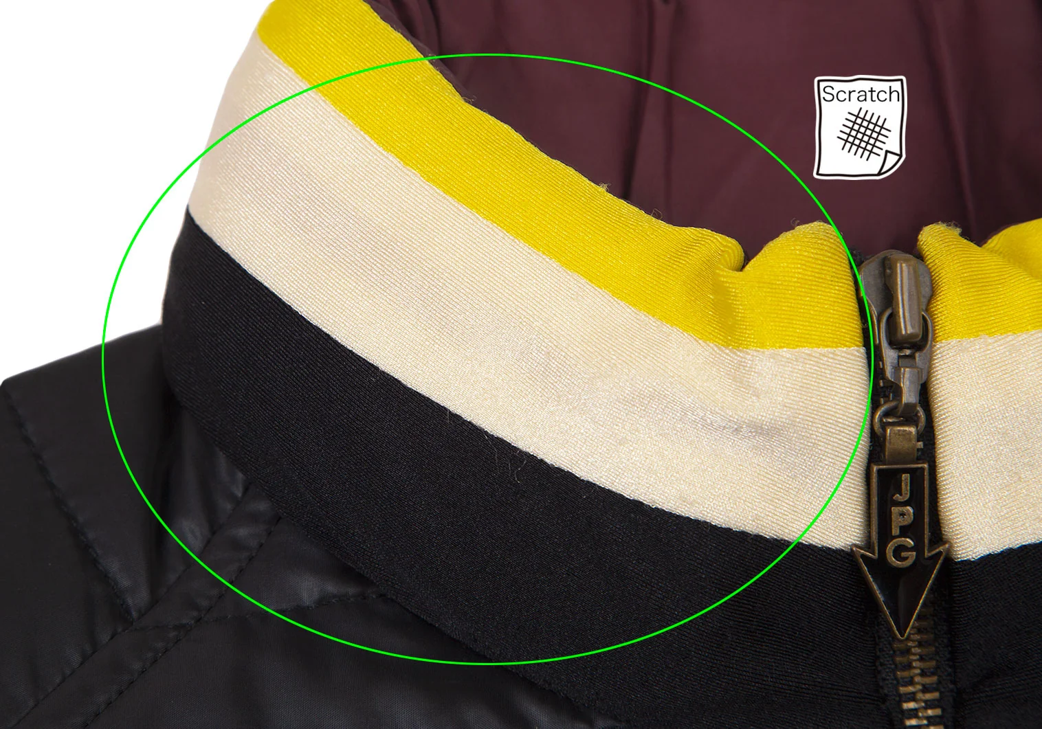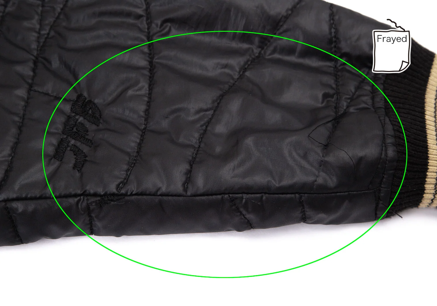 首周りに毛羽立ち、前に引っ掛け、左袖先にステッチほつれ、袖裏に薄汚れ・毛羽立ち、裏地首元に薄シミがあります(写真参照)。その他に目立ったシミ、汚れはありません。クリーニング済み