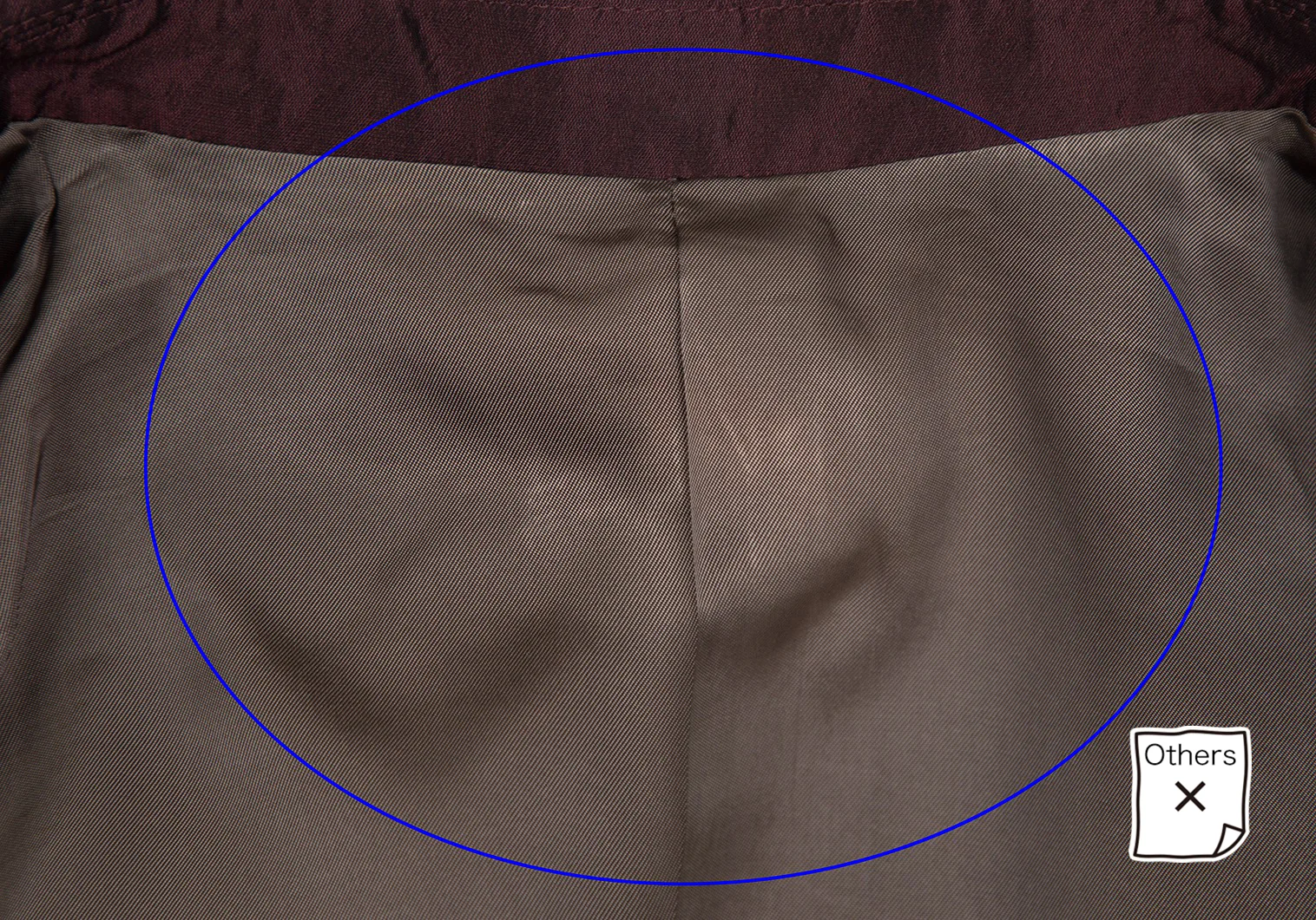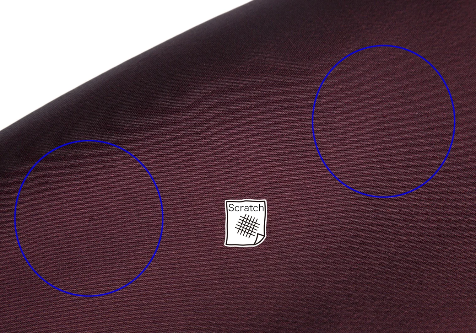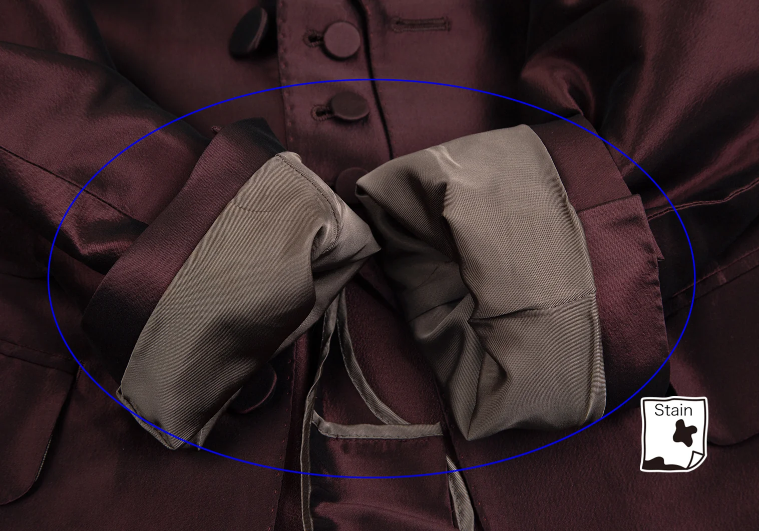 肩パッドあり。右袖引っ掛け、左袖薄汚れ、袖裏に薄シミ、裏地にアタリがあります(画像参照)。その他目立ったシミ、汚れ、ほつれ等なくいい状態です。クリーニング済み
