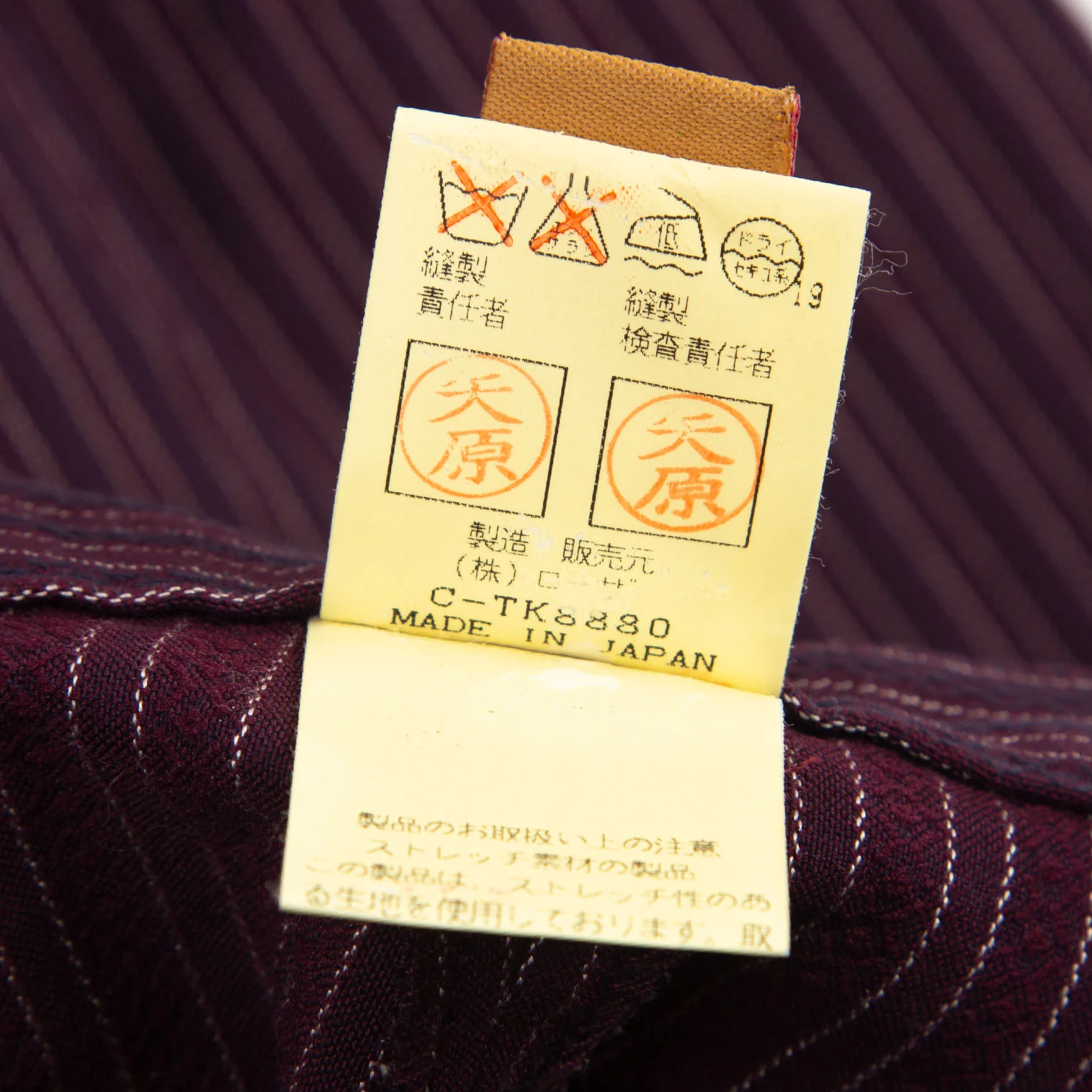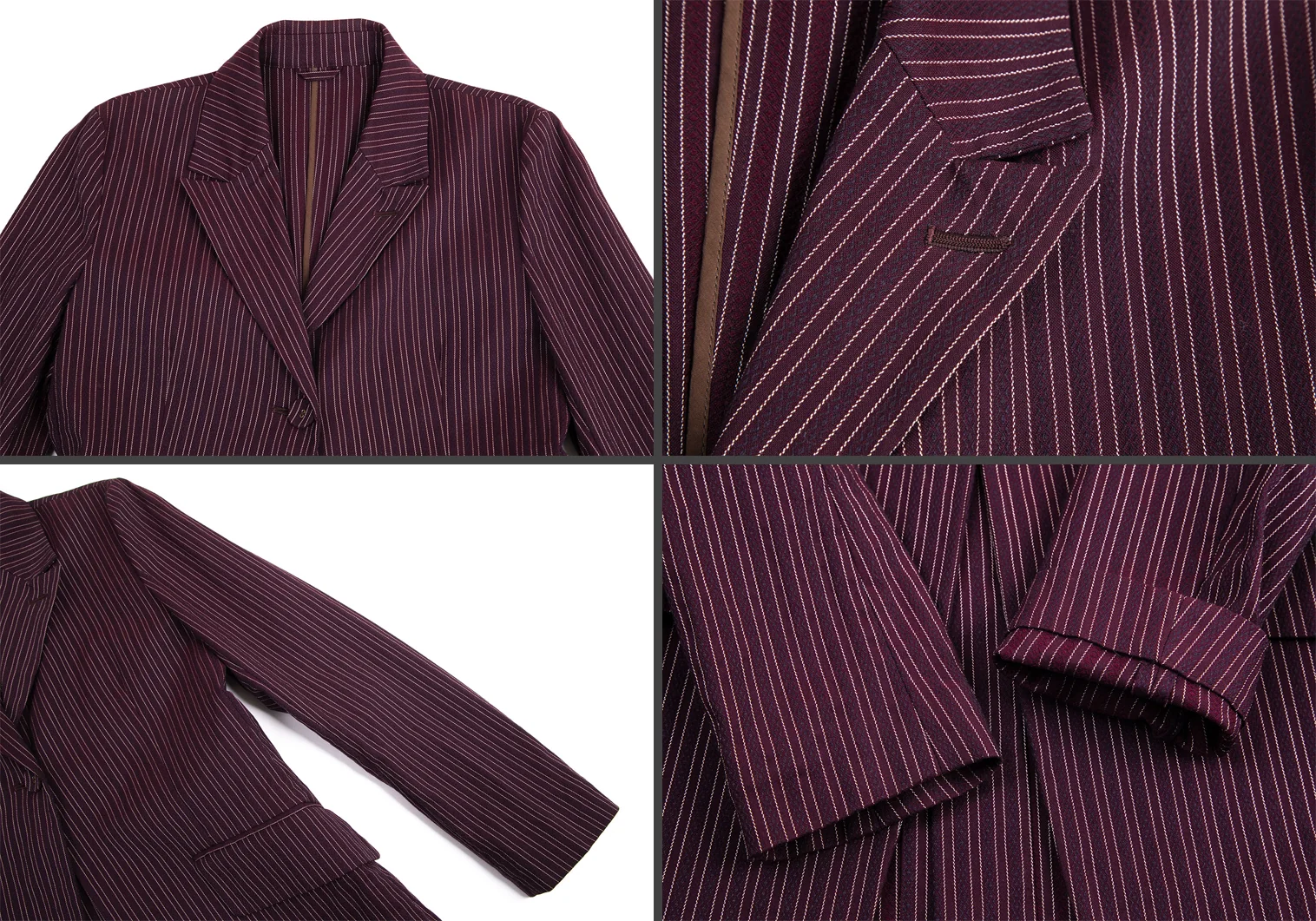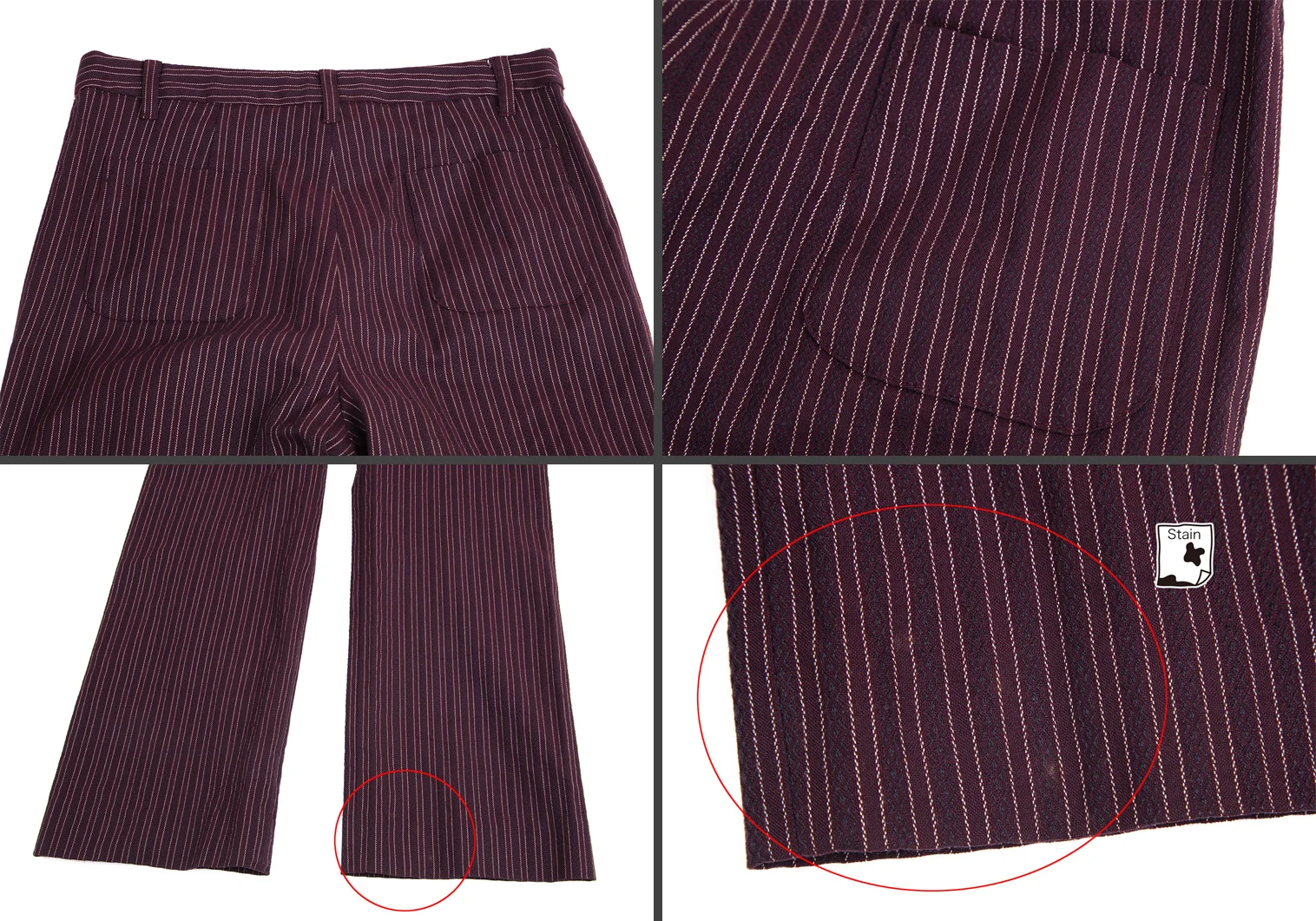 パンツ:前・後裾にシミがあります(写真参照)。その他に目立ったシミ、汚れ、ほつれ等なくいい状態です。クリーニング済み