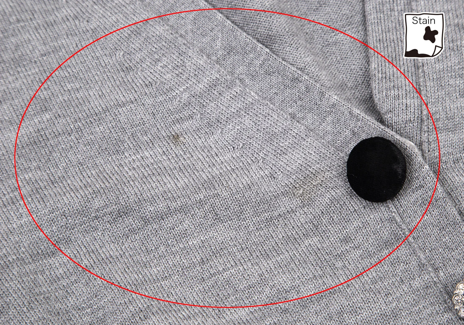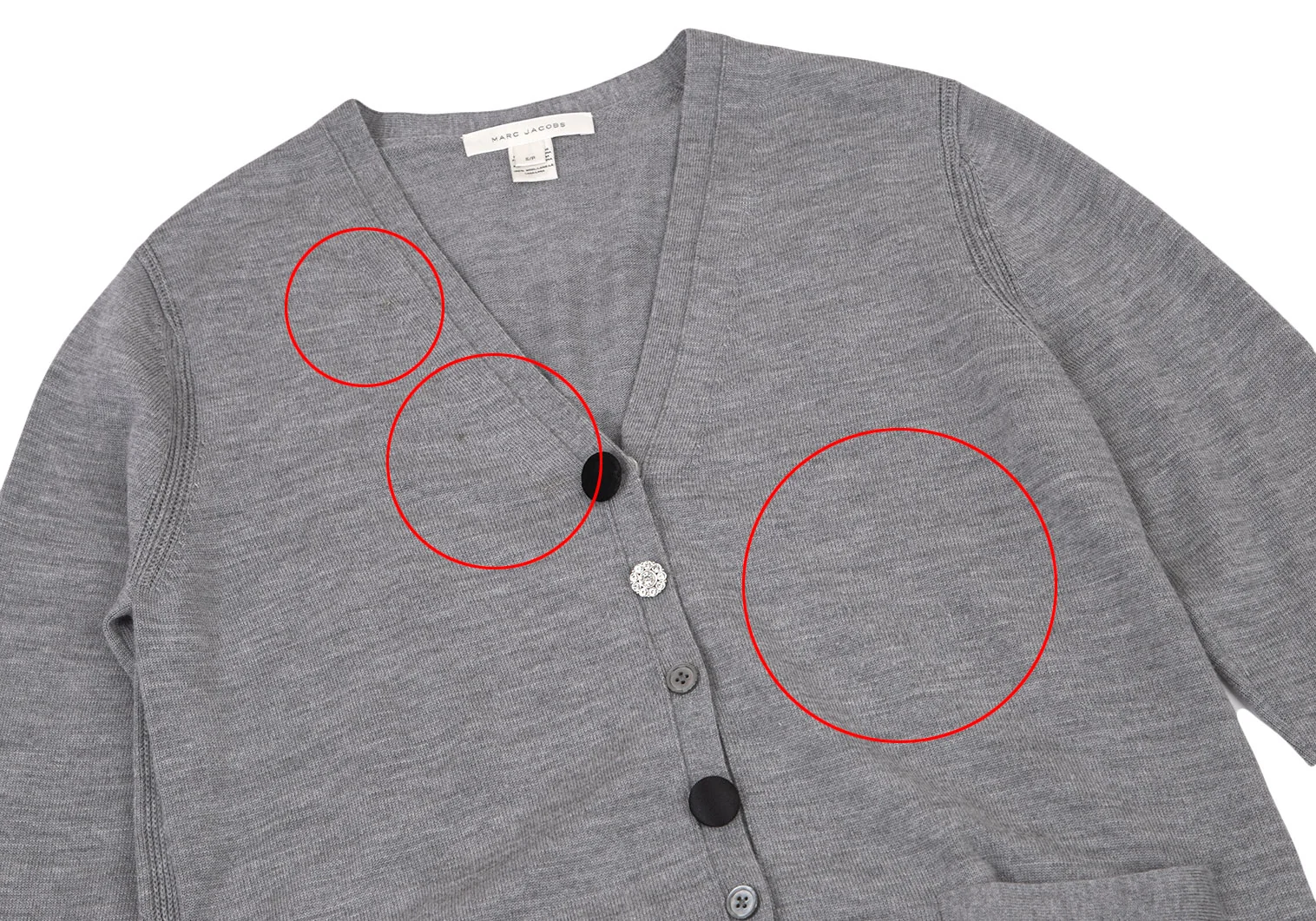 前にシミ、毛羽立ち、右袖先に点シミがあります(写真参照)。その他に目立ったシミ、汚れ、ほつれ等はありません。クリーニング済み