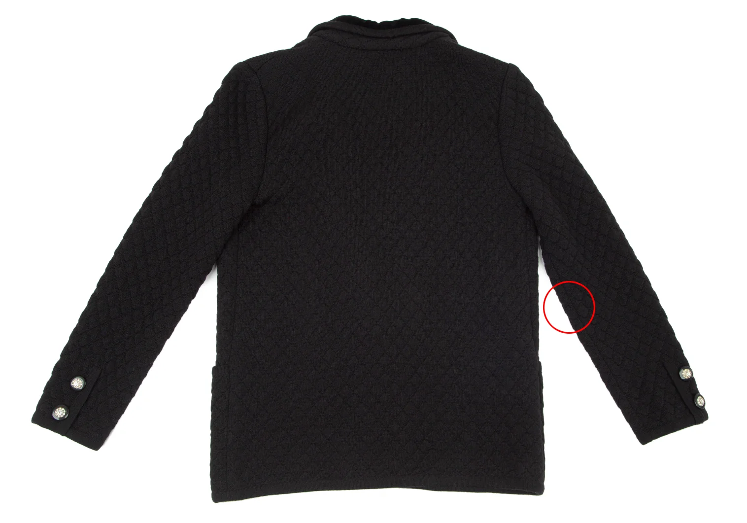 後ろ右袖の表面にほつれによる穴があります(画像参照)。その他目立ったシミ、汚れ、ほつれ等なくいい状態です。クリーニング済み