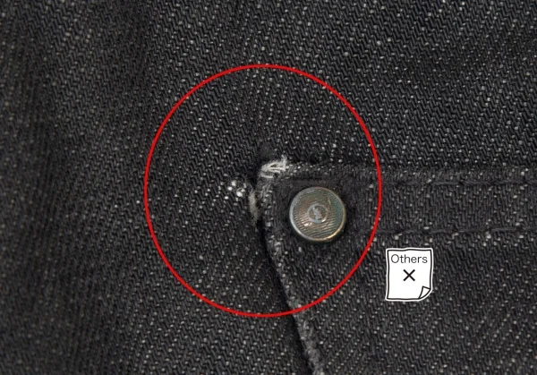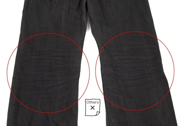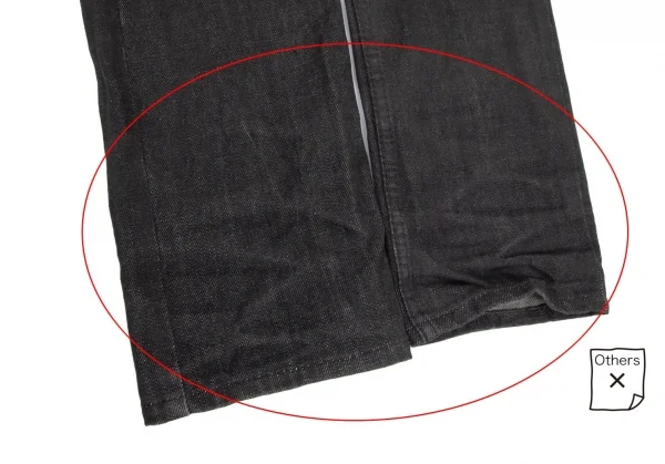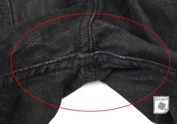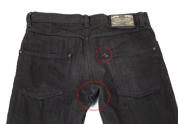 裾口に擦れ・ダメージ、裾裏に一部ダメージと薄汚れ、ヒップ右ポケットにダメージ、股下にスレ、裾先・膝裏に着用シワがあります(画像参照)。その他目立ったシミ、汚れ、ほつれ等ありません。クリーニング済み
