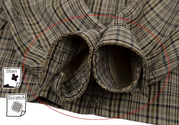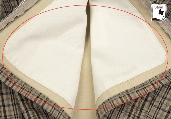 襟裏・袖先にシミ・擦れダメージ、裏面裾周りに薄シミがあります(写真参照)。その他に目立ったシミ、汚れ、ほつれ等はありません。クリーニング済み