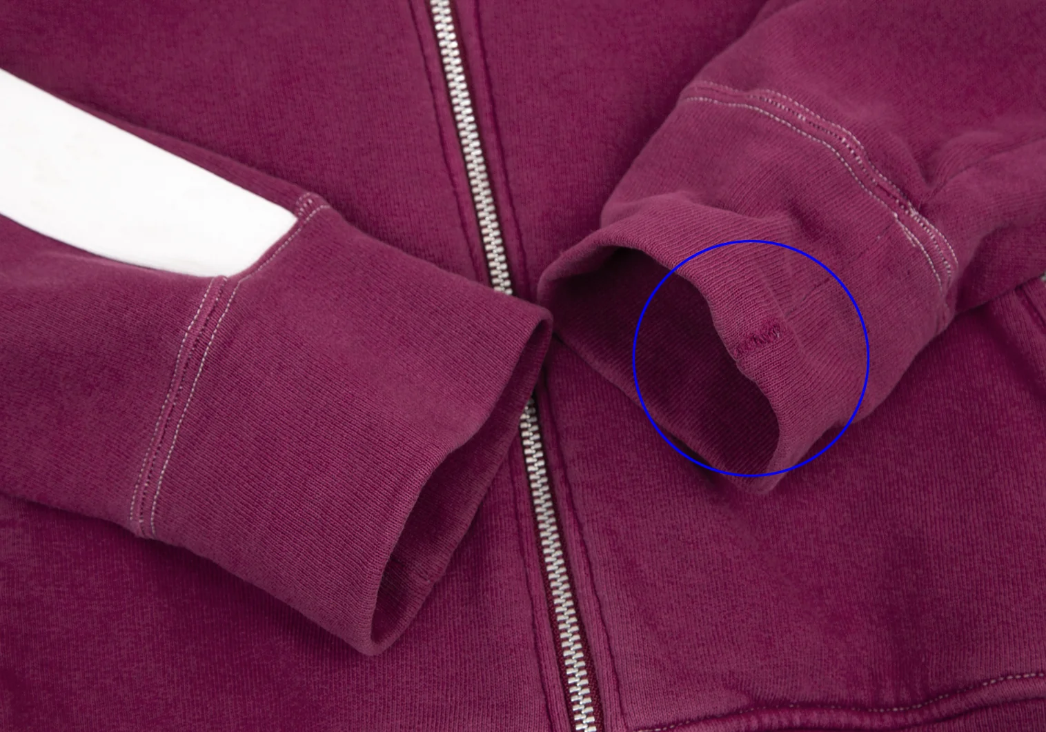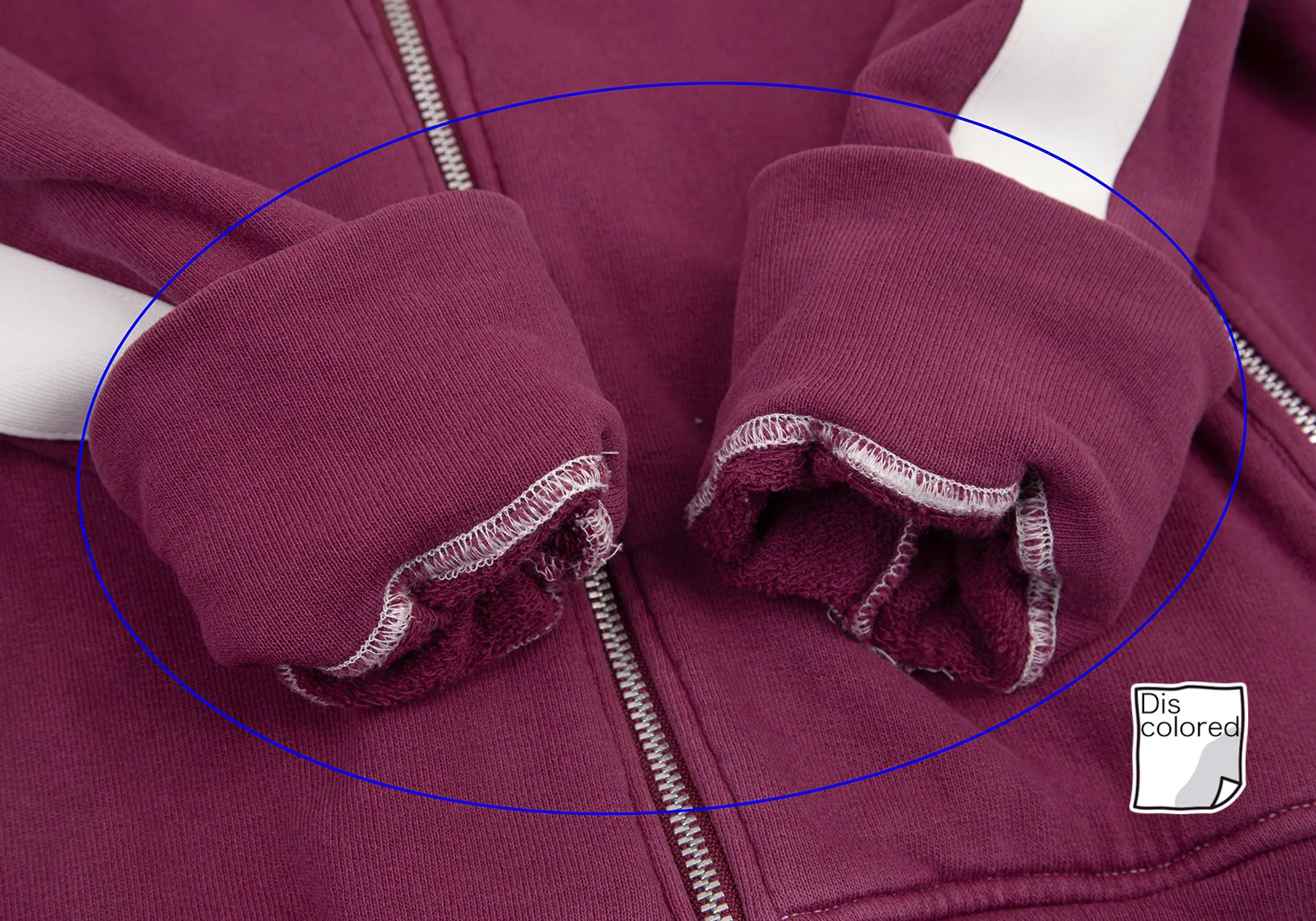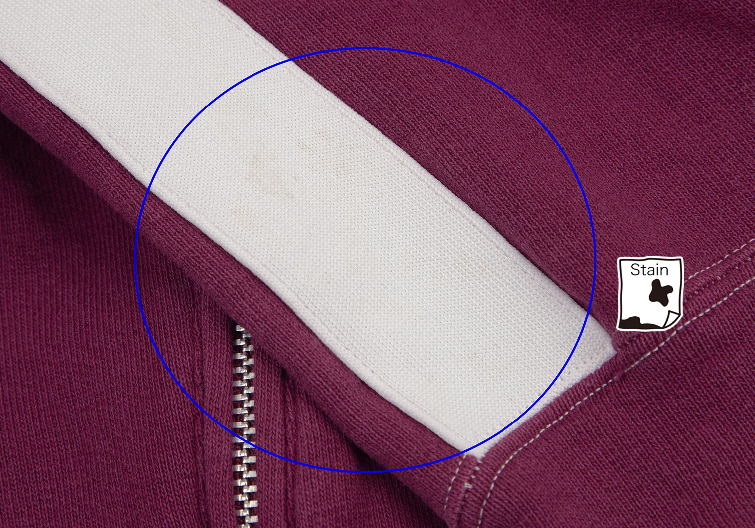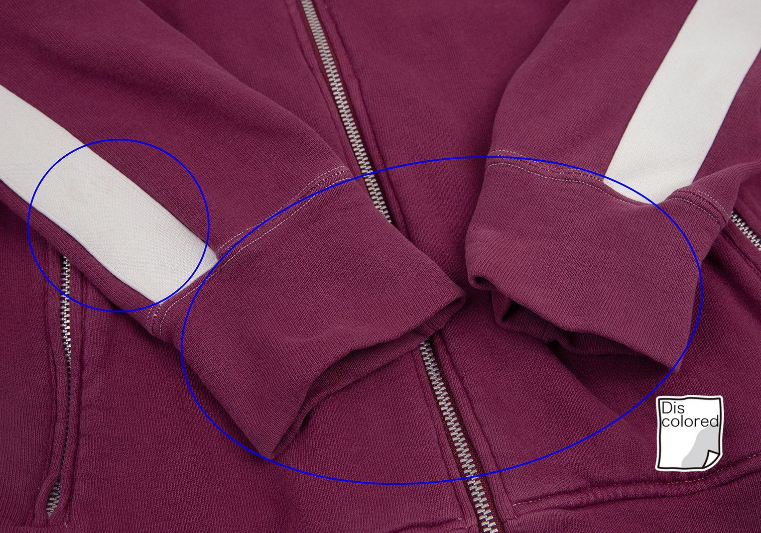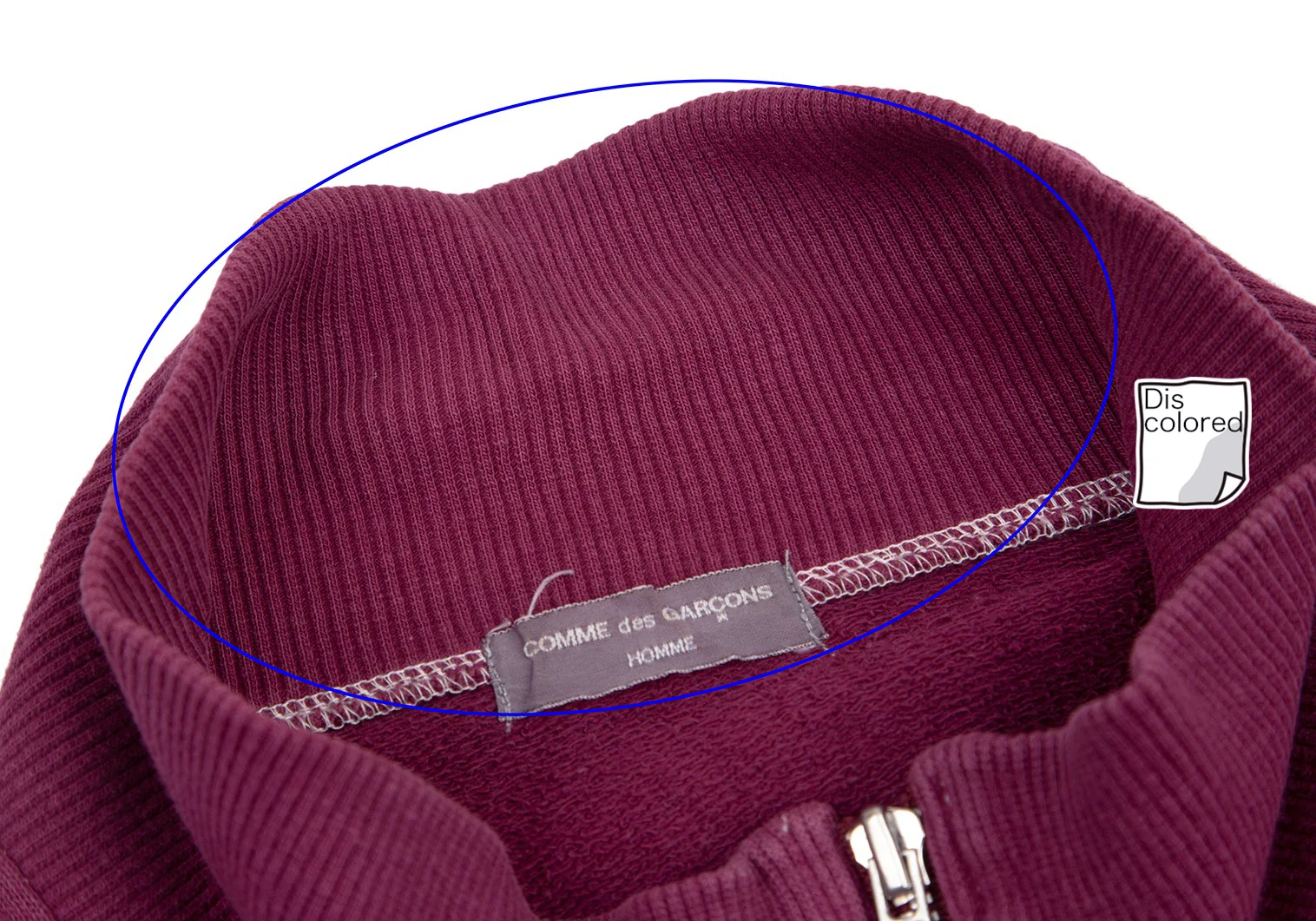 品質表示タグに劣化があります。首周りに色褪せ、右袖にシミ、袖先・袖裏に色褪せ、左袖先にダメージ、裏に引っ掛けが多数あります。(画像参照)。その他目立ったシミ、汚れ、ほつれ等ありません。クリーニング済み