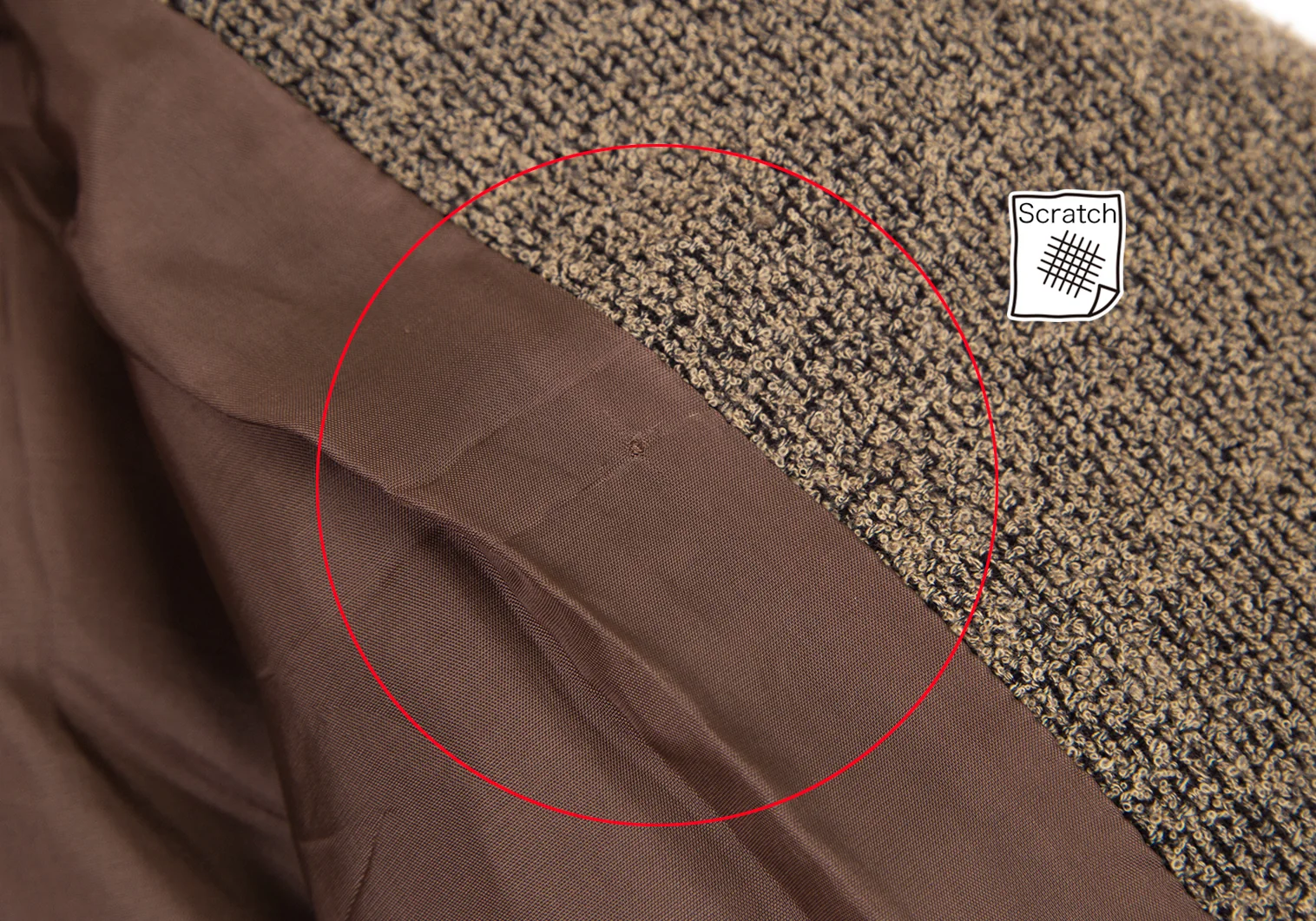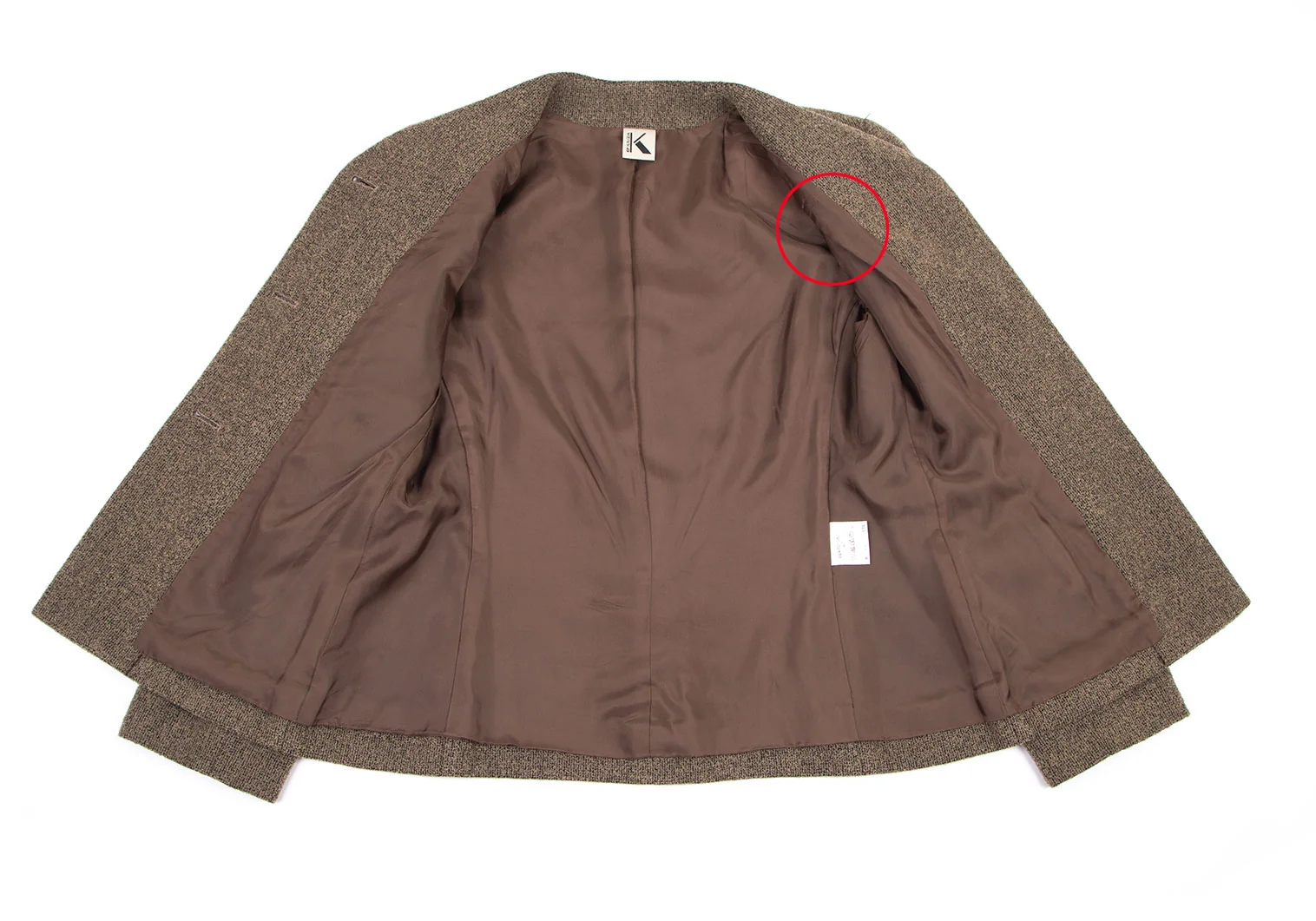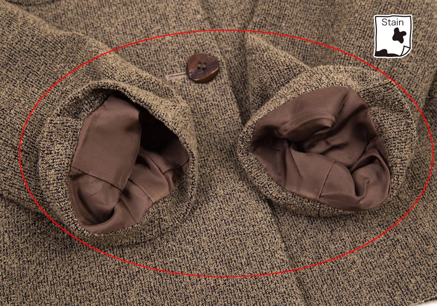 肩パッドあり。袖裏に汚れ、裏地に引っ掛けがあります(写真参照)。その他に目立ったシミ、汚れ、ほつれ等はありません。クリーニング済み