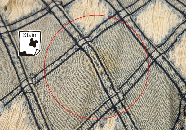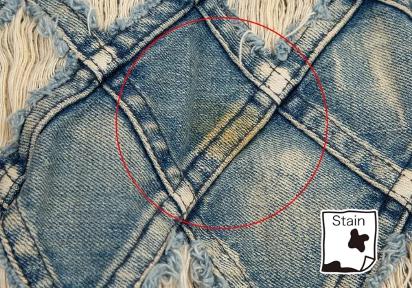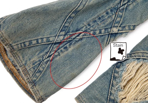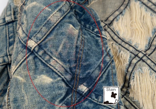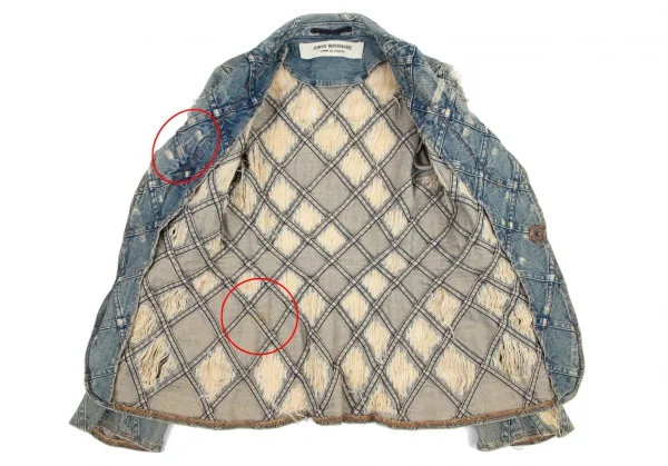ダメージ部は透けます。右袖・裾にシミ、ラペル内側に変色があります(写真参照)その他目立ったシミ、汚れ、ほつれ等なくいい状態です。クリーニング済み