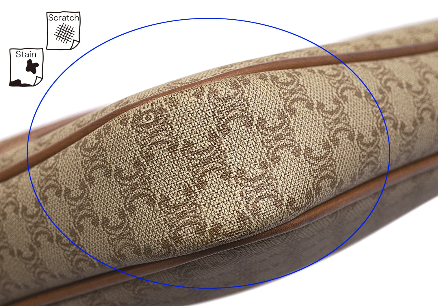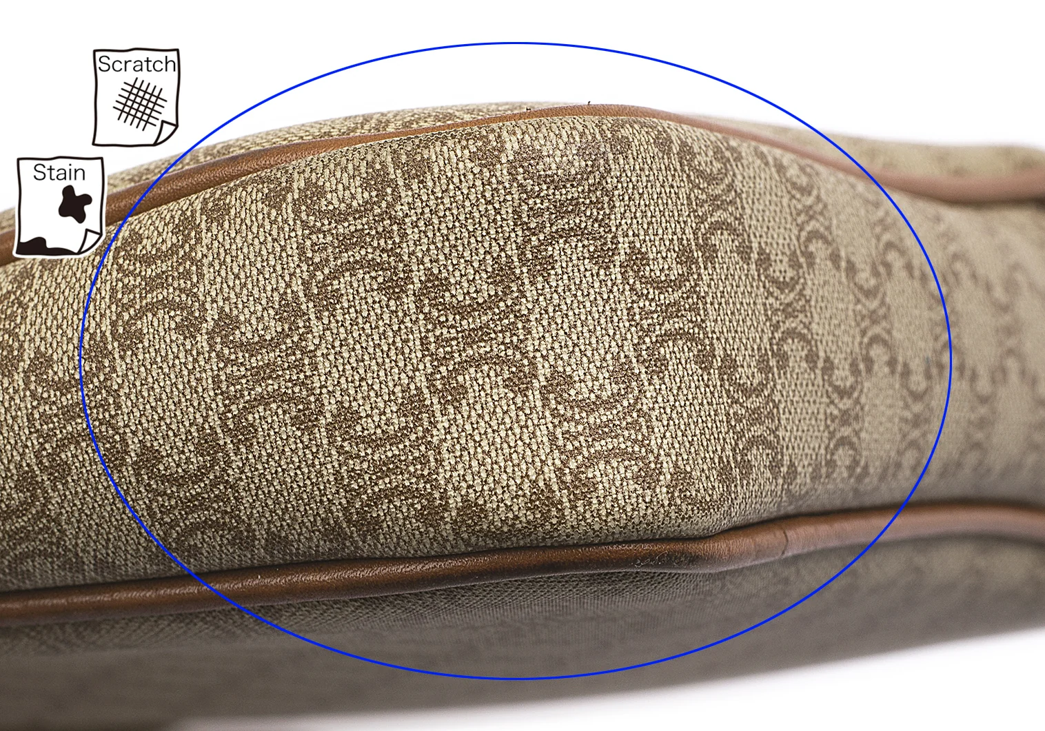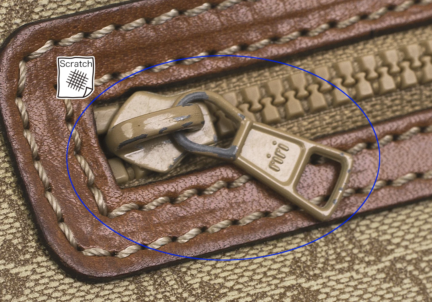 全体的に少し汚れと使用感あり。ジップ引き手塗装剥がれ、角擦れ汚れがあります(写真参照)。