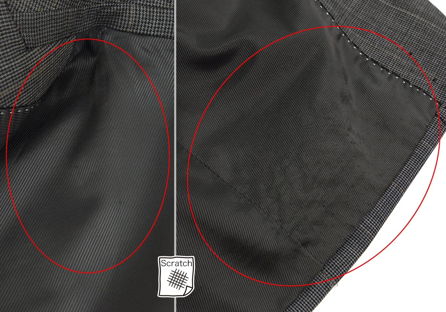 ジャケット:肩パッドあり。ラペルにシミ、裏地首に引っ掛け、裾にスレがあります(写真参照)。その他目立ったシミ、汚れ、ほつれ等なくいい状態です。クリーニング済み