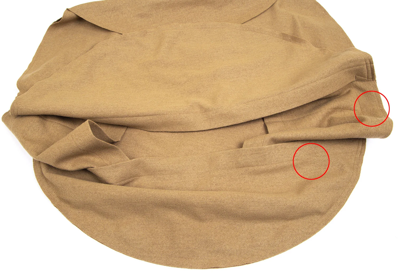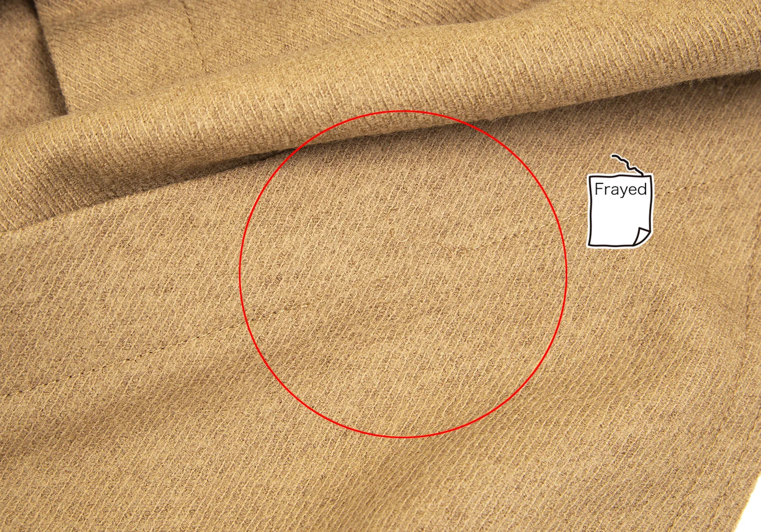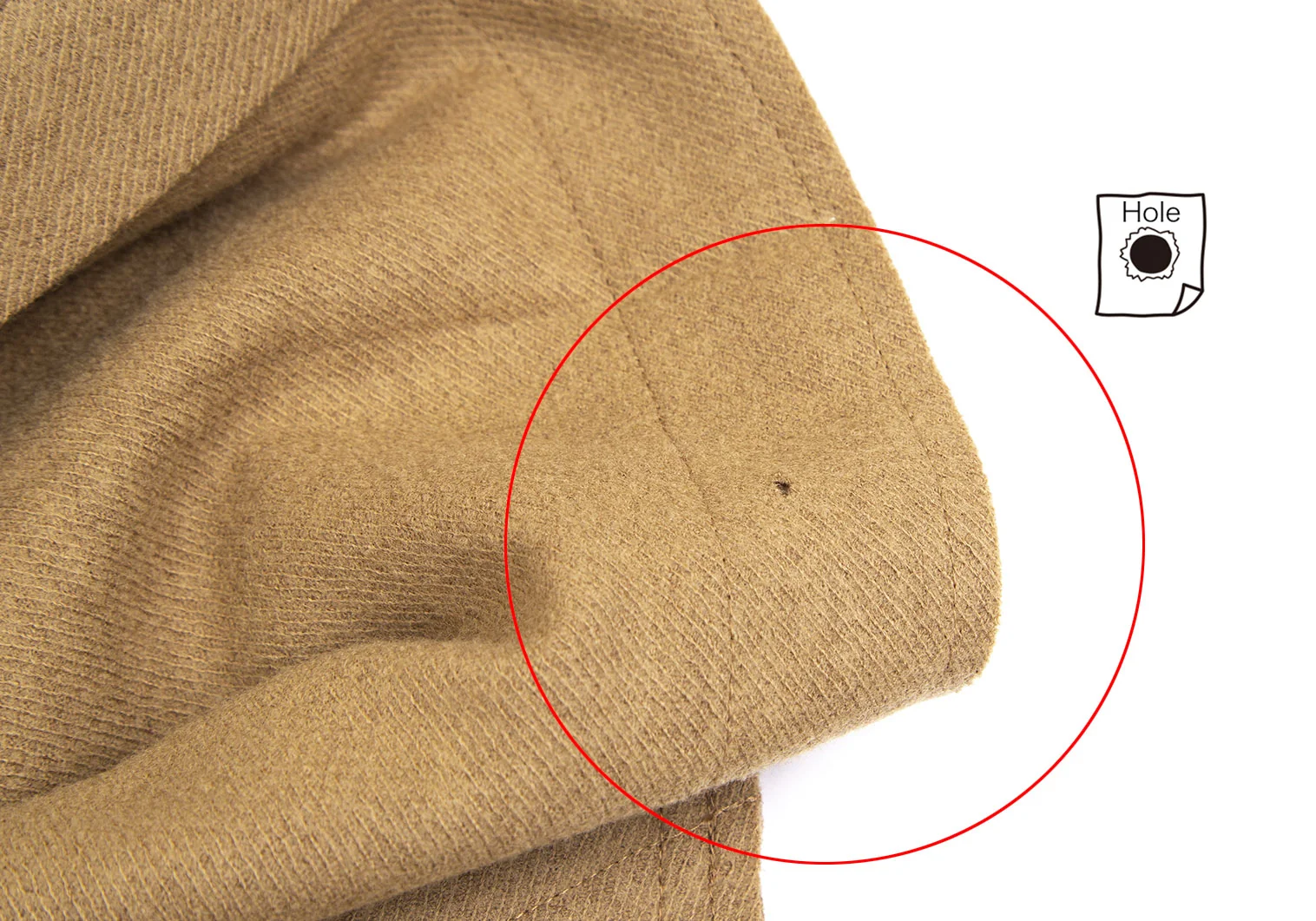 ブランドタグ・品質表示タグがありません。左脇下に穴、裾ステッチにほつれがあります。(写真参照)。その他に目立ったシミ、汚れ、ほつれ等なくいい状態です。クリーニング済み