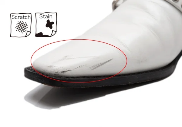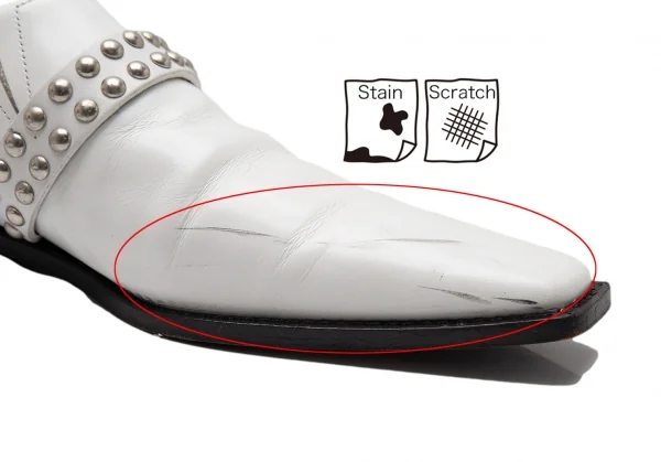 全体的にスレ、汚れがあります。かかと減り、履きジワがあります。(写真参照)