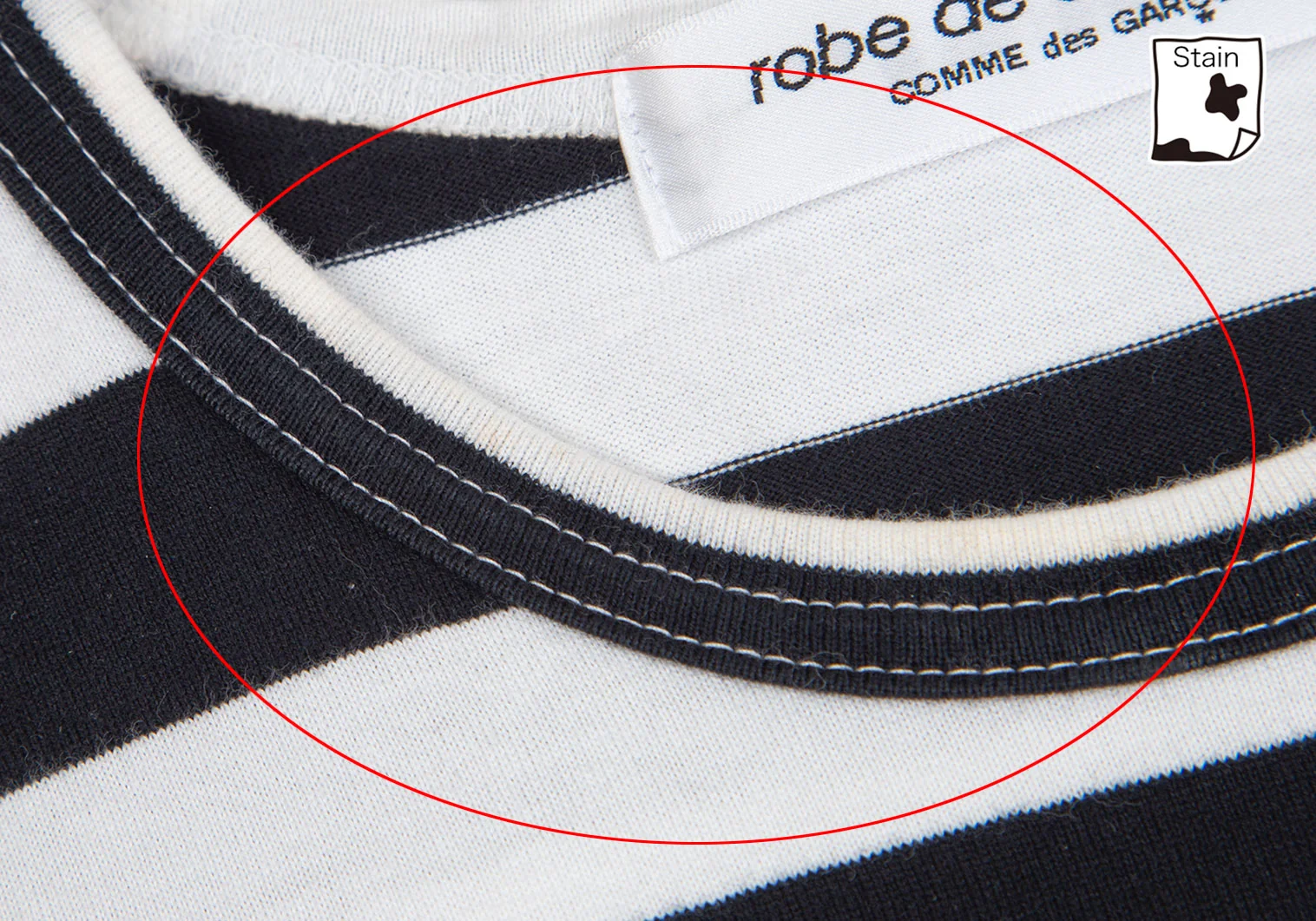 品質表示タグがカットされています。首周りに薄シミがあります(写真参照)。その他に目立ったシミ、汚れ、ほつれ等はありません。クリーニング済み
