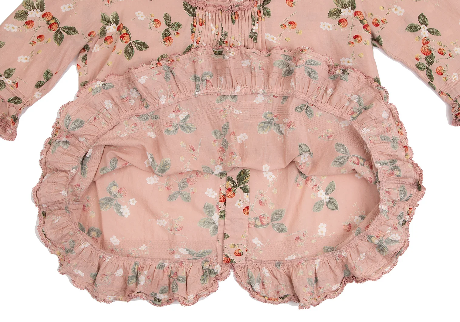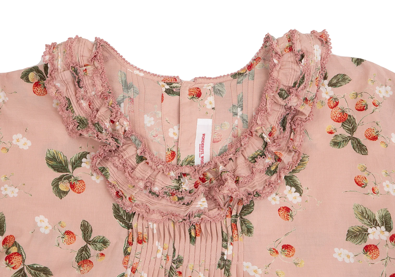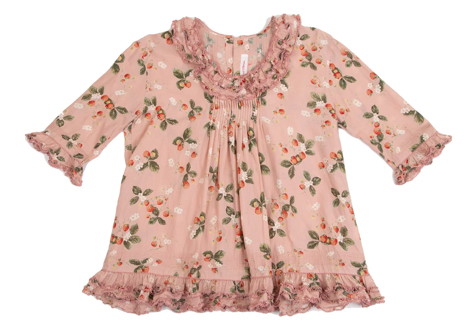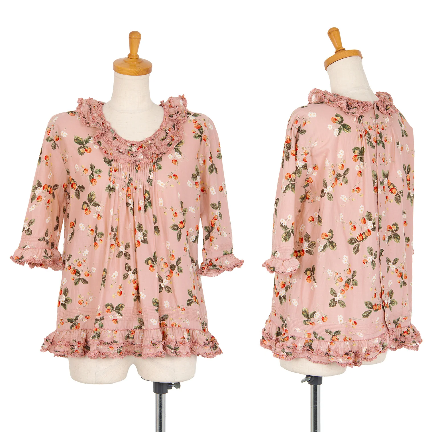ワンダフルワールド カネコイサオWONDERFUL WORLD KANEKO ISAO ストロベリー総柄バックボタンフリルデザイン5分袖トップス 薄ピンクM位
