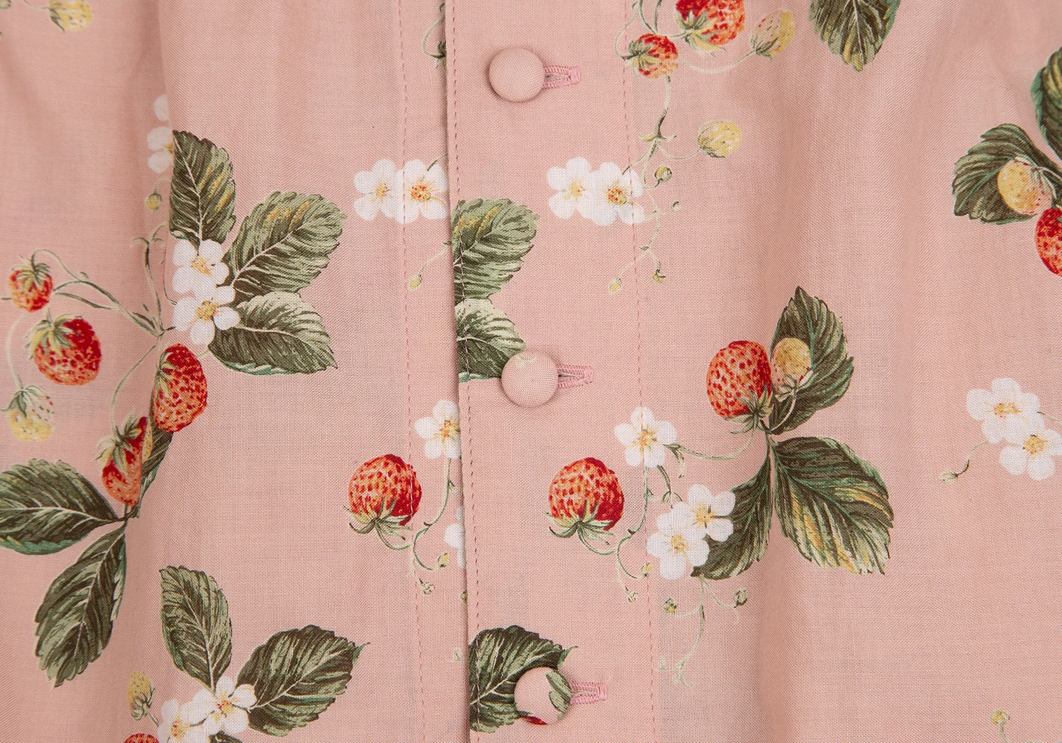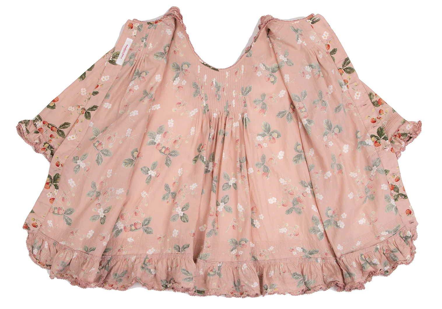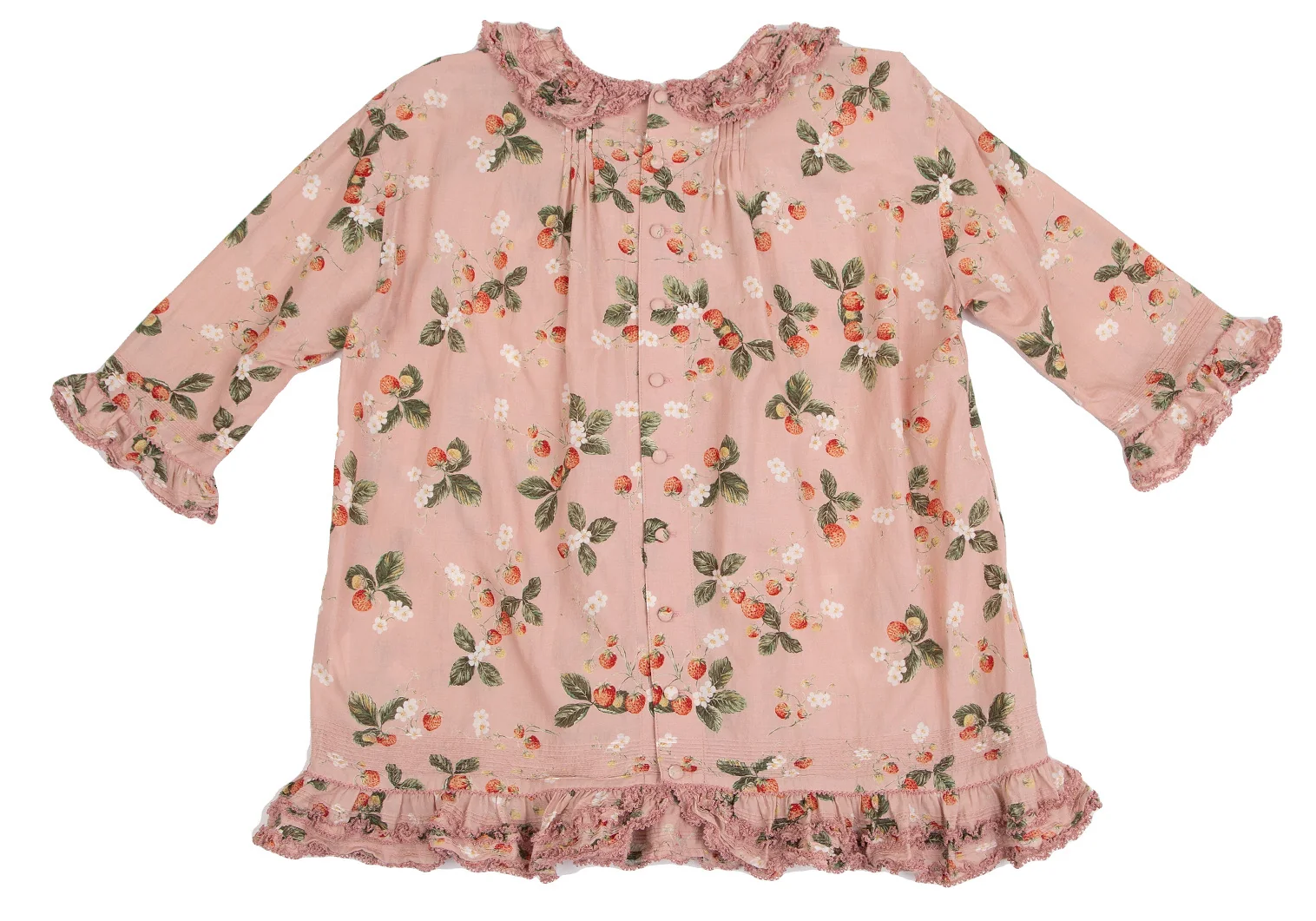 ワンダフルワールド カネコイサオWONDERFUL WORLD KANEKO ISAO ストロベリー総柄バックボタンフリルデザイン5分袖トップス 薄ピンクM位