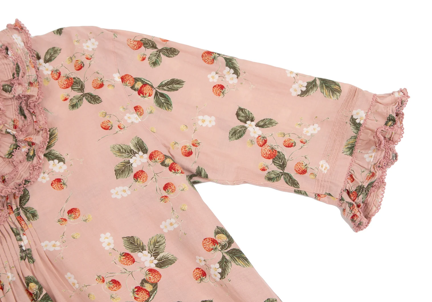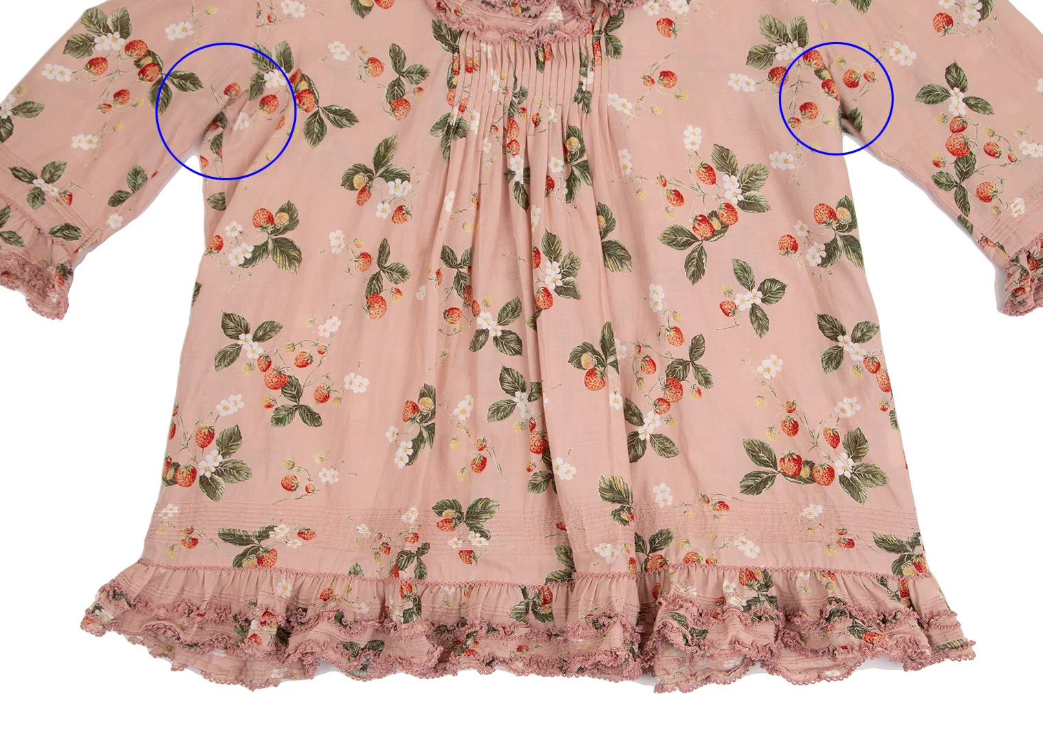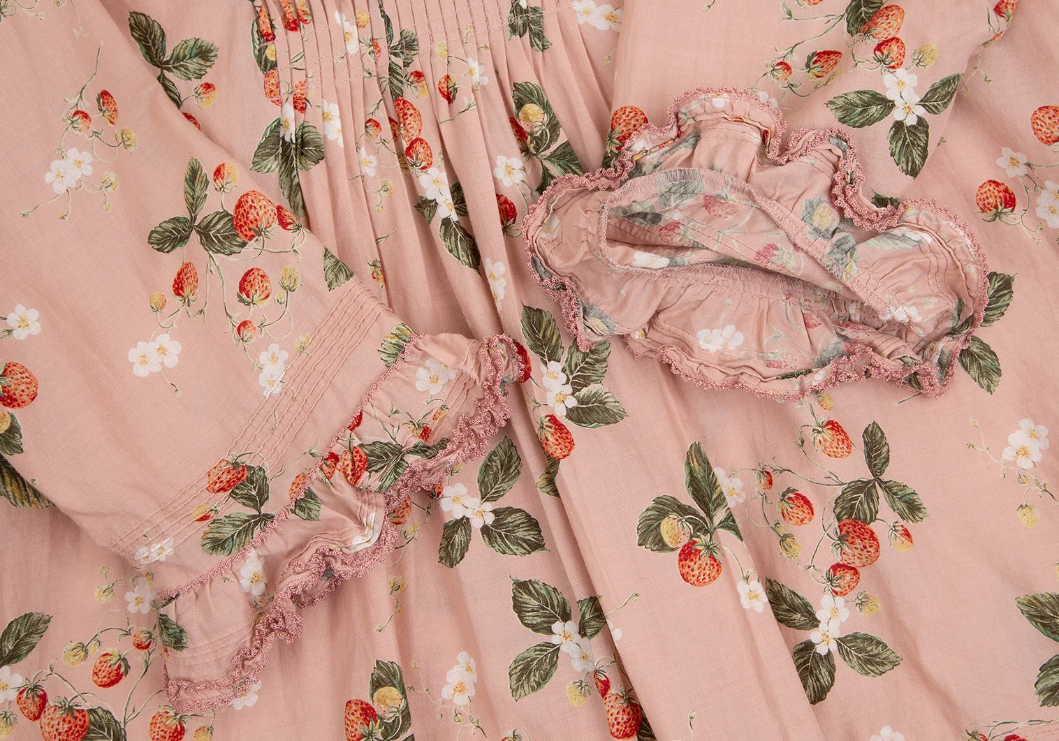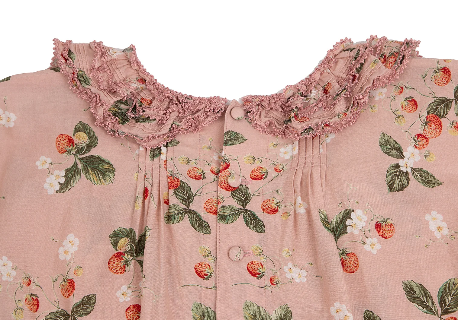 ワンダフルワールド カネコイサオWONDERFUL WORLD KANEKO ISAO ストロベリー総柄バックボタンフリルデザイン5分袖トップス 薄ピンクM位