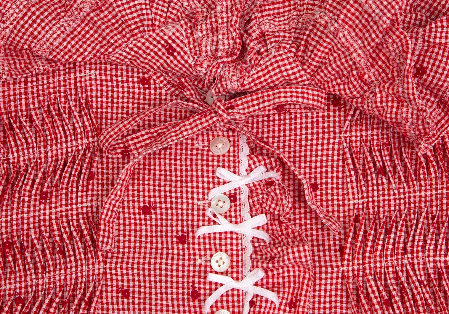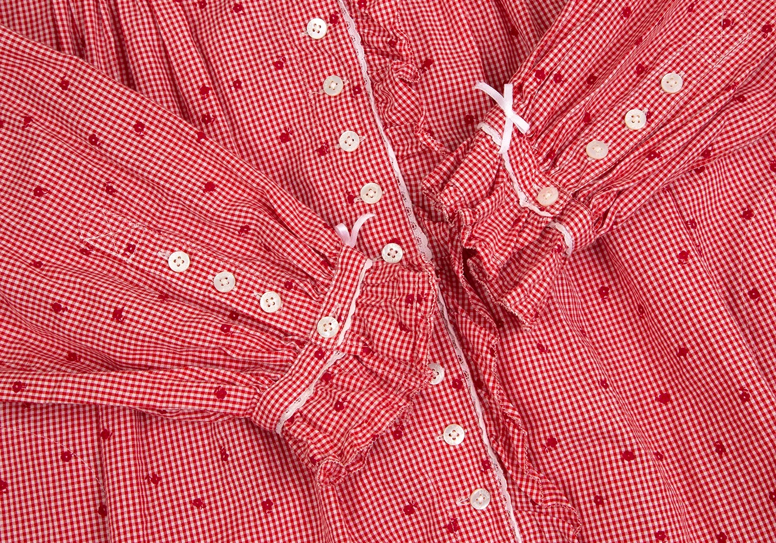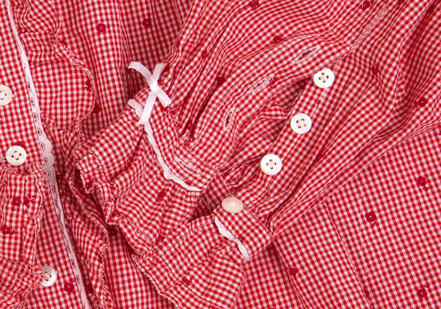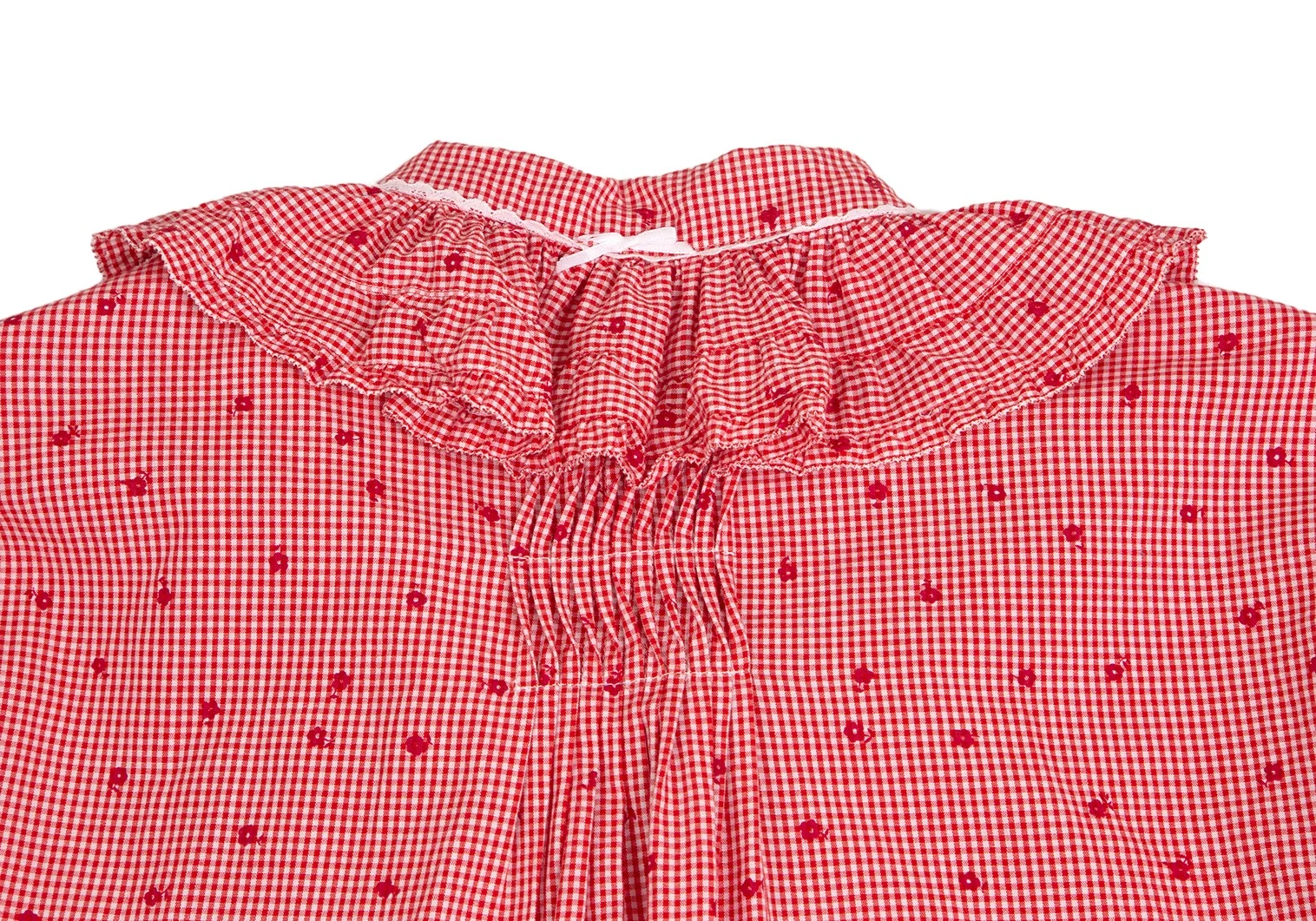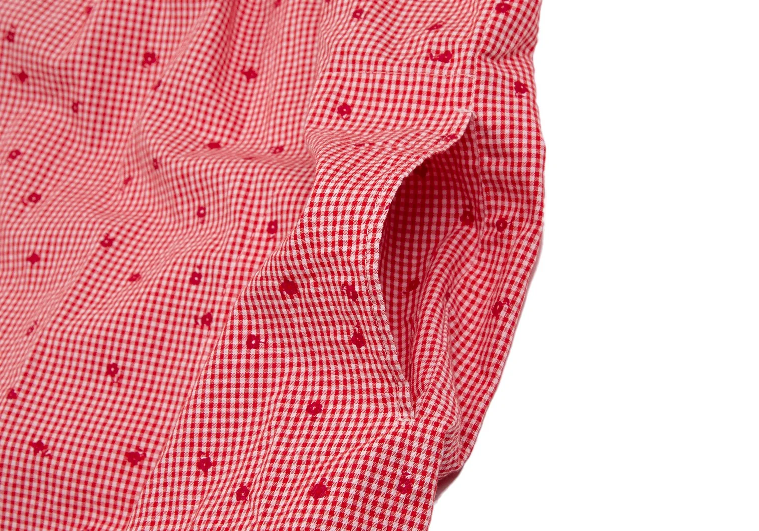 ピンクハウスPINK HOUSE 花柄ギンガムチェックフリルネックリボンデザインシャツ 赤白M位