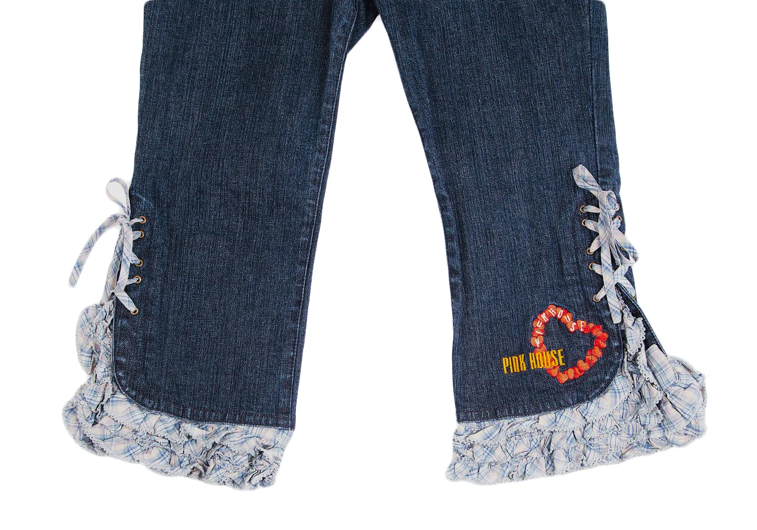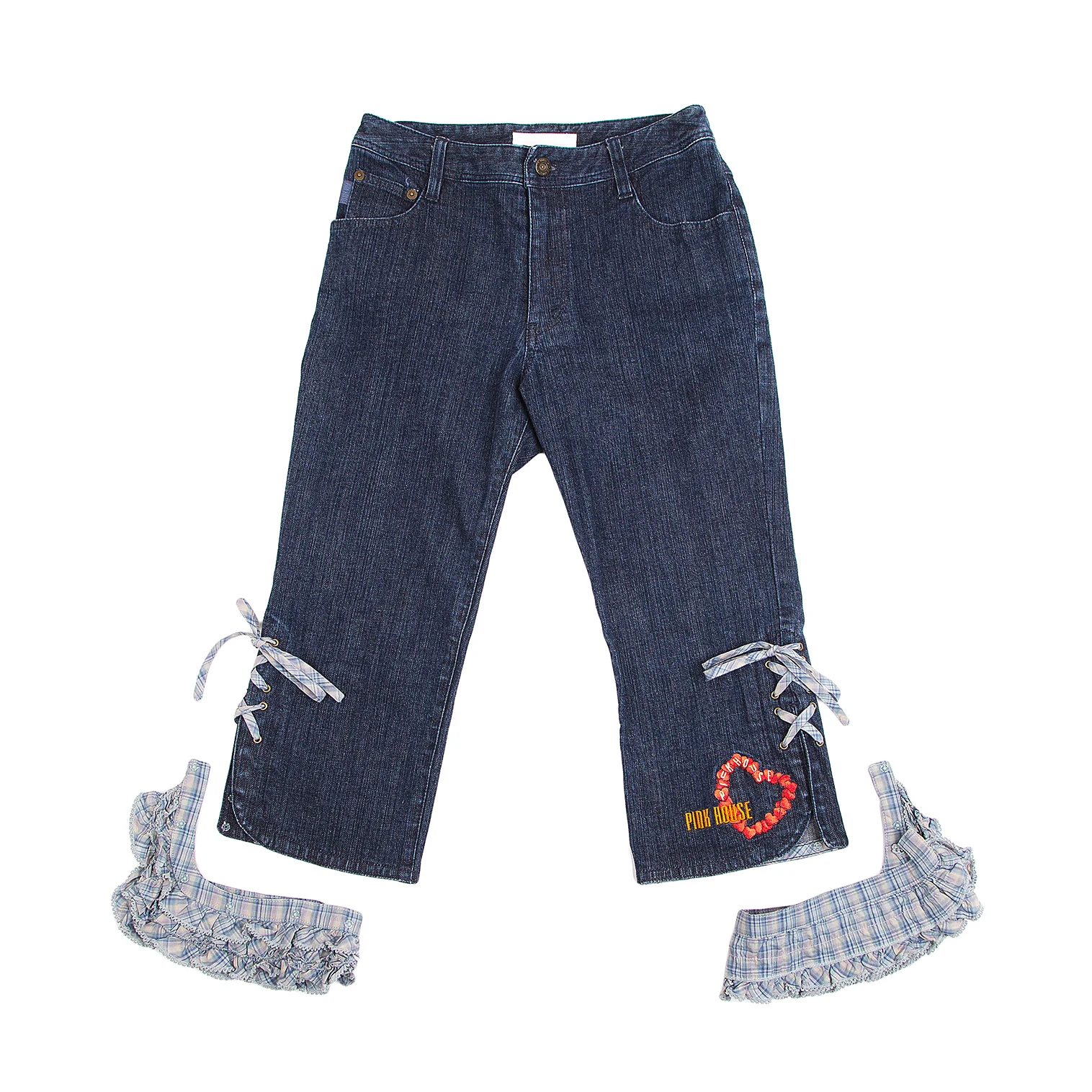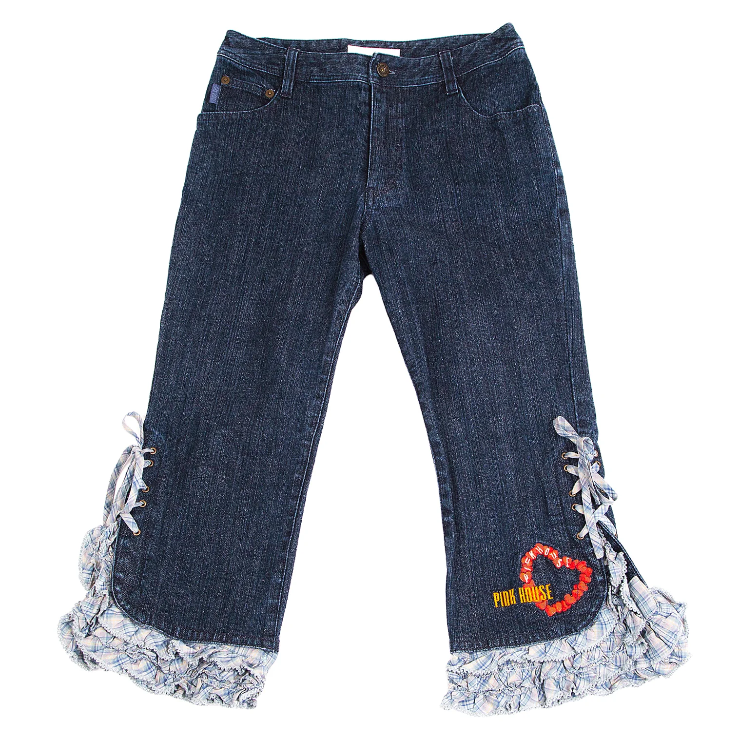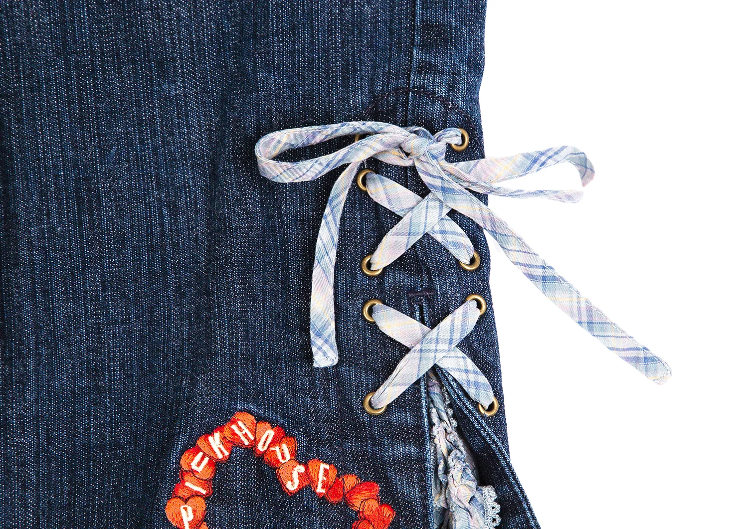 ピンクハウスPINK HOUSE ロゴ刺繍裾フリルレースアップクロップドデニムパンツ インディゴM