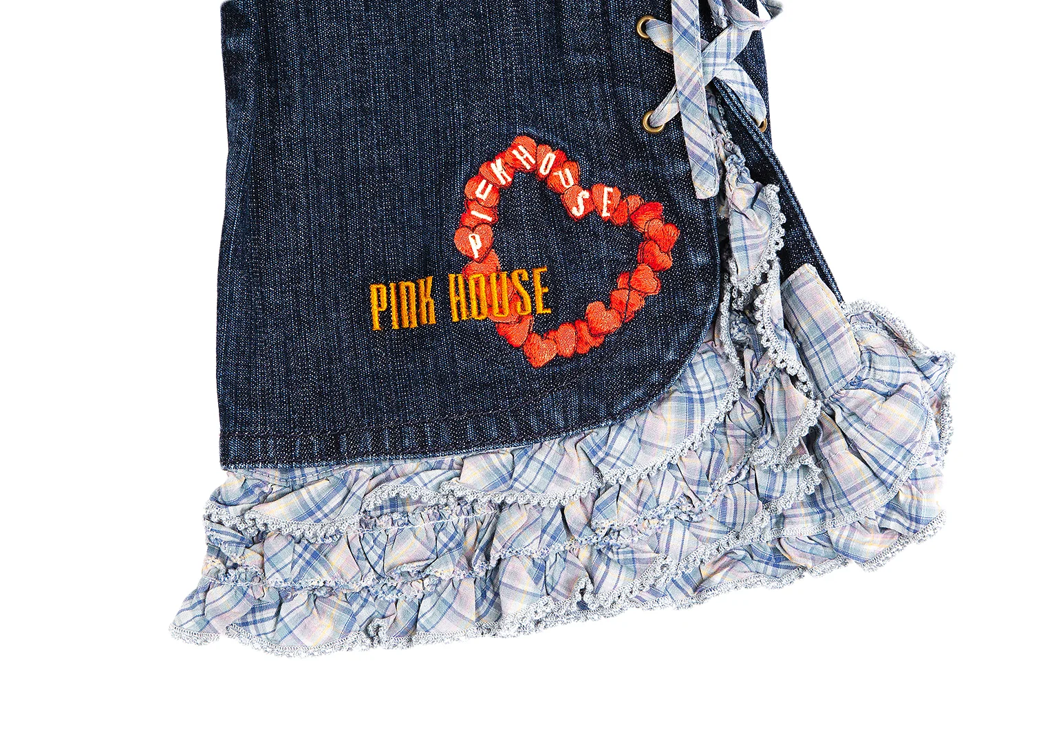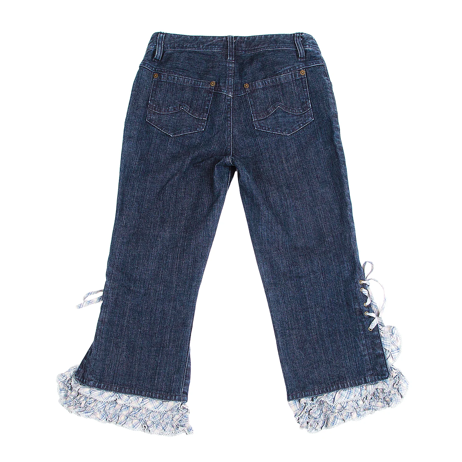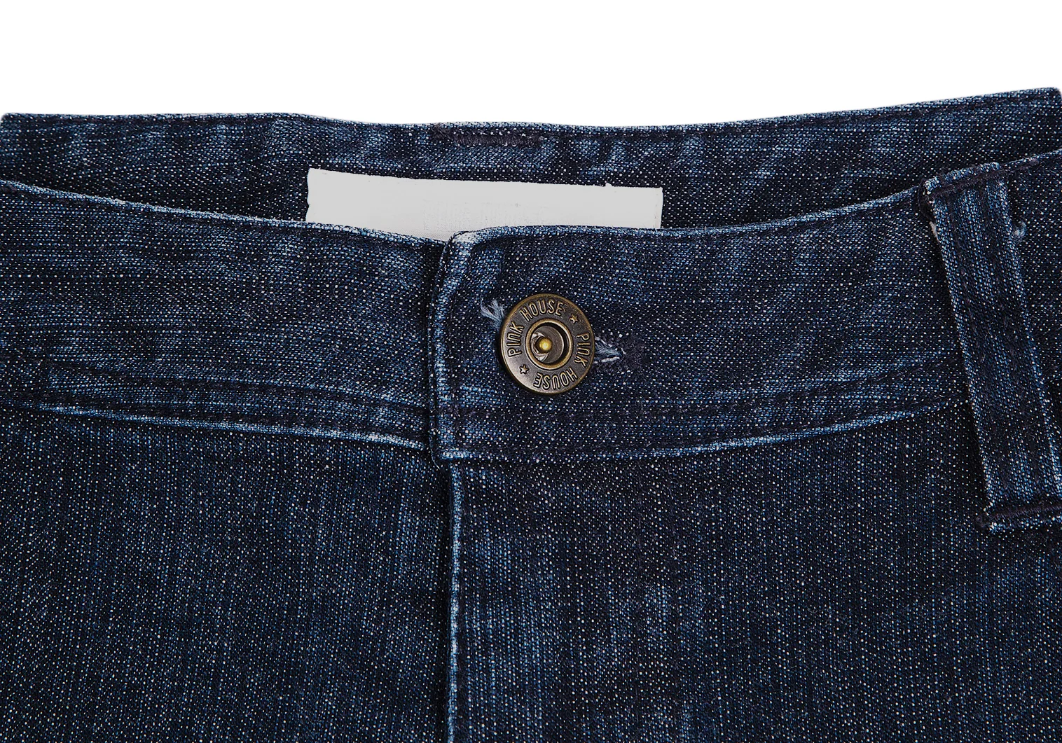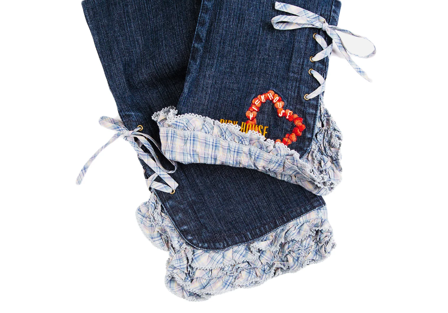 ピンクハウスPINK HOUSE ロゴ刺繍裾フリルレースアップクロップドデニムパンツ インディゴM