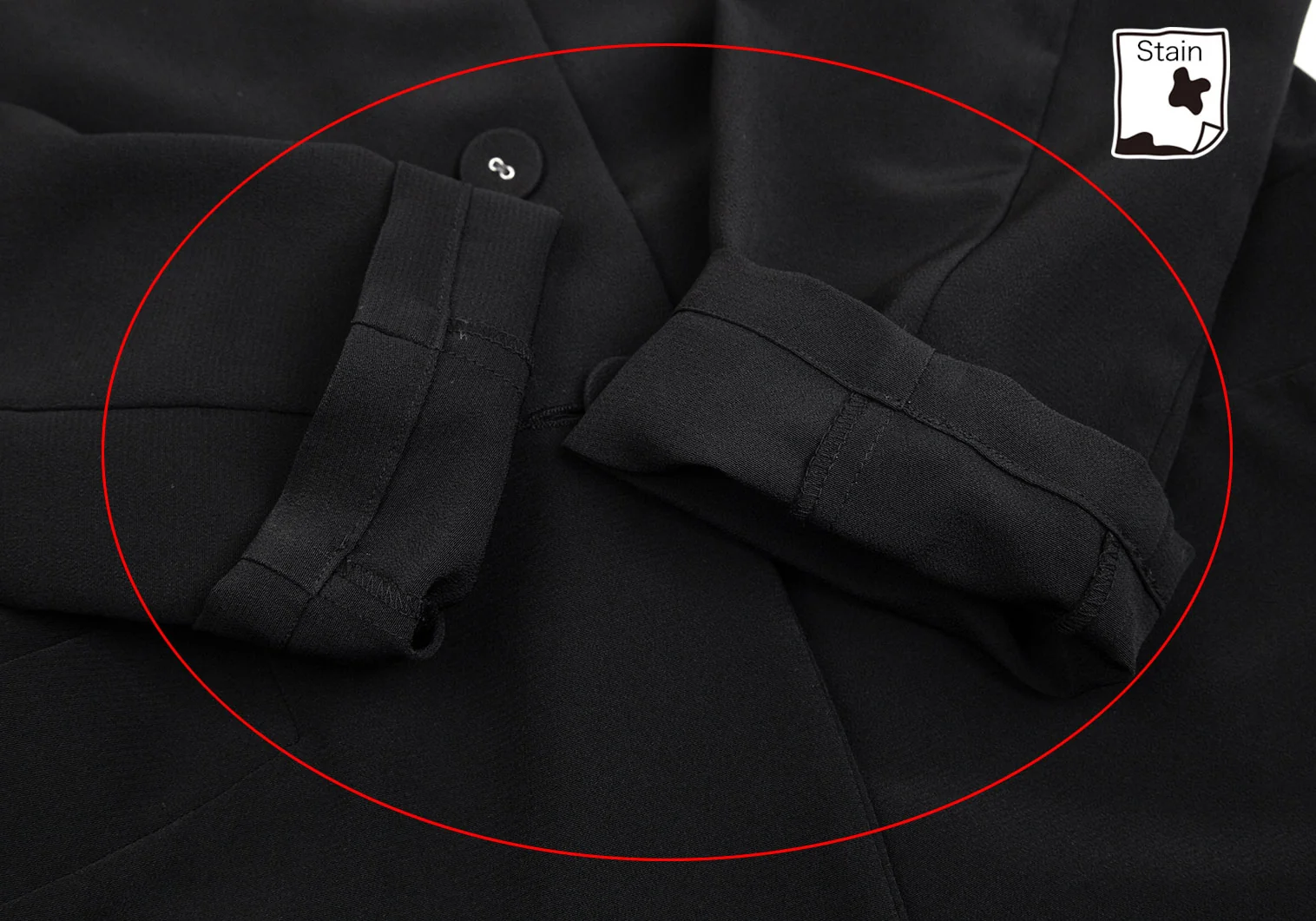 薄手の肩パッドあり。袖先に汚れがあります(写真参照)。その他に目立ったシミ、汚れ、ほつれ等なくいい状態です。クリーニング済み