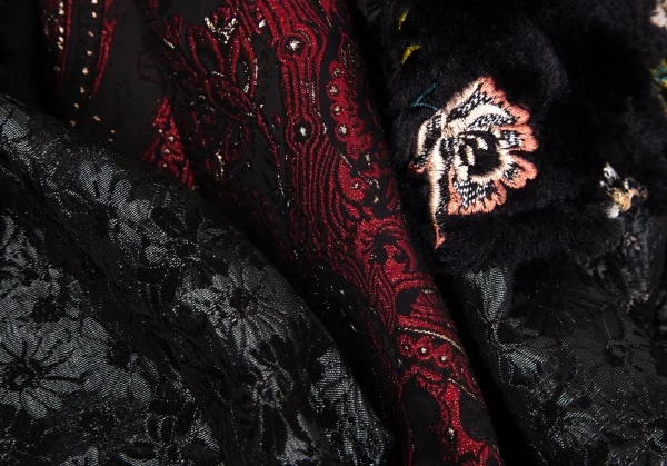 ポリエステル100% 別布(1) ポリエステル100% (2)アセテート53% アクリル27% ポリエステル20% (3)アセテート50% ポリエステル30% ナイロン20% (4)絹100% 刺繍部分 絹100% 裏地 キュプラ100%