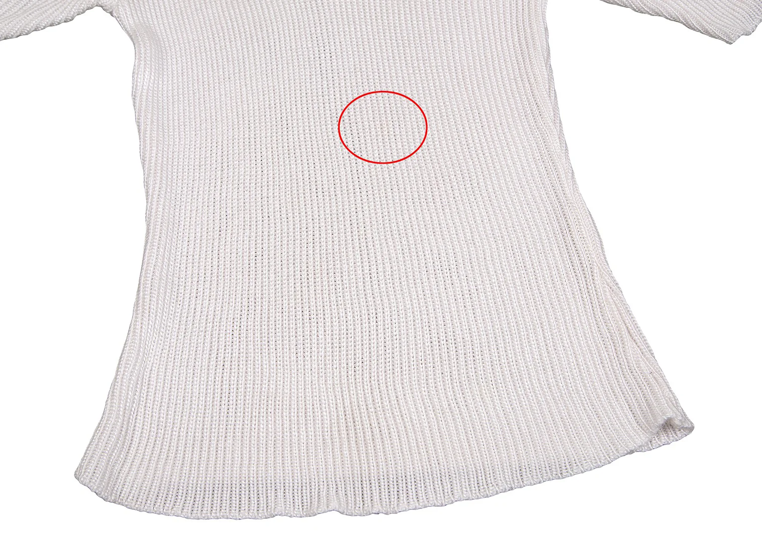 透け感があります。前身頃に薄シミがあります(写真参照)その他目立ったシミ、汚れ、ほつれ等なくいい状態です。クリーニング済み