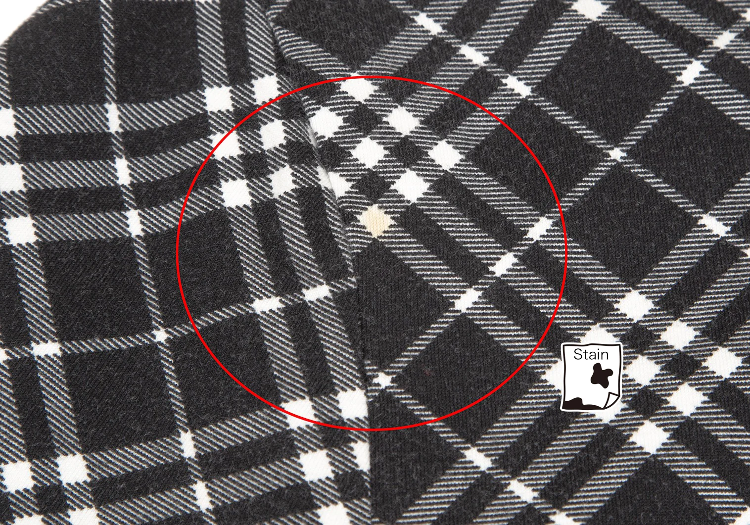 全体的に少し毛羽立ちあり、右脇にシミがあります(画像参照)。その他目立ったシミ、汚れ、ほつれ等ありません。クリーニング済み