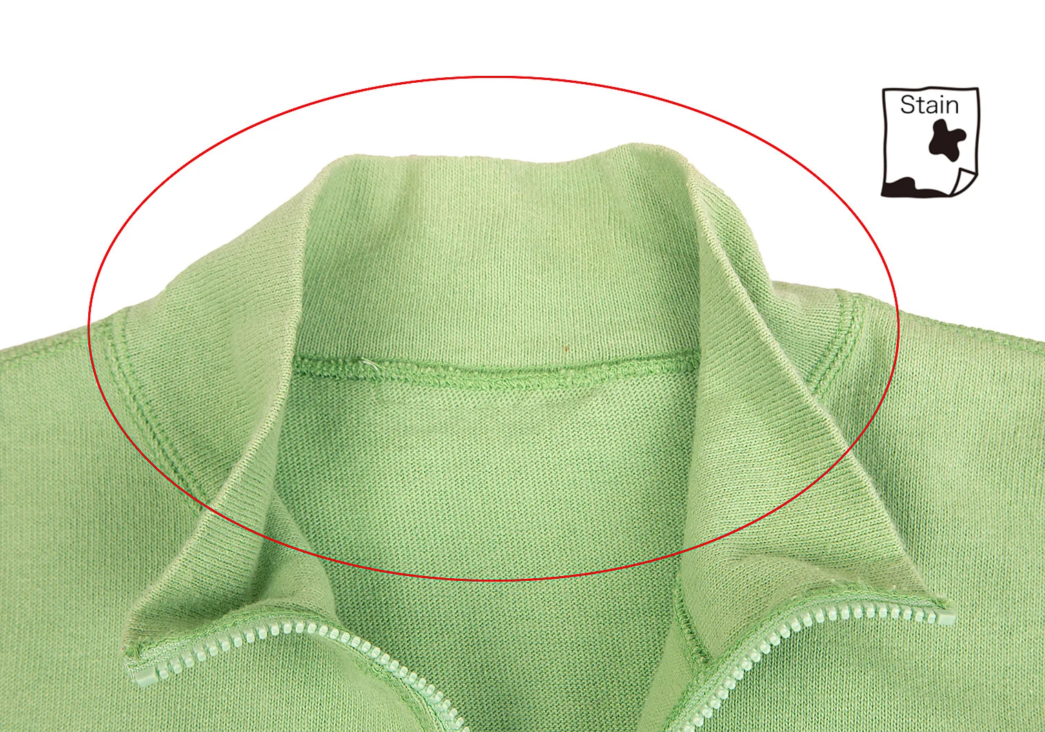 全体的に毛羽立ちと着用感があり、首周りに薄シミがあります(画像参照)。その他目立ったシミ、汚れ、ほつれ等ありません。クリーニング済み