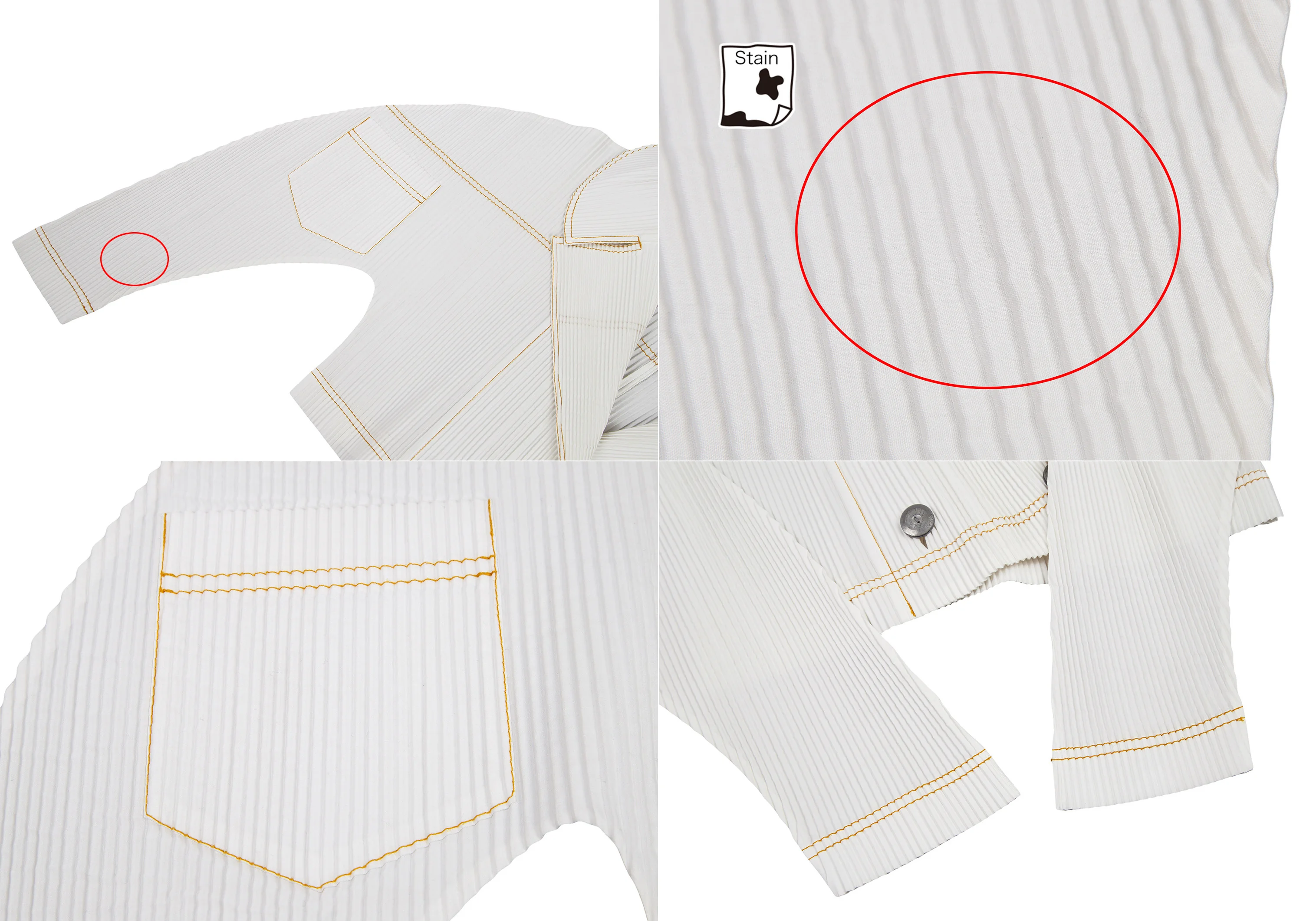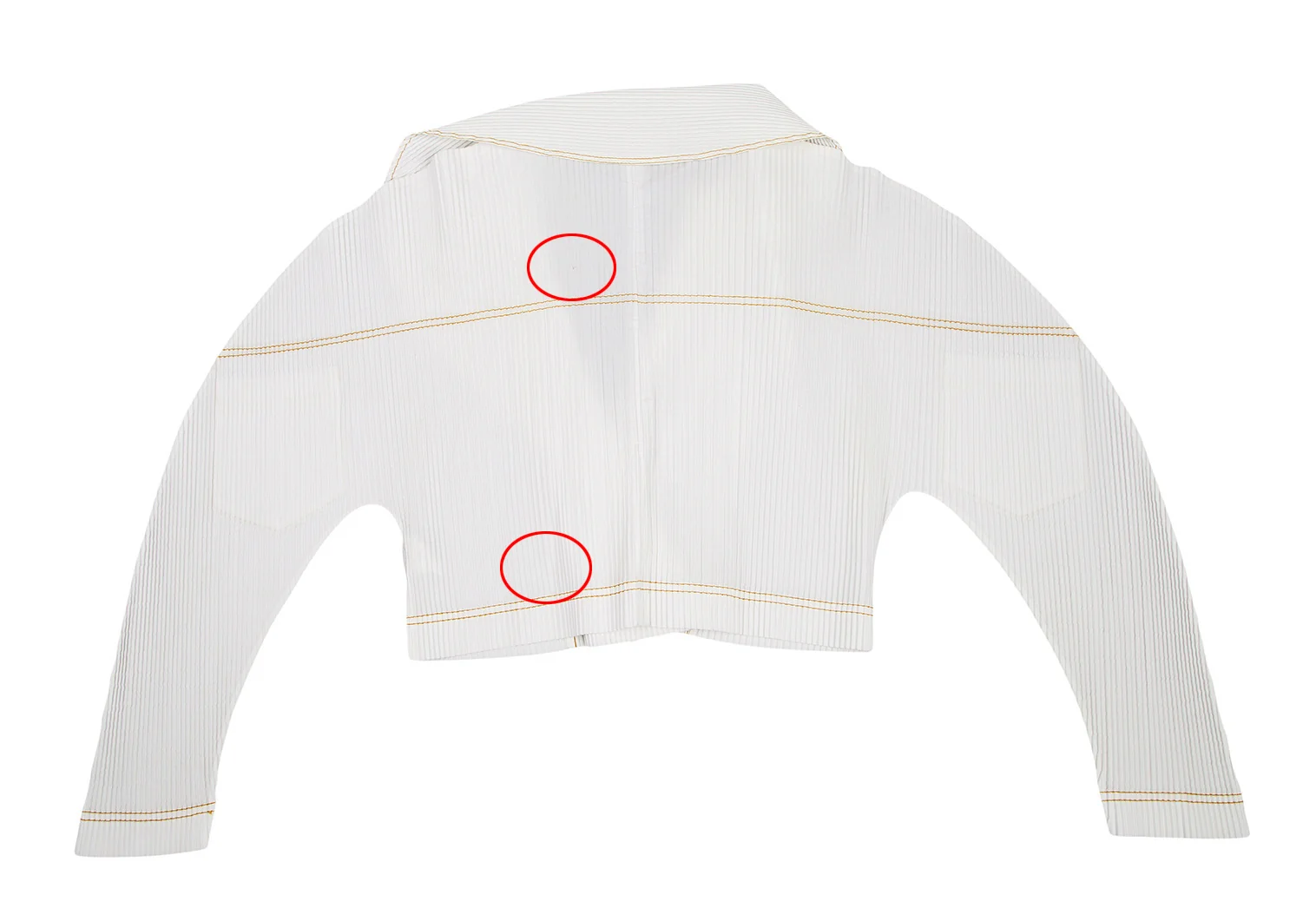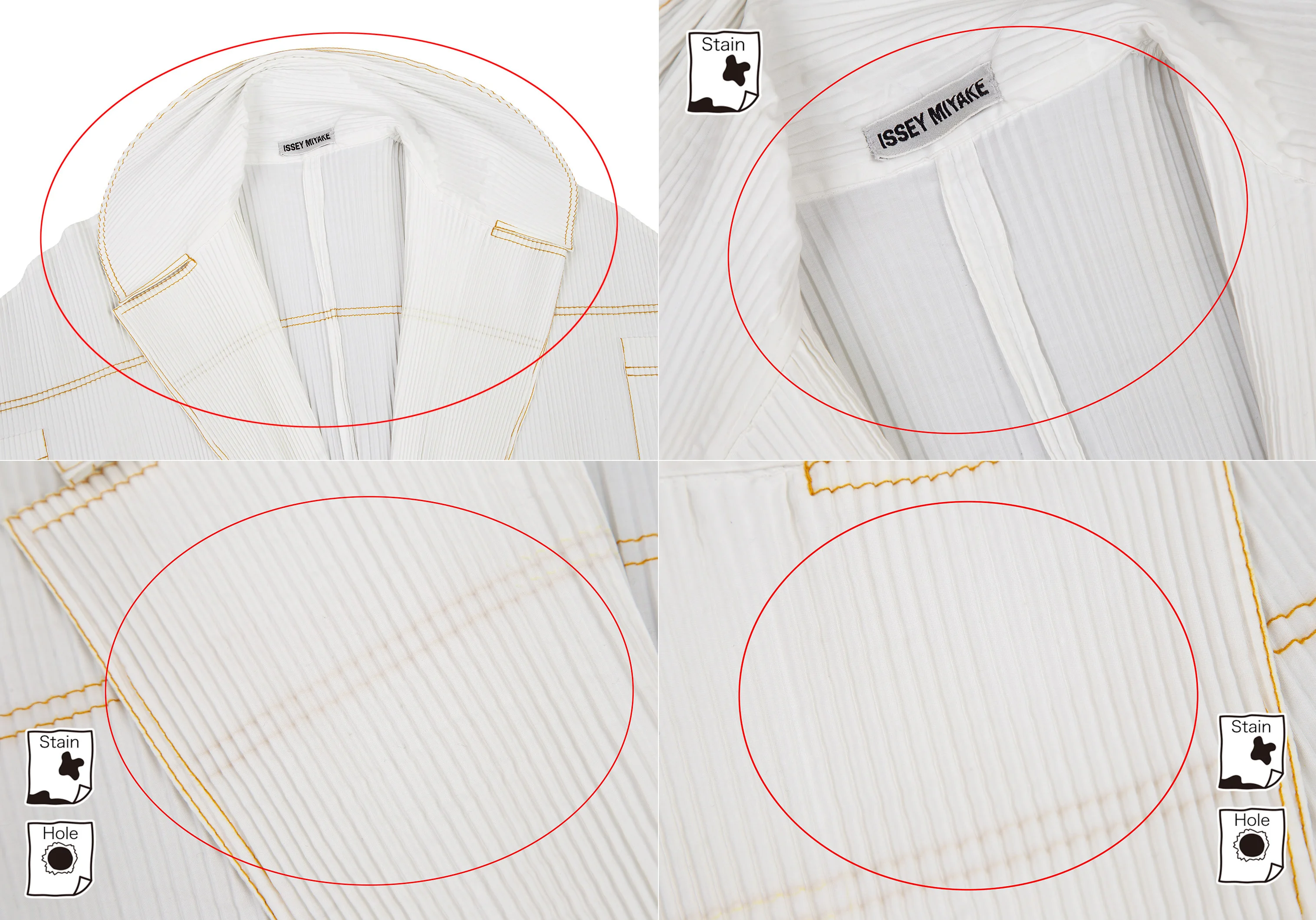 透け感のある生地です。襟・襟裏・右袖・裾・袖口・後ろ身頃に薄汚れ、襟・後ろ身頃に針穴があります(写真参照)。クリーニング済み