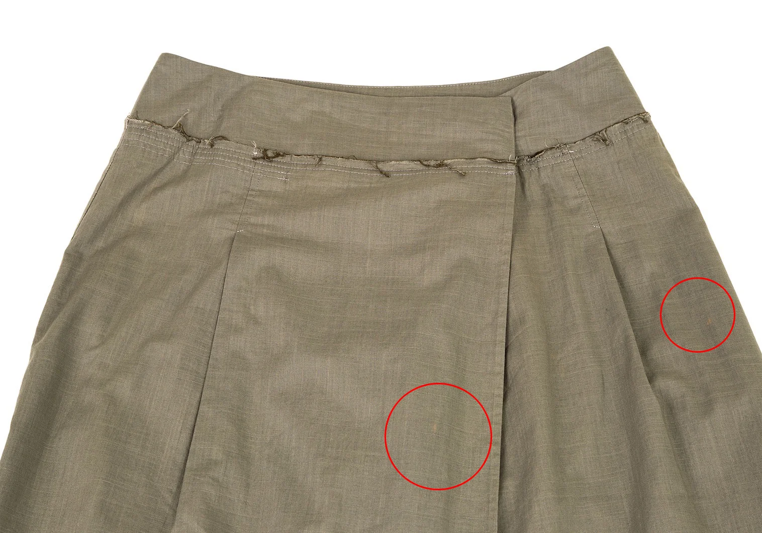 ウエスト裏に薄シミ、前に変色があります(写真参照)。その他に目立ったシミ、汚れ、ほつれ等はありません。クリーニング済み