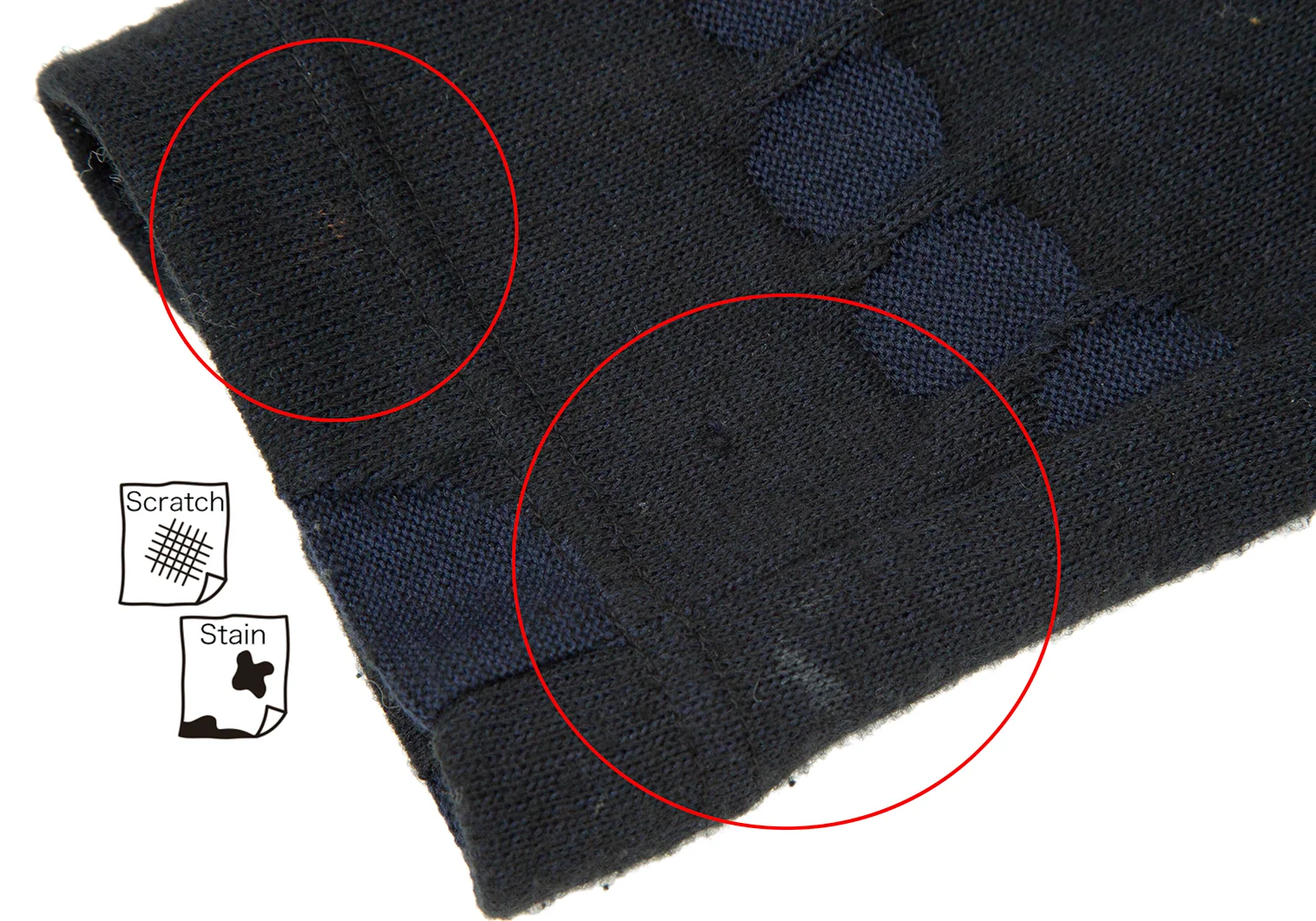 少し透け感のある生地です。前右袖、後ろ左袖に引っ掛け・薄汚れがあります(画像参照)。その他目立ったシミ、汚れ、ほつれ等ありません。クリーニング済み