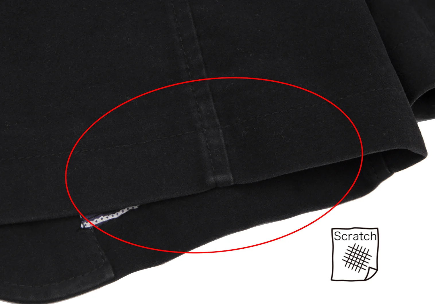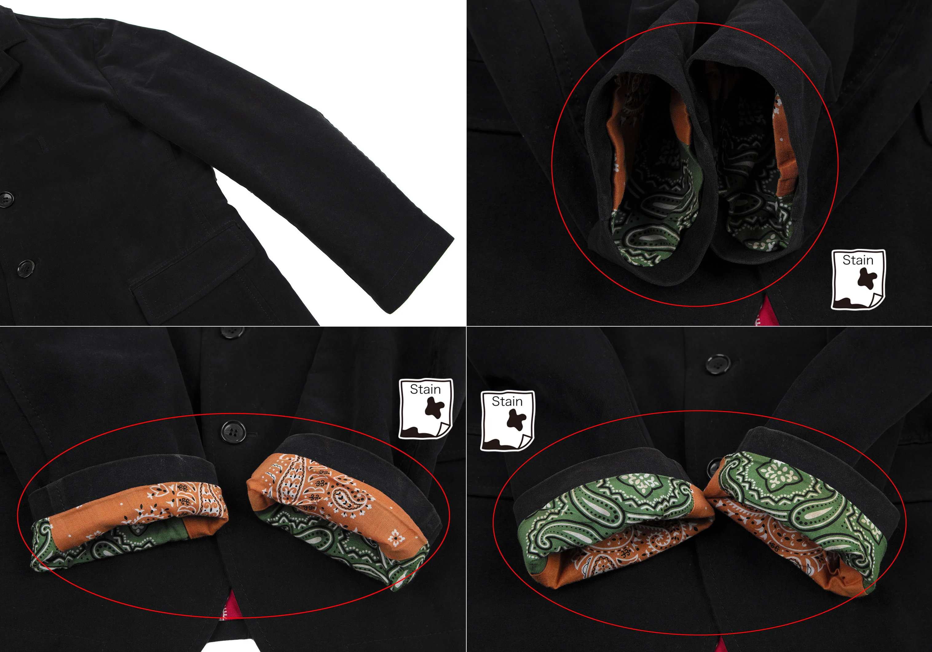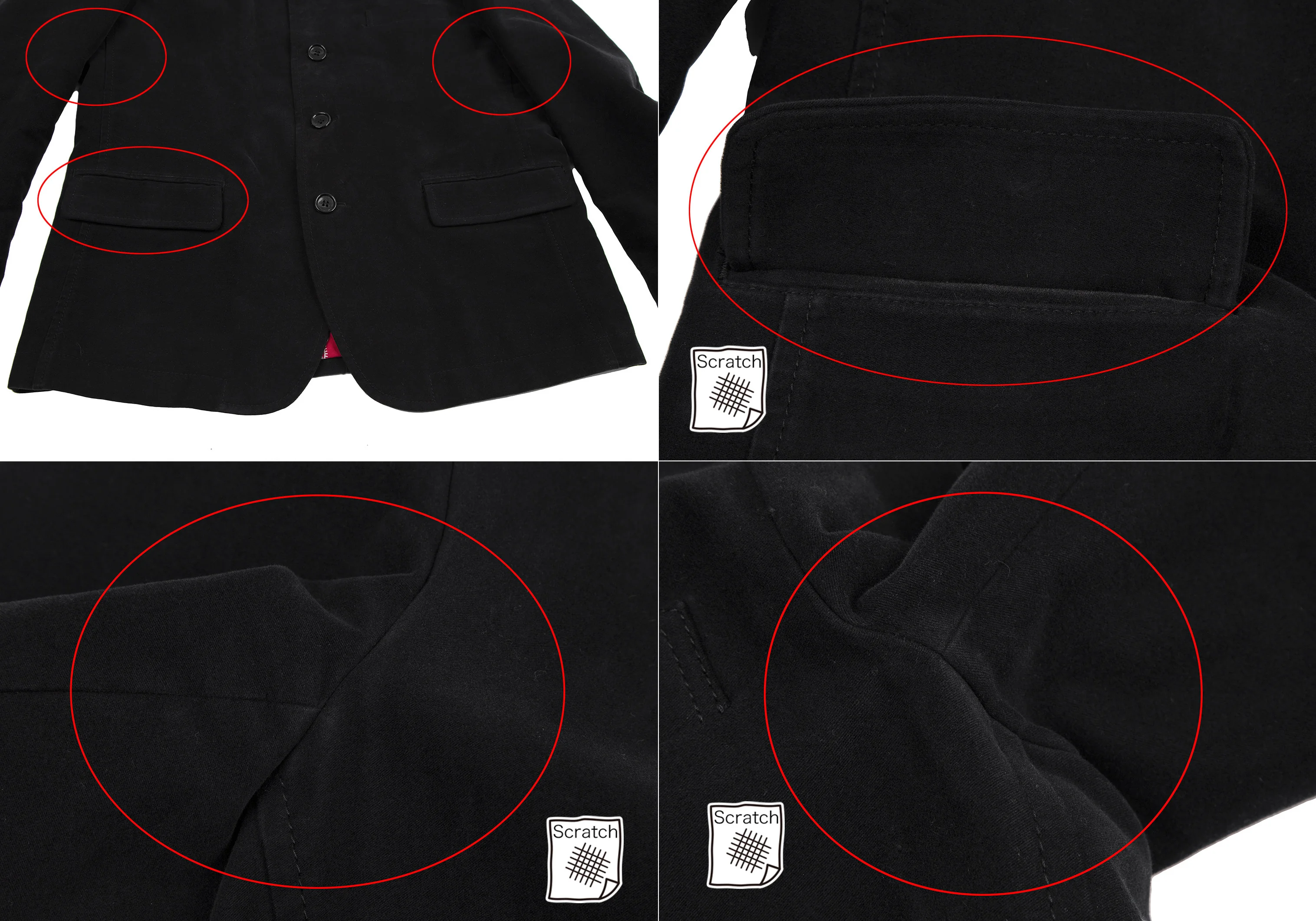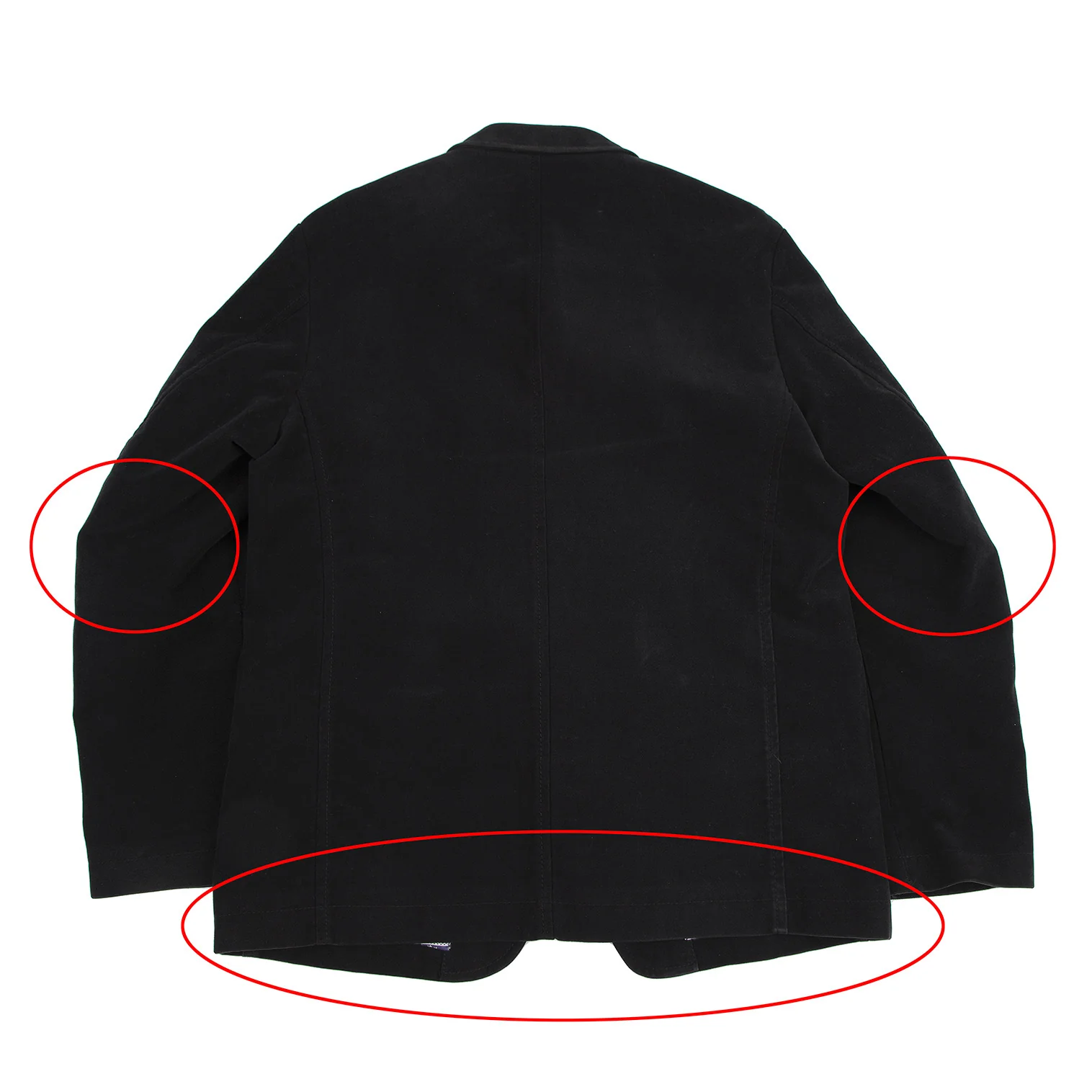 襟裏に変色しみ、袖先・袖裏に汚れ、右ポケット口・脇下・後ろ肘・裾にスレ、脇裏地・裾裏地にシミがあります(写真参照)。クリーニング済み
