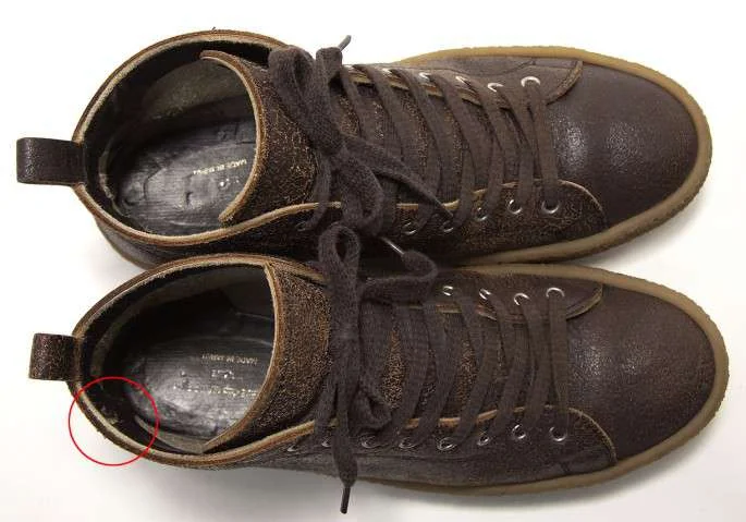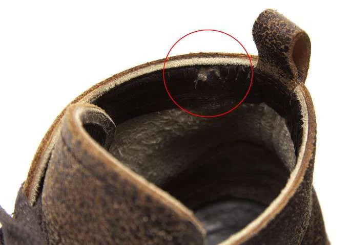 右足履き口部分後にダメージあり。両足内側かかとにレザーの剥がれあり(写真参照)。少々かかとの減りあり。