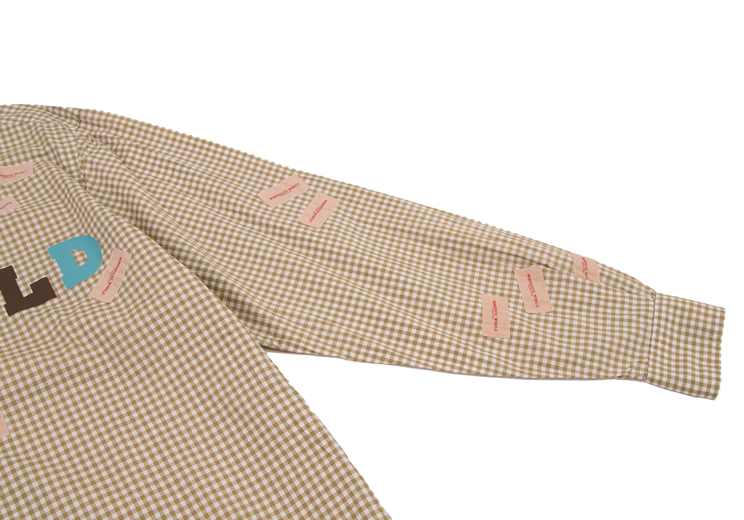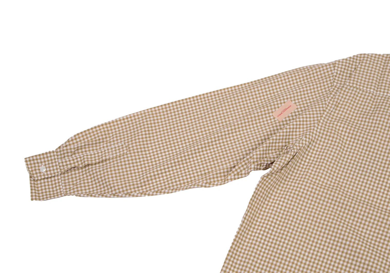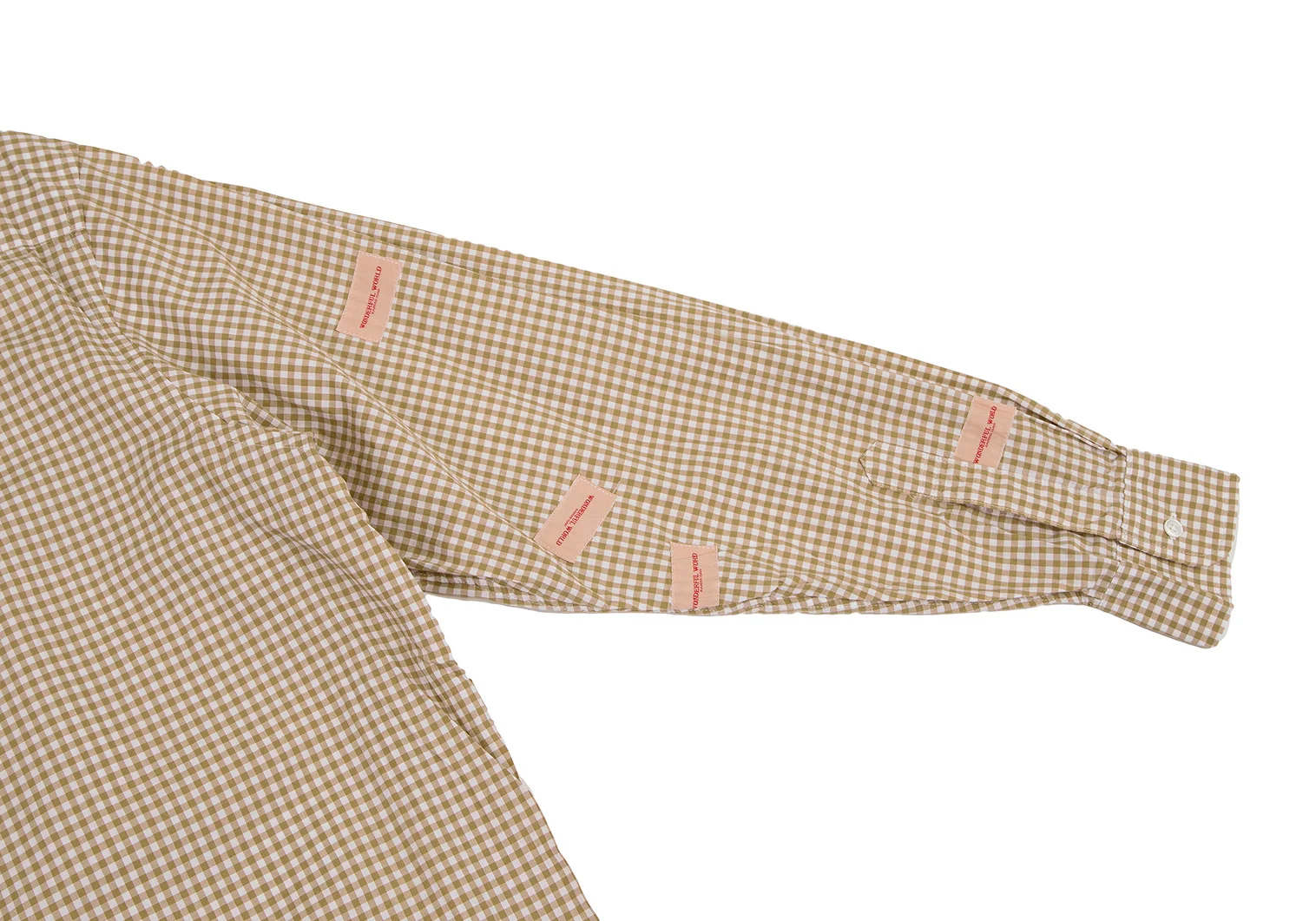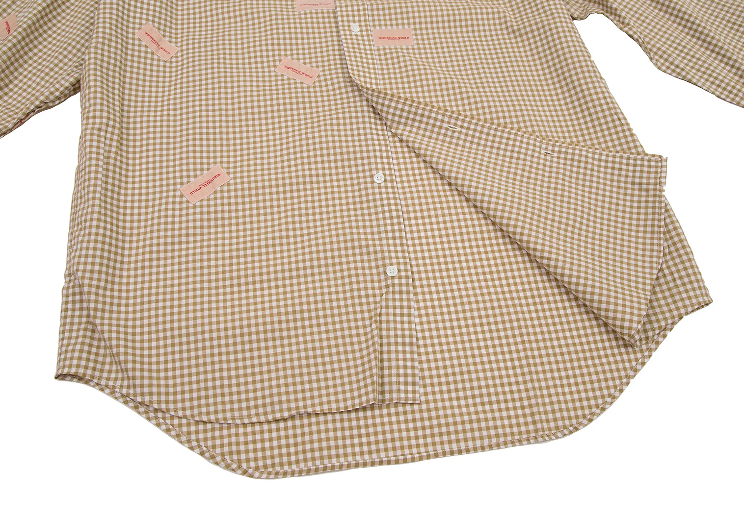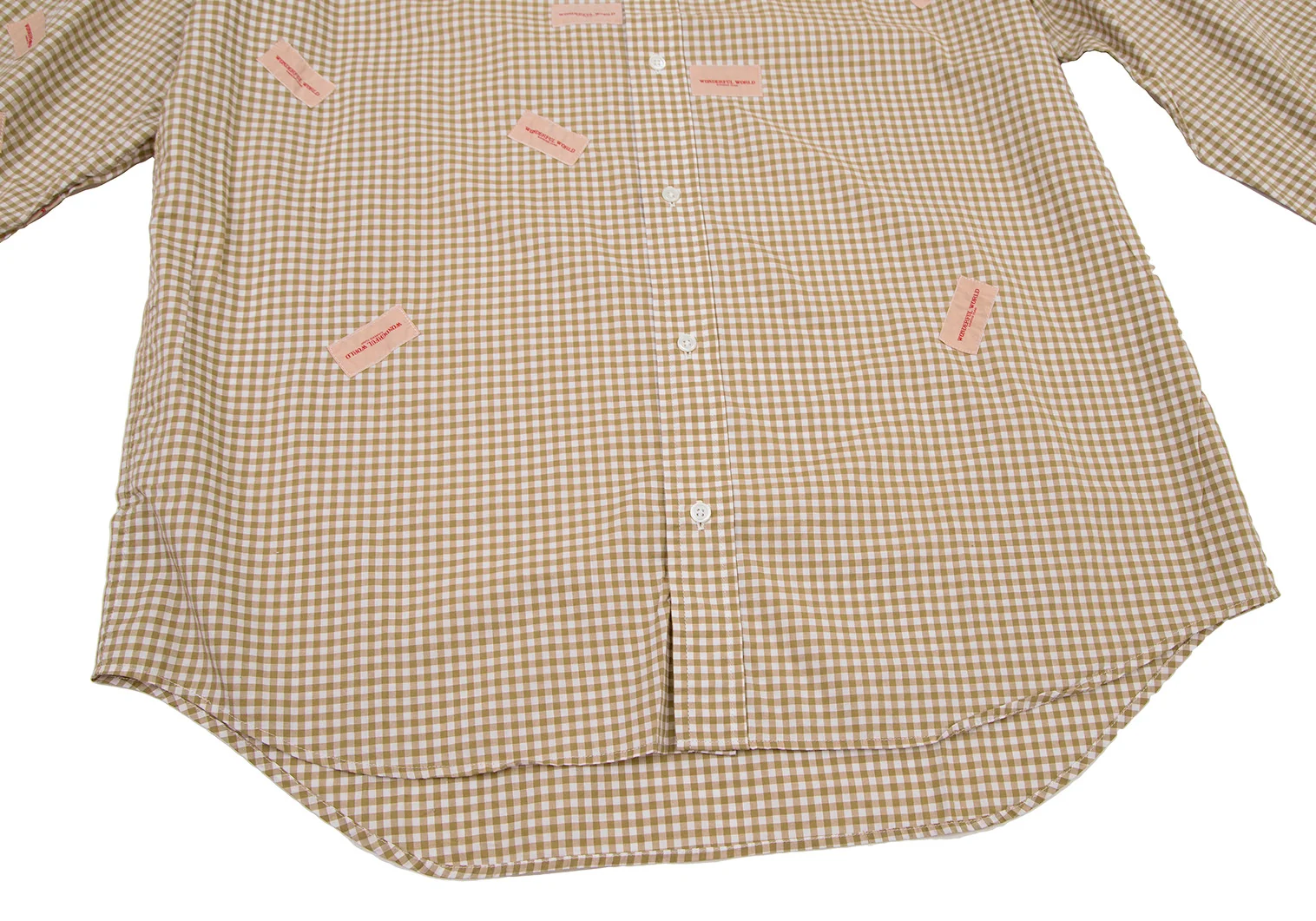 ワンダフルワールド カネコイサオWONDERFUL WORLD KANEKO ISAO ロゴパッチプリントギンガムチェック長袖シャツ 白モカM位