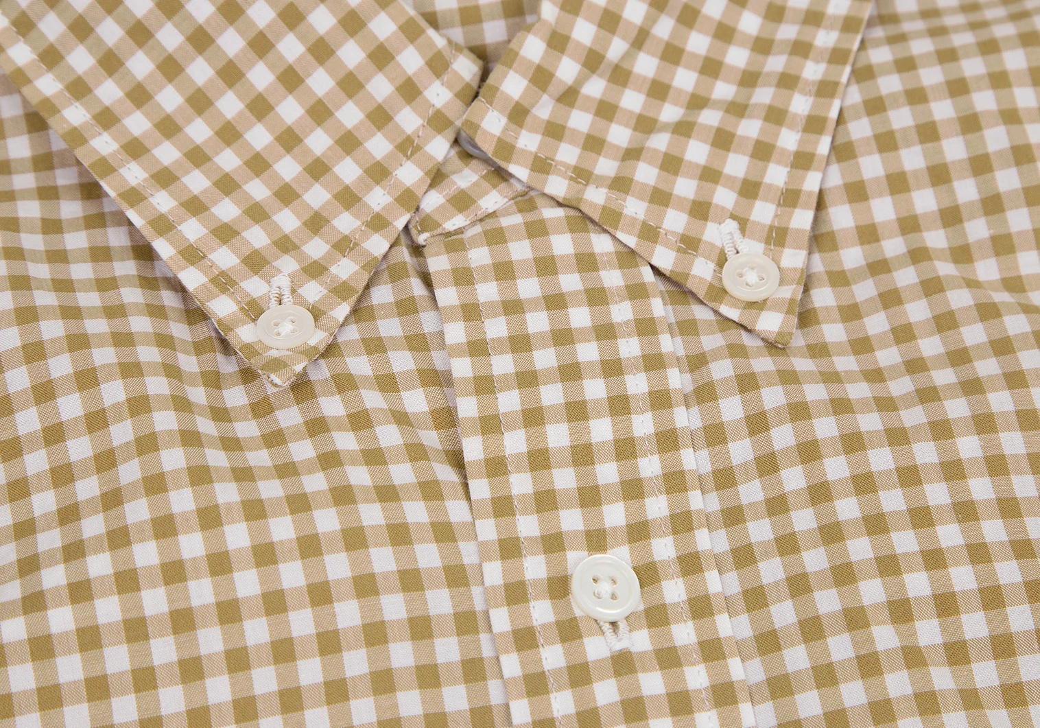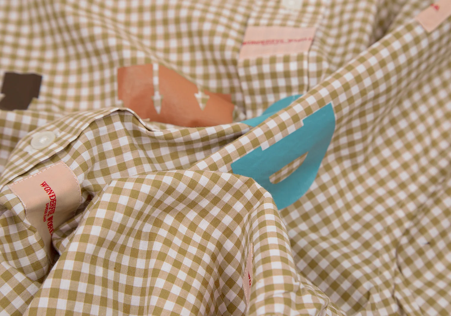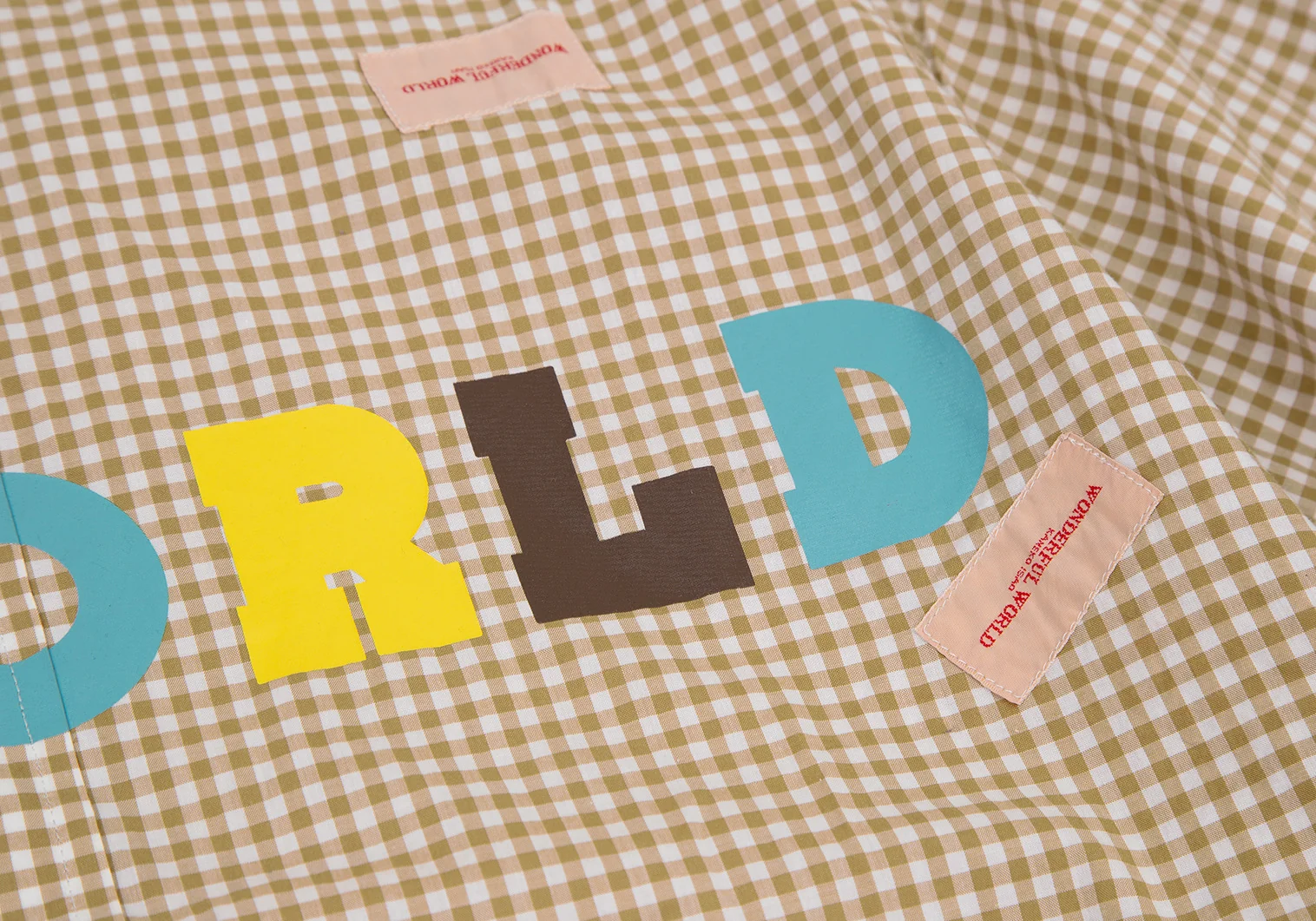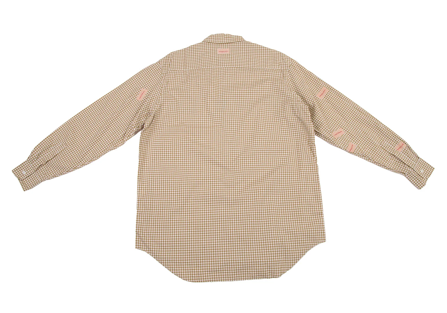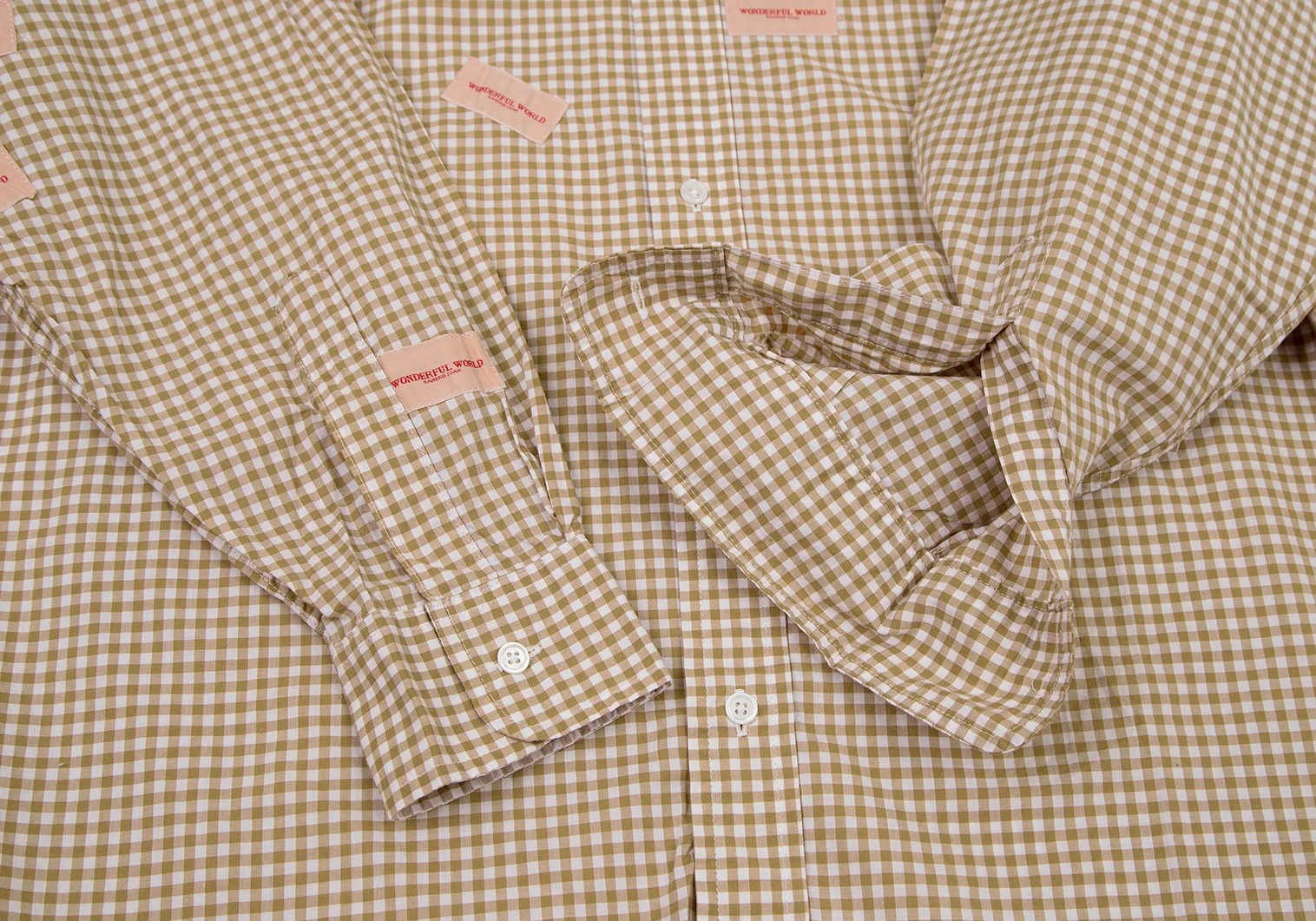 ワンダフルワールド カネコイサオWONDERFUL WORLD KANEKO ISAO ロゴパッチプリントギンガムチェック長袖シャツ 白モカM位