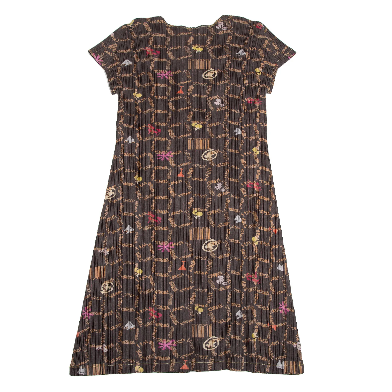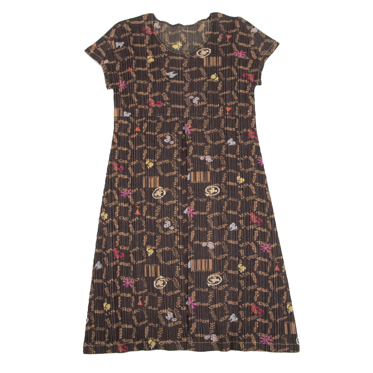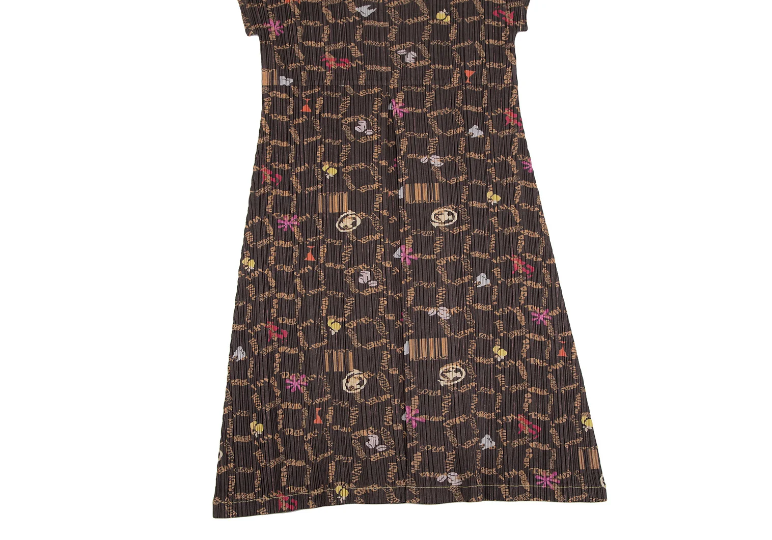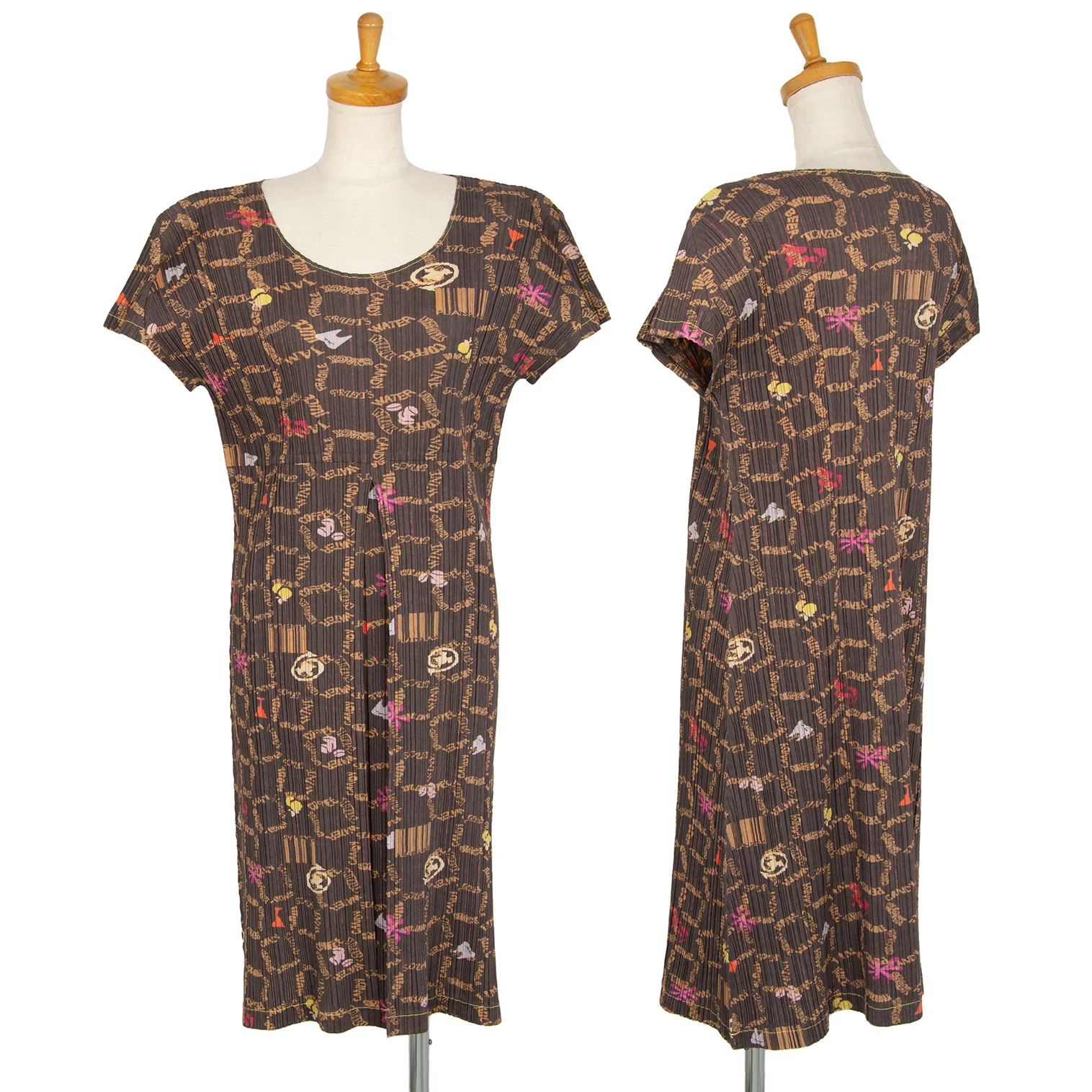 プリーツプリーズPLEATS PLEASE コットンポリプリーツ総柄半袖ワンピース 茶5