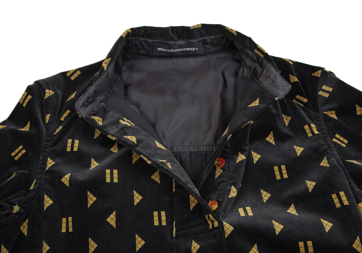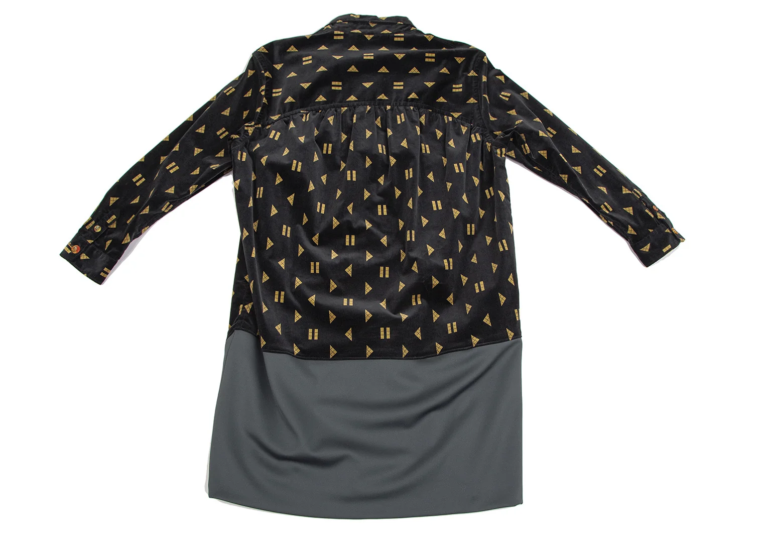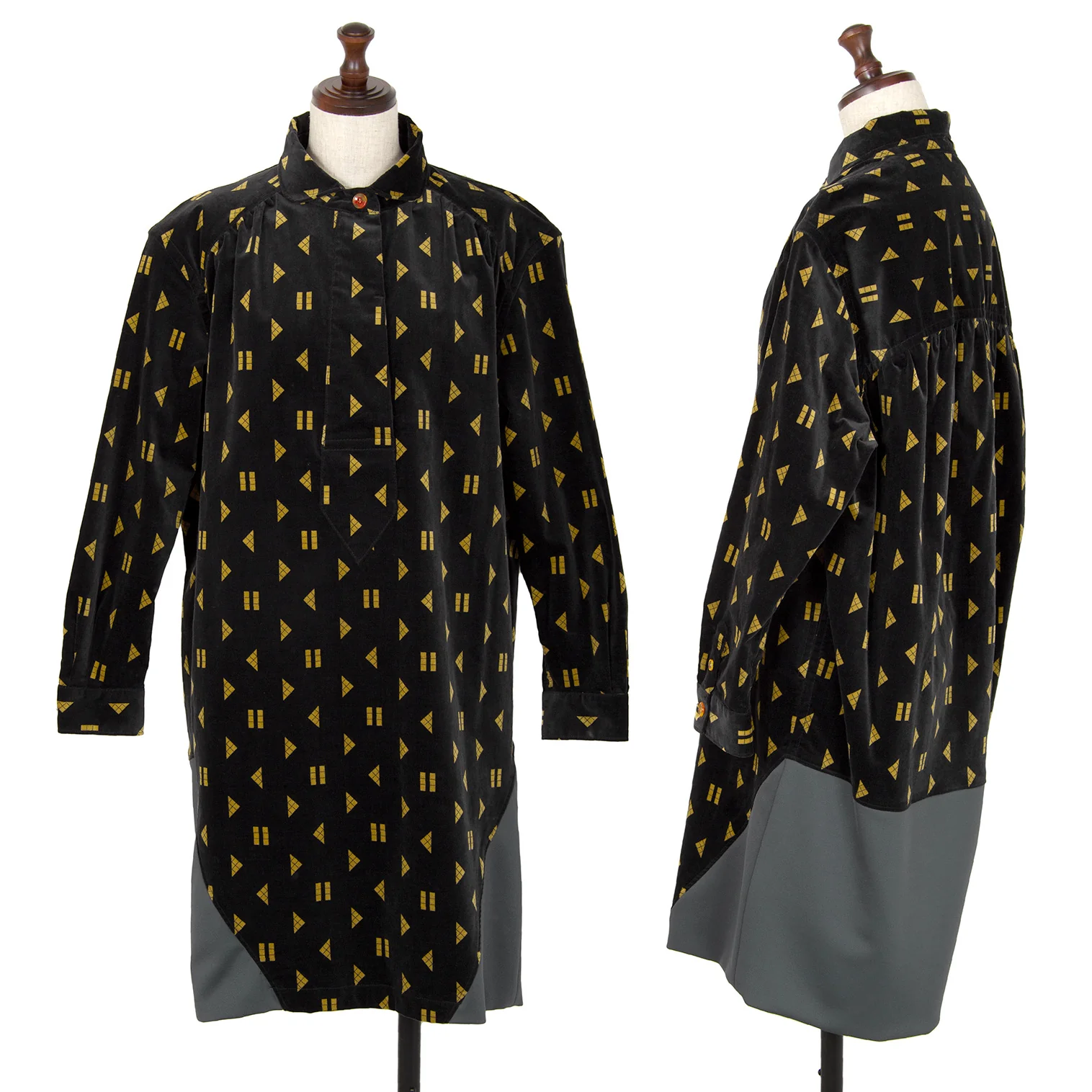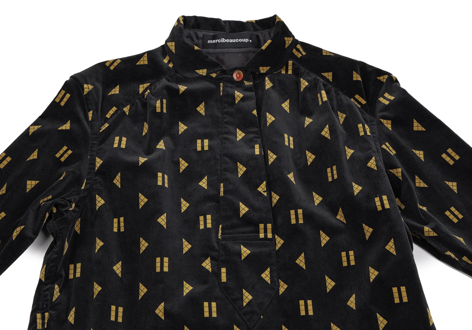 メルシーボークーmercibeaucoup シェイププリントベロア切替プルオーバーシャツワンピース 黒1