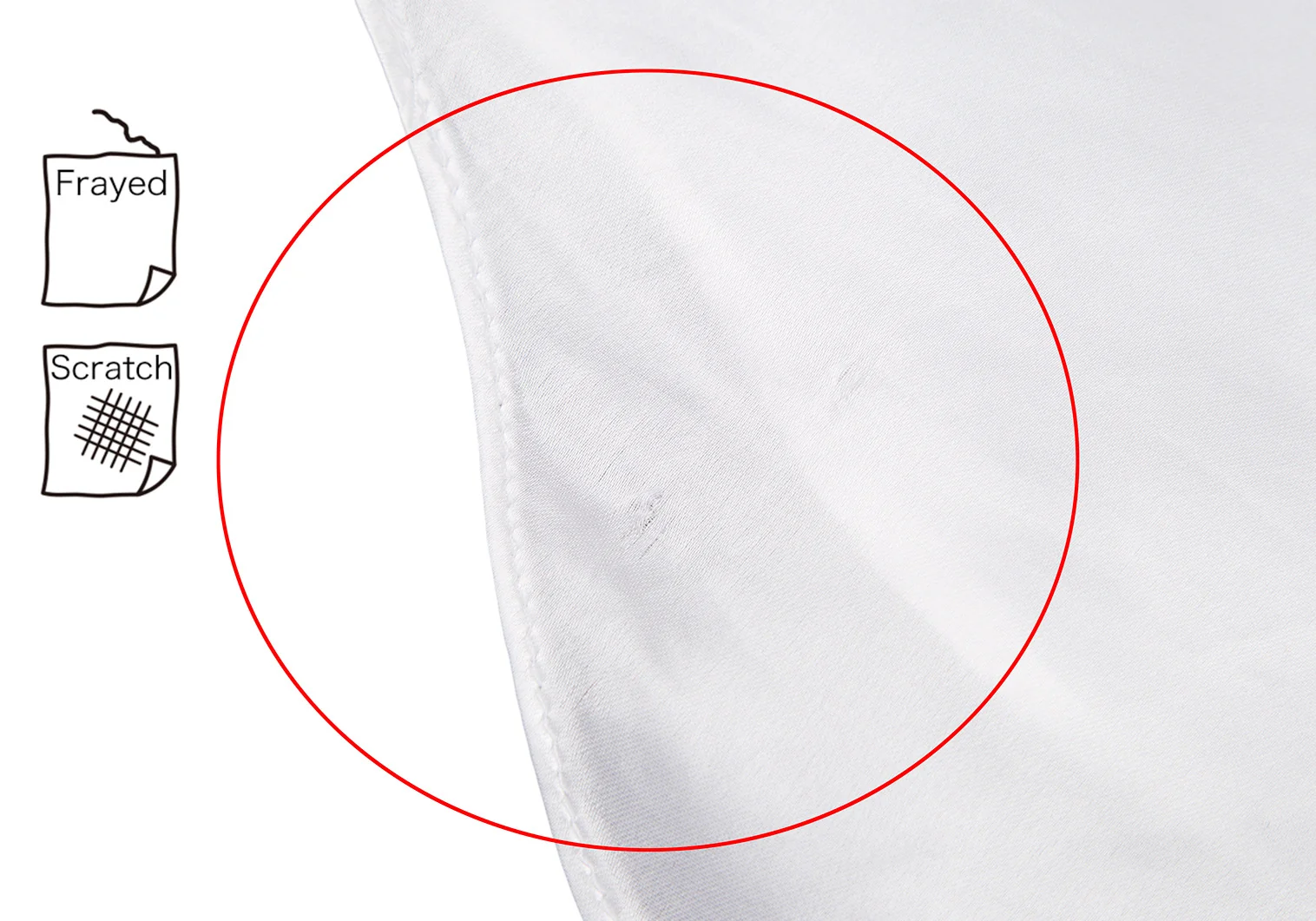 透け感のある生地です。前見頃に引っかけ、前右袖・ストール部分に生地のヨレ、後ろ裾裏・ストール部分・首周りにシミ、ストール首元に薄汚れ・糸引き、後ろ身頃に引っかけ・糸引き・スレがあります(写真参照)。その他目立った汚れ等ない状態です。クリーニング済み