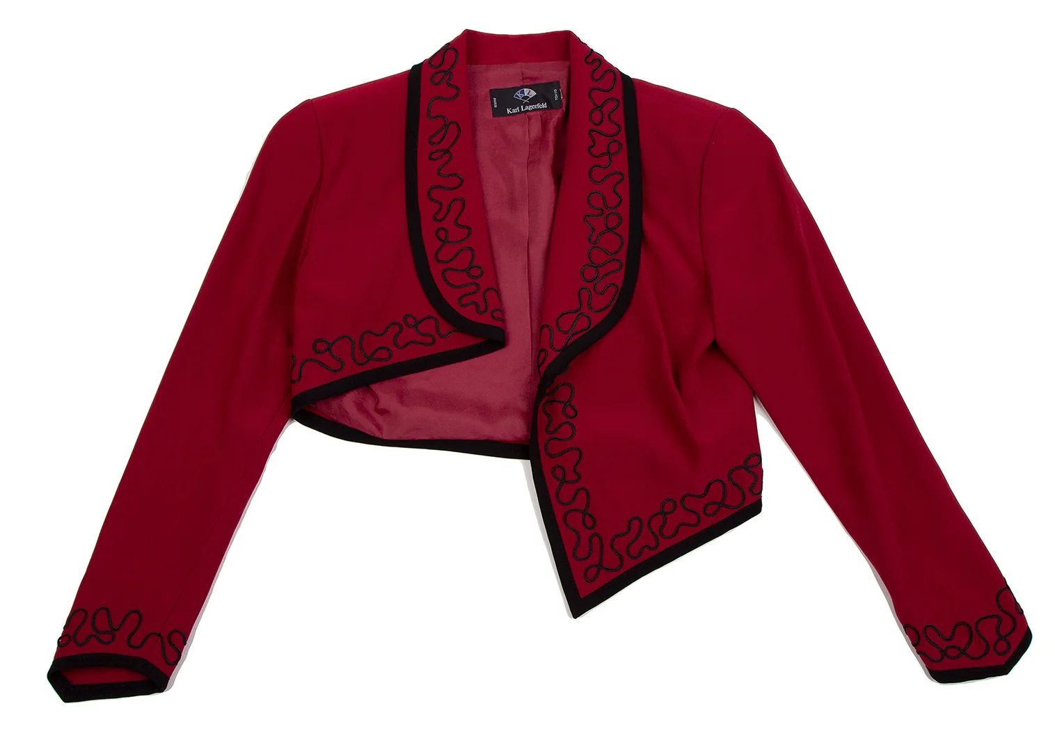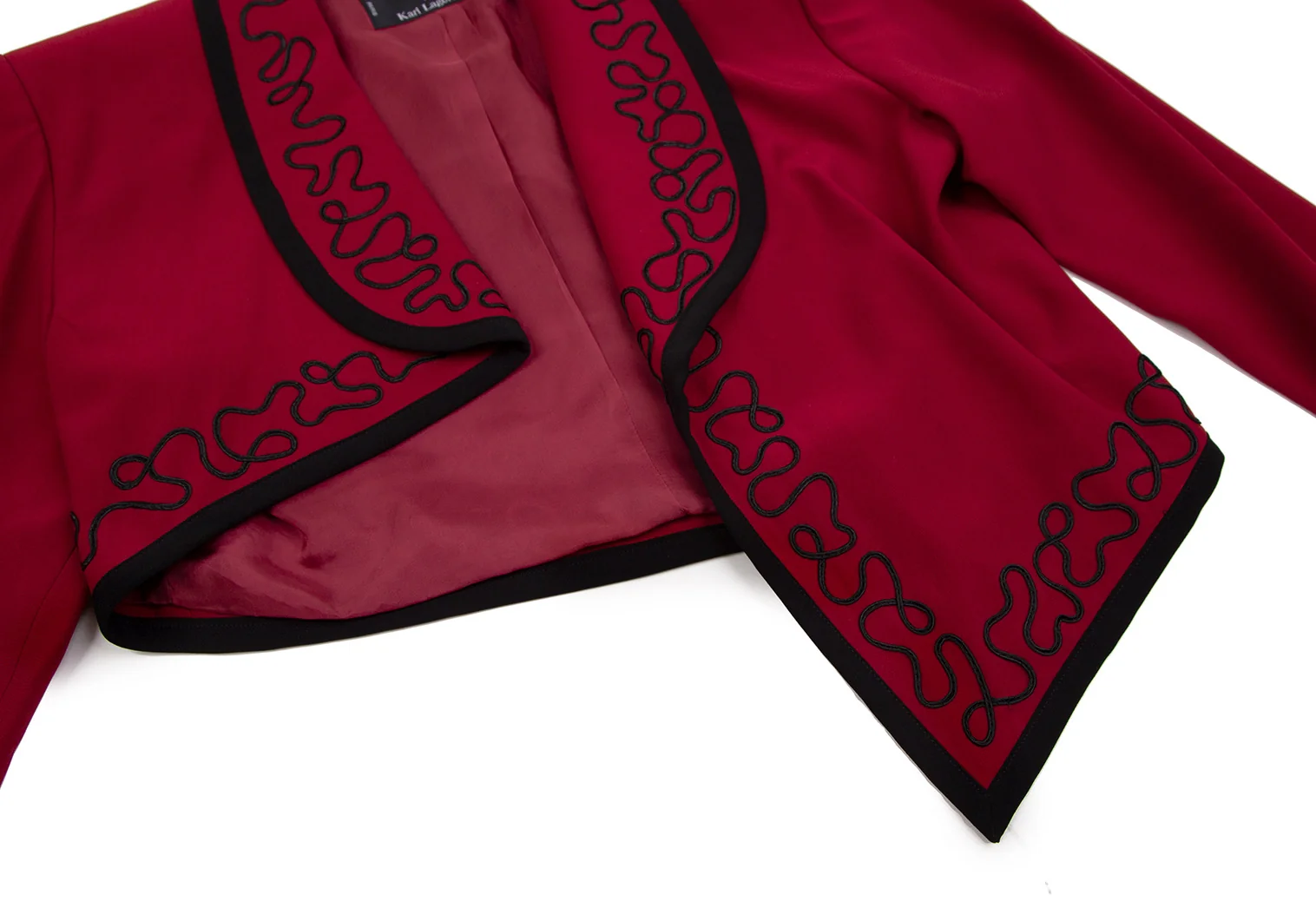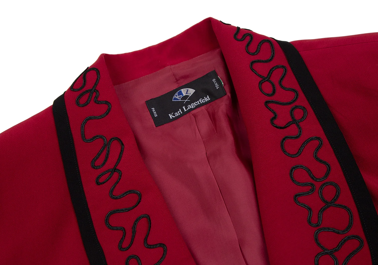 カールラガーフェルドKARL LAGERFELD レーヨン混ショール刺繍パイピングアシンメトリーボタンレスジャケット 赤9AT