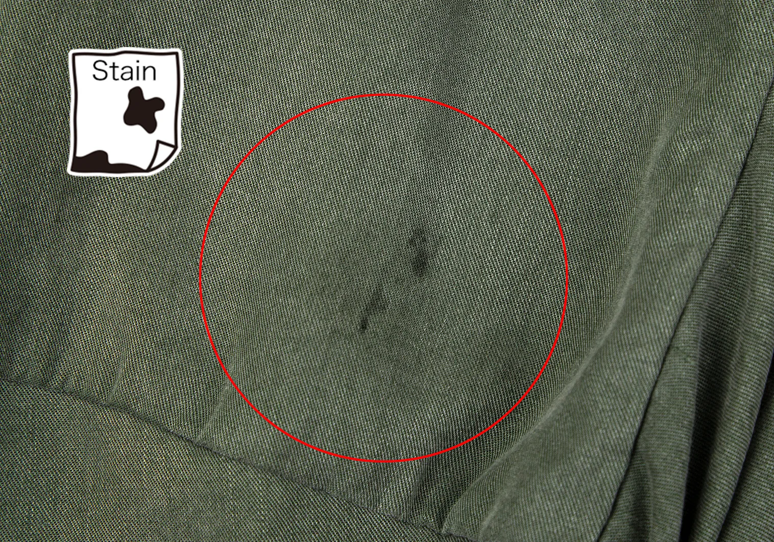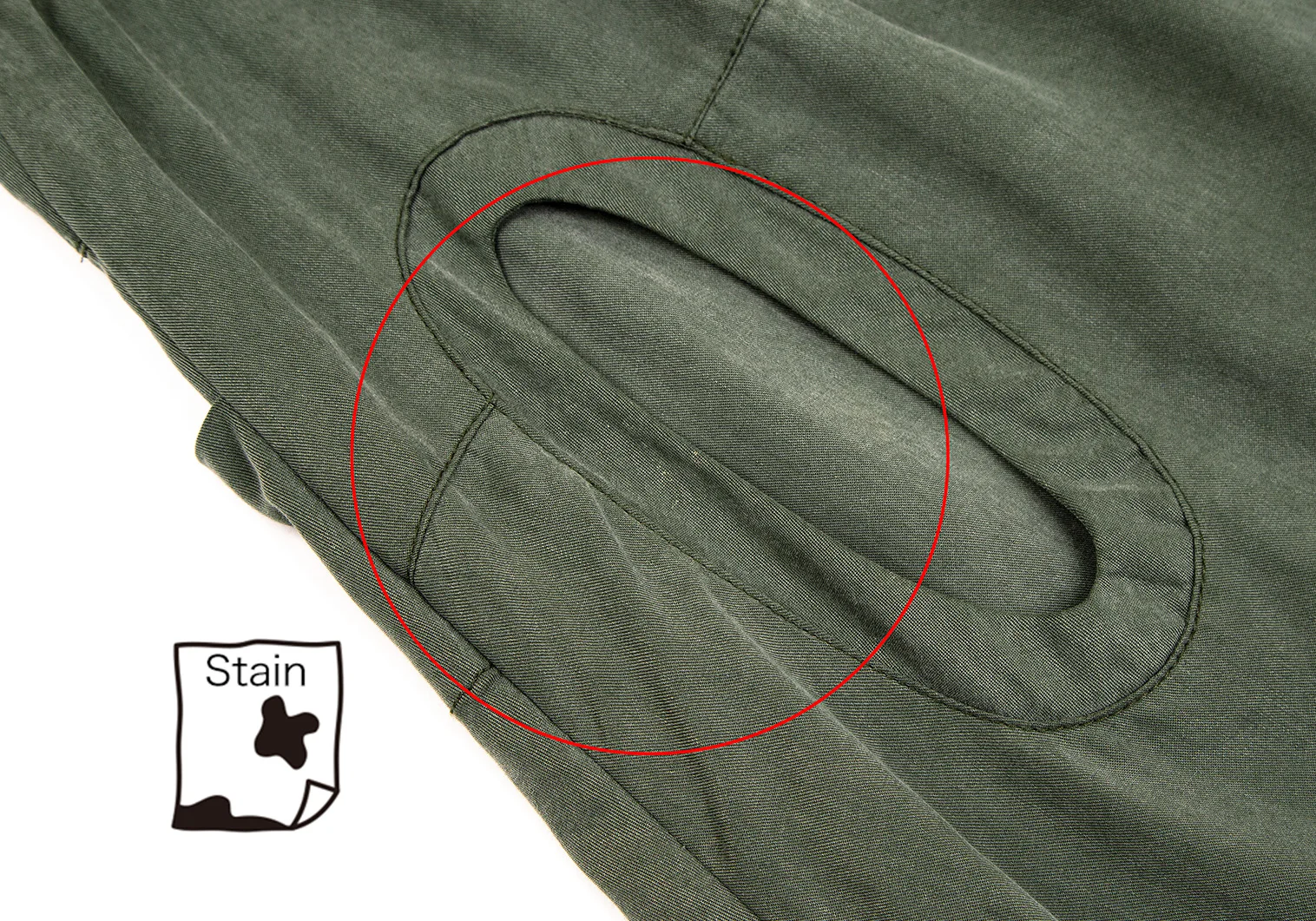 右ポケットに薄汚れ、前裾に小シミが数カ所あり、後ろ身頃にシミがあります。その他目立ったシミ、汚れ、ほつれ等はありません。クリーニング済み